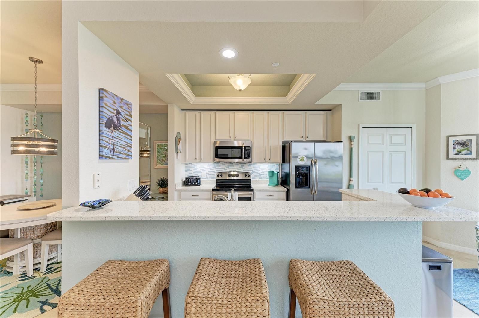 - Ceiling Fan(s), Crown Molding, Dry Bar, Eat-in Kitchen, Kitchen/Family Room Combo, Open Floorplan, Solid Surface Counters, Solid-Wood Cabinets, Tray Ceiling(s), Walk-In Closet(s), Window Treatments