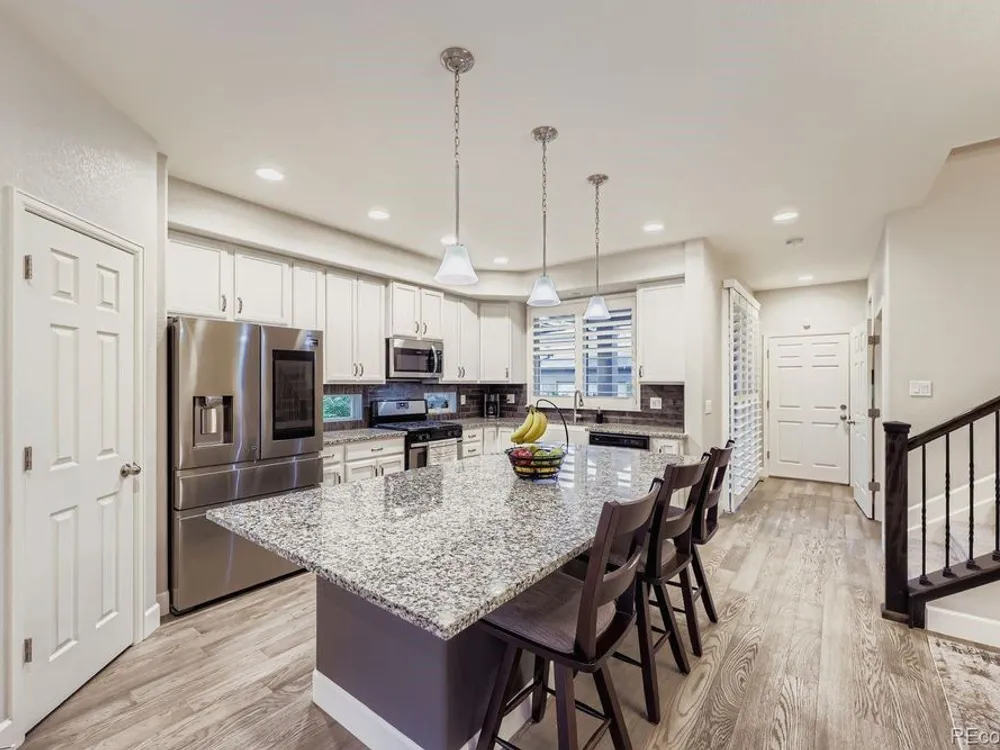 ***OPEN HOUSE THIS SATURDAY AND SUNDAY 11 am - 2 pm*** Welcome to 7226 W Evans Ave — a beautifully maintained 4-bedroom, 4-bath Belmar townhome with 2596 finished sq ft in one of Lakewood’s most desirable communities. Built in 2018 and backing to peaceful green space, this nearly new home features an open-concept main level with a chef’s kitchen boasting granite countertops, gas range, stainless appliances, large island, and walk-in pantry. Upstairs offers a spacious primary suite with vaulted ceilings, dual vanities and walk-in shower, an additional primary suite with a full bath with shower, an office or 3rd bedroom, and convenient laundry. The finished basement includes a private studio, full bath with soaking tub, and ample storage, which makes it a perfect guest or mother-in-law suite. Enjoy a private patio, two-car garage with ample built in storage, hot tub, fire pit, community pool, lake access, and walking trails—all close to shops, dining, and commuter routes. *Finished basement!* Bedrooms TAX 2 - MLS 4 Bathrooms TAX 3 - MLS 4