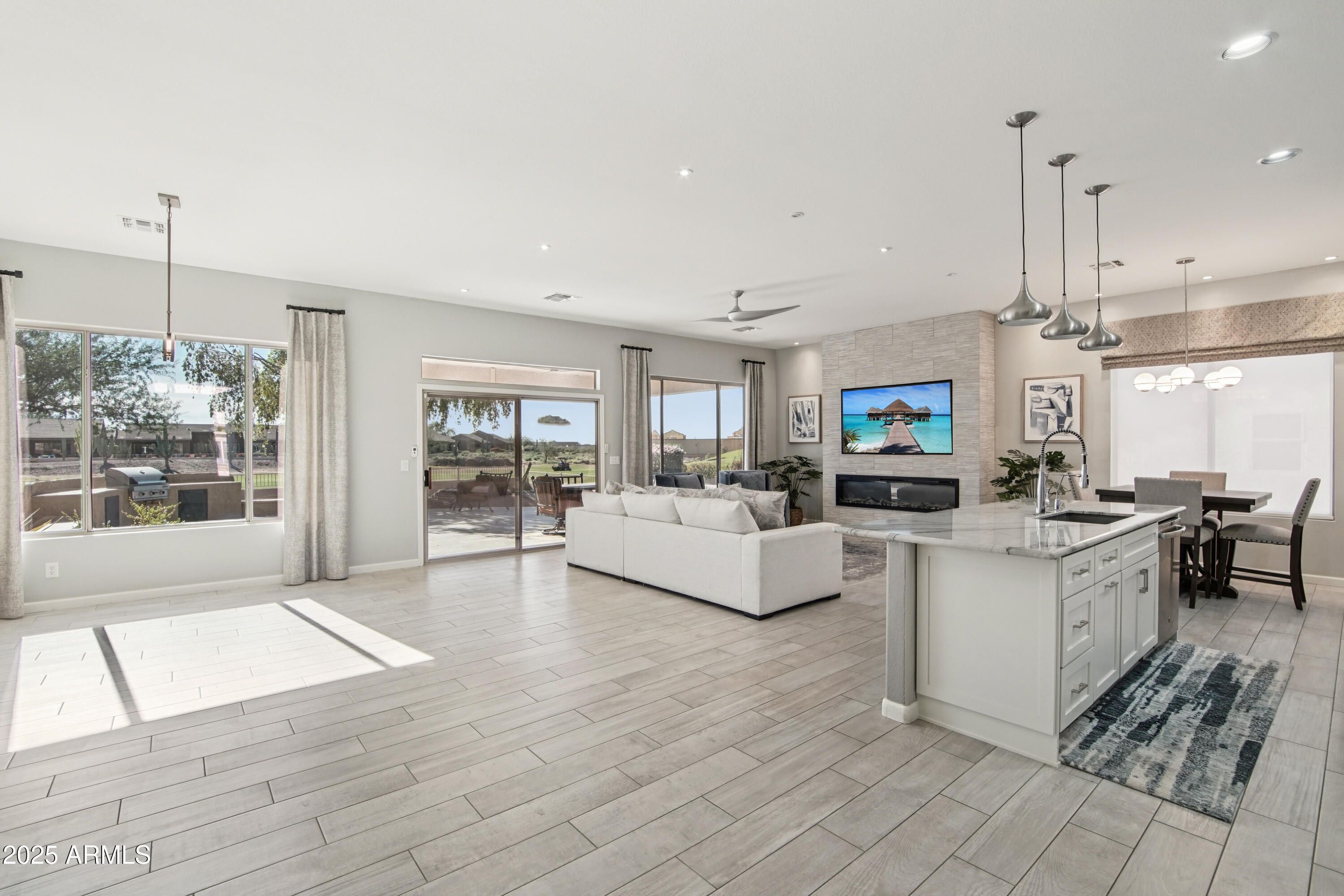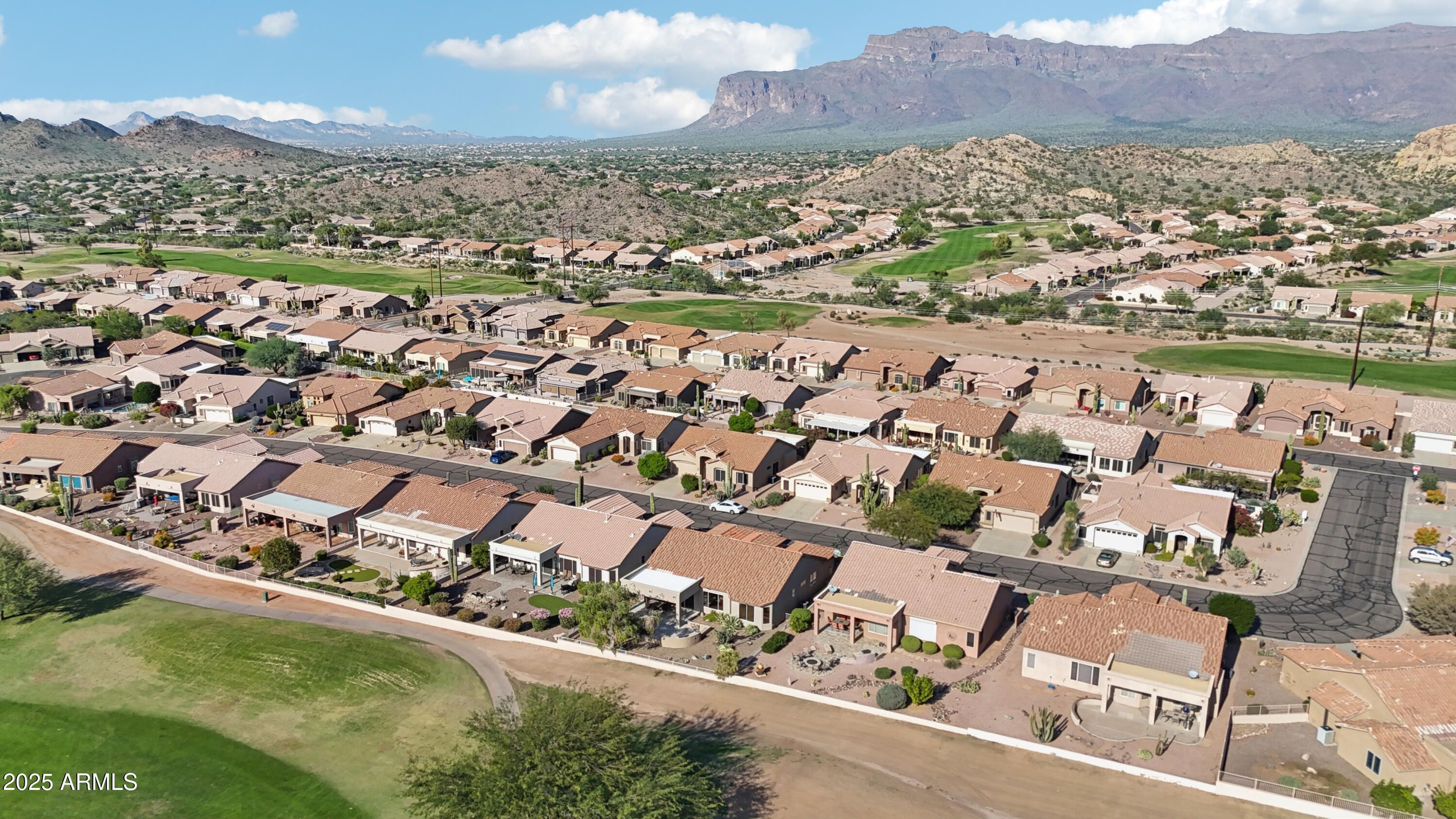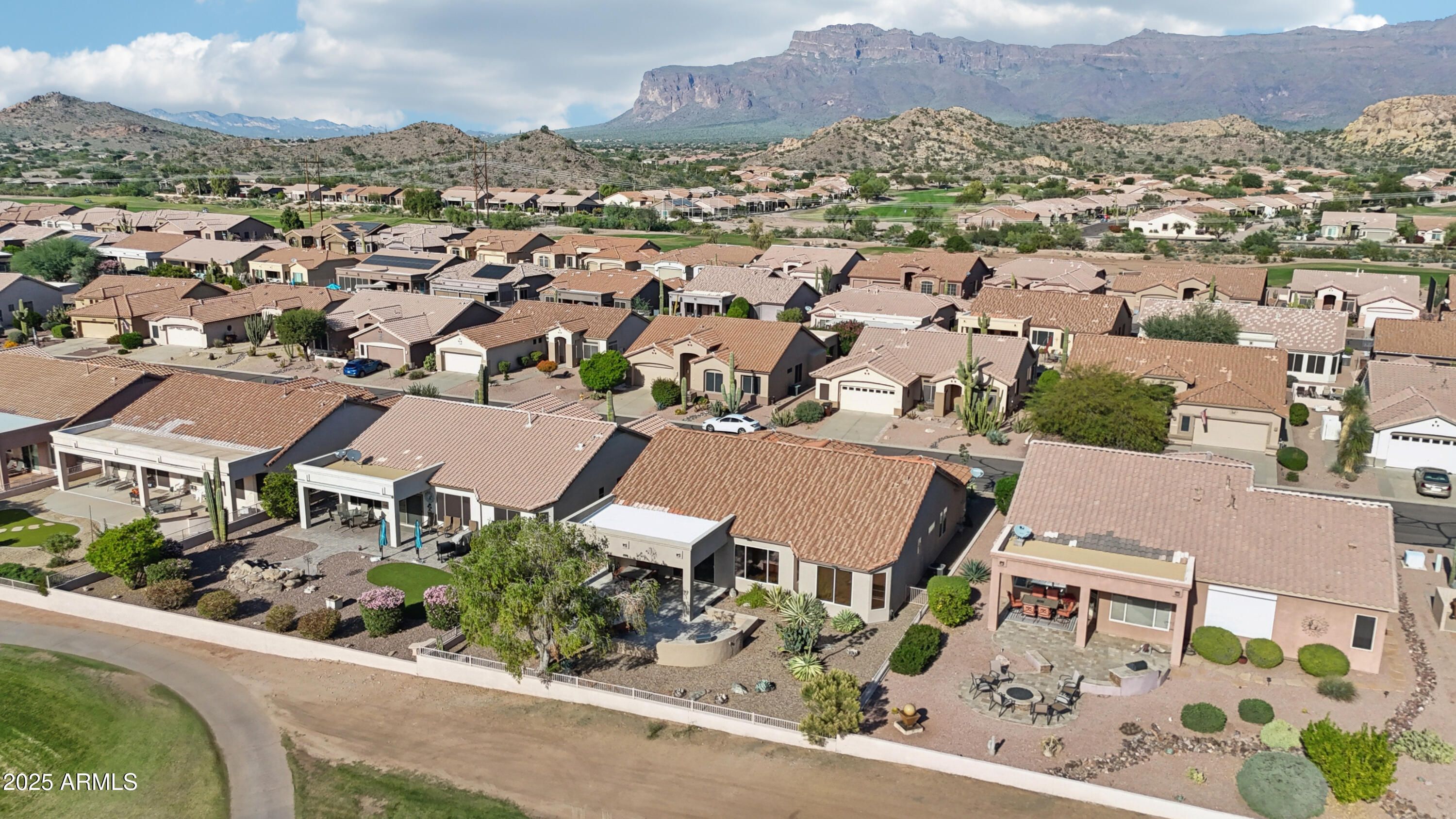 Welcome to this beautifully maintained Custom Bradshaw model perfectly situated on a premium south-facing golf course lot in the highly desirable 55+ community of MountainBrook Village. This home offers bright, inviting living spaces, mature desert landscaping, and sweeping views of the fairway framed by Arizona sunsets and the distant Superstition Mountains. Inside, the great room features high ceilings, abundant natural light, and a seamless flow into the dining areas. The kitchen provides generous cabinet space, a center island, stainless steel appliances, double wall ovens, and a cozy breakfast nook that looks out toward the backyard. A formal dining area offers additional space for entertaining guests or hosting gatherings. The split primary suite serves as a private retreat with golf course views, a spacious walk-in closet, double vanities, a walk-in shower, and a private water closet. Guest bedrooms are thoughtfully separated from the primary suite and work well for visitors, a hobby room, office, or fitness space. The outdoor living areas are the highlight of this home. A large covered patio connects to an expansive extended terrace that provides multiple seating areas, room for outdoor dining, and space for entertaining. The backyard includes an outdoor TV setup, built-in BBQ platform, and beautifully maintained desert landscaping that blends naturally into the fairway. With its south-facing orientation, the patio enjoys warm winter sunshine, soft afternoon light, and peaceful views in every direction. Additional features include newer roof, HVAC, plumbing, and wiring updates from 2020, custom window treatments, a water softener and RO system, no interior steps, and an extended 2.5-car garage with storage. The home sits on a quiet street with excellent curb appeal and easy access to the golf path and community amenities. MountainBrook Village is a 55+ community that offers an exceptional active-adult lifestyle with an 18-hole golf course, pickleball, tennis, a heated pool and spa, fitness center, clubhouse, recreation center, and miles of paths. This home is move-in ready, beautifully cared for, and positioned on one of the community's most desirable golf course lots, an ideal Arizona retreat!