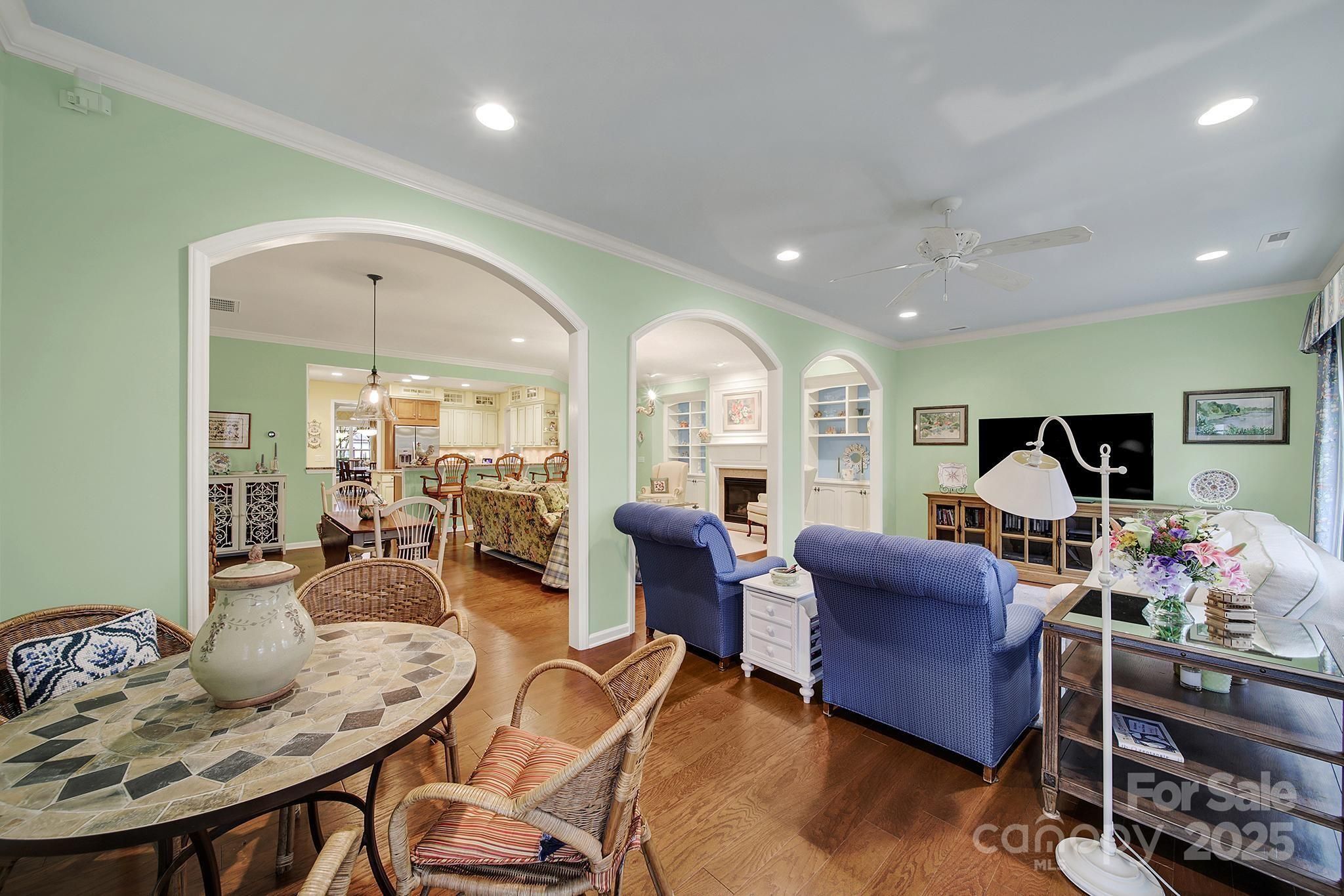 STUNNING Morningside Lane home with extended outdoor entertaining area overlooking the water. This home is a "must-see" featuring a designer interior loaded with upgrades. A charming covered front porch welcomes you into the grand entryway, flanked by a formal dining room with a chandelier and a den/living room. The chef's kitchen is a true highlight, offering painted two-toned cabinets to the ceiling, a center island, granite countertops, a gas cooktop with a vented hood, tile backsplash, and stainless-steel appliances. A breakfast bar separates the kitchen from the expansive great room, complete with a cozy gas log fireplace flanked by built-in bookshelves. Stunning archways lead into the sunroom, which boasts oversized windows that flood the space with natural light, providing sweeping views of the back patio and lake. The spacious primary suite is located at the back of the home for privacy with a tray ceiling and double doors that open up to an updated ensuite bath. The primary bath features an extended dual vanity, luxurious tub, a tiled walk-in shower with glass door, and a his & hers walk-in closet. Two generous secondary bedrooms are located at the front of the home, each offering ample space and access to their own full baths. Make sure to check out the walk-in laundry room with custom shiplap backdrop and built-in cabinets with sink & folding table. Step outside and enjoy the outdoors under a romantic custom Tuscan-style pergola and paver patio, offering serene water views that provide the perfect backdrop for relaxation and entertaining. This home is located within the highly sought-after 55+ Sun City Carolina Lakes golf community known for its resort-style amenities including golf club, indoor & outdoor pools, gym with indoor track, sports courts offering tennis, pickle ball, bocci ball, softball field, canoe/kayak center, dog park, woodworkers shop & miles of walking/biking trails. This community is all about LIFESTYLE and there are over 150 clubs at last count - something for everyone. Convenient location with easy access to restaurants, grocery, banking, shopping, and the Del Webb Public Library. Don't forget the low SC Taxes!