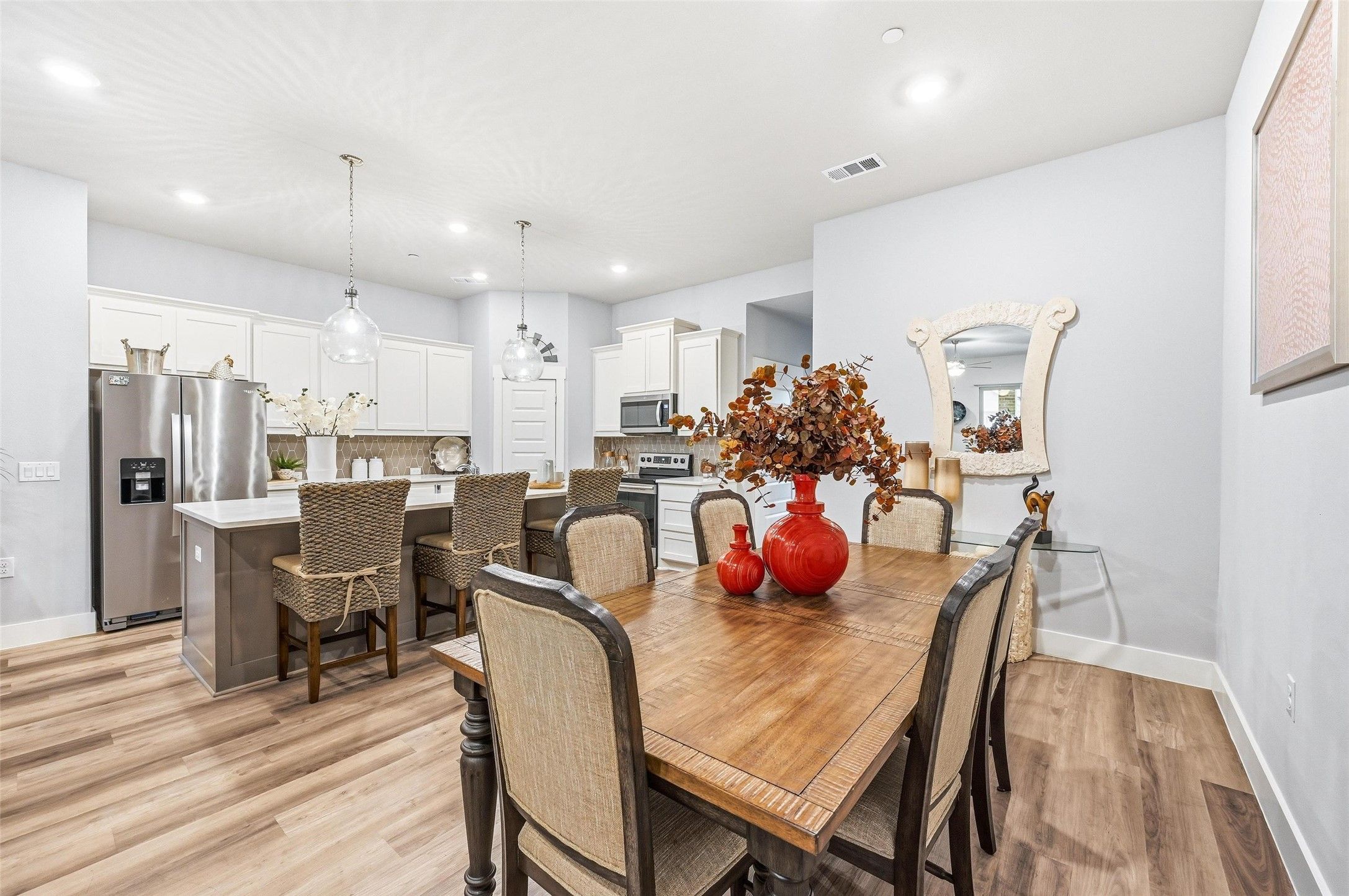 Welcome to easy TOWNHOME living inside a GATED amazingly peaceful 55+ gated lakeside community! Start your day on the PRIVATE FRONT PATIO. It’s the best spot for morning coffee, potted plants or catching up with neighbors as the day begins. Inside you’re greeted by a SPACIOUS OPEN FLOOR PLAN wrapped in beautiful WOOD FLOORING. It makes the entire space feel warm & welcoming. The kitchen is ready to impress with miles of GORGEOUS COUNTERTOPS, ABUNDANT CABINETRY & an ISLAND with STORAGE & BARSTOOL SEATING that naturally becomes the heart of the home. It’s the perfect setup for charcuterie nights, pancake Saturdays or chatting with friends while dinner simmers. When the day winds down, retreat to the primary suite where a VAULTED CEILING adds an airy touch & the ensuite bath feels delightfully spa-like. It offers DUAL SINKS & a LUXURIOUSLY OVERSIZED SHOWER complete with a BUILT-IN BENCH. The secondary bedroom is thoughtfully SPLIT for privacy, GENEROUSLY SIZED & features its own WALK-IN CLOSET & a second full bath nearby. An ATTACHED TWO-CAR GARAGE adds everyday convenience, while the community offers fantastic AMENITIES including a FITNESS CENTER, sparkling POOL and a COMMUNITY CENTER. You’ll love staying active, socializing or simply enjoying the perks of low-maintenance living! You’ll also enjoy being just minutes from outdoor fun at beautiful Joe Pool Lake, parks, dining & more! This townhome delivers comfort, connection & carefree living all in one. See it today!