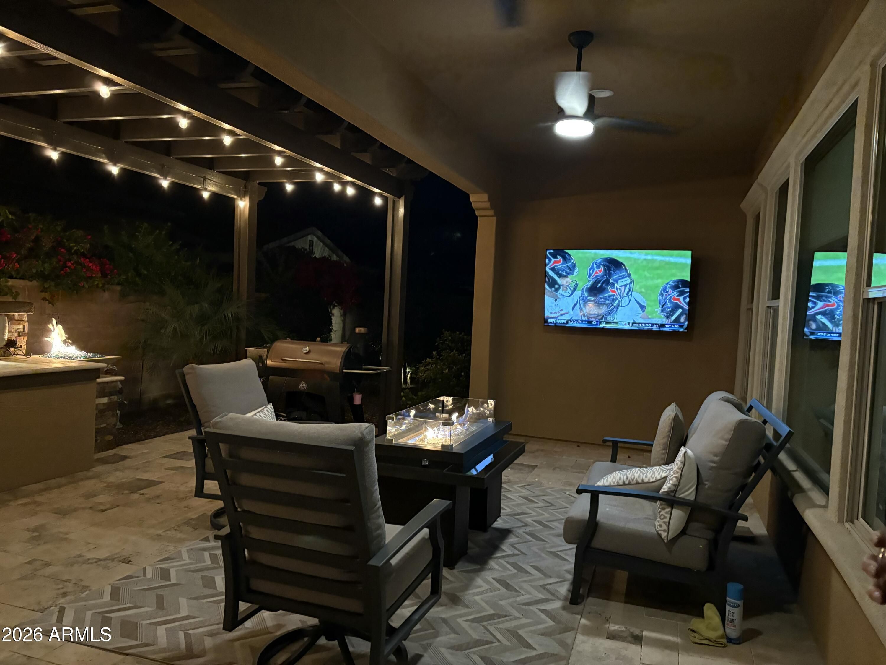 Home, sweet home! Nestled in a prime corner lot, this beautiful single-story home in the sought-after Encanterra is the one for you! Fall in love with the bright interior, showcasing generous living spaces with wood-look flooring, recessed lighting, high ceilings, and neutral colors throughout. Whip up your favorite dishes in the pristine kitchen, complete with staggered cabinets with crown molding, tile backsplash, sleek granite countertops, stainless steel appliances, and an island perfect for quick meals. The den is perfect for a game area or an office. And the bonus room works perfectly as a guest bedroom, craft room, movie room, you decide..The serene main bedroom promises a good night's sleep and hosts a bathroom with double sinks and a walk-in closet. The laundry area has a built-in desk and cabinets for convenience, while the 2-car garage boasts attached storage an epoxy flooring. Out back, you have a nice space for weekend grills w/ built in bbq and peaceful evenings, including a covered patio with well-laid travertine pavers, an attached pergola, and an amvient fire fire feature.. This home is a must-see! Most furniture is for sale on a separate bill of sale.