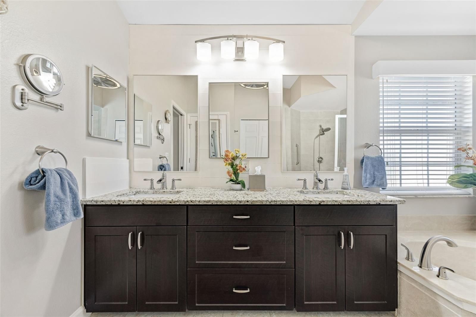 - Ceiling Fan(s), Crown Molding, Eat-in Kitchen, High Ceilings, Open Floorplan, Solid-Wood Cabinets, Split Bedrooms, Stone Counters, Vaulted Ceiling(s), Walk-In Closet(s)