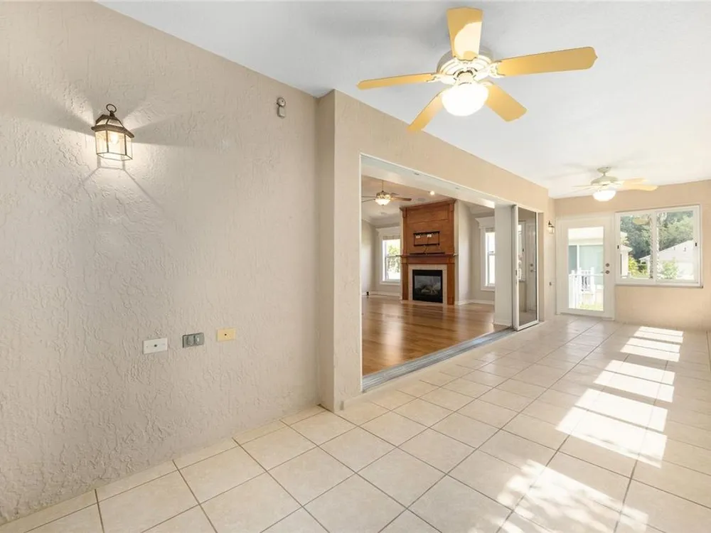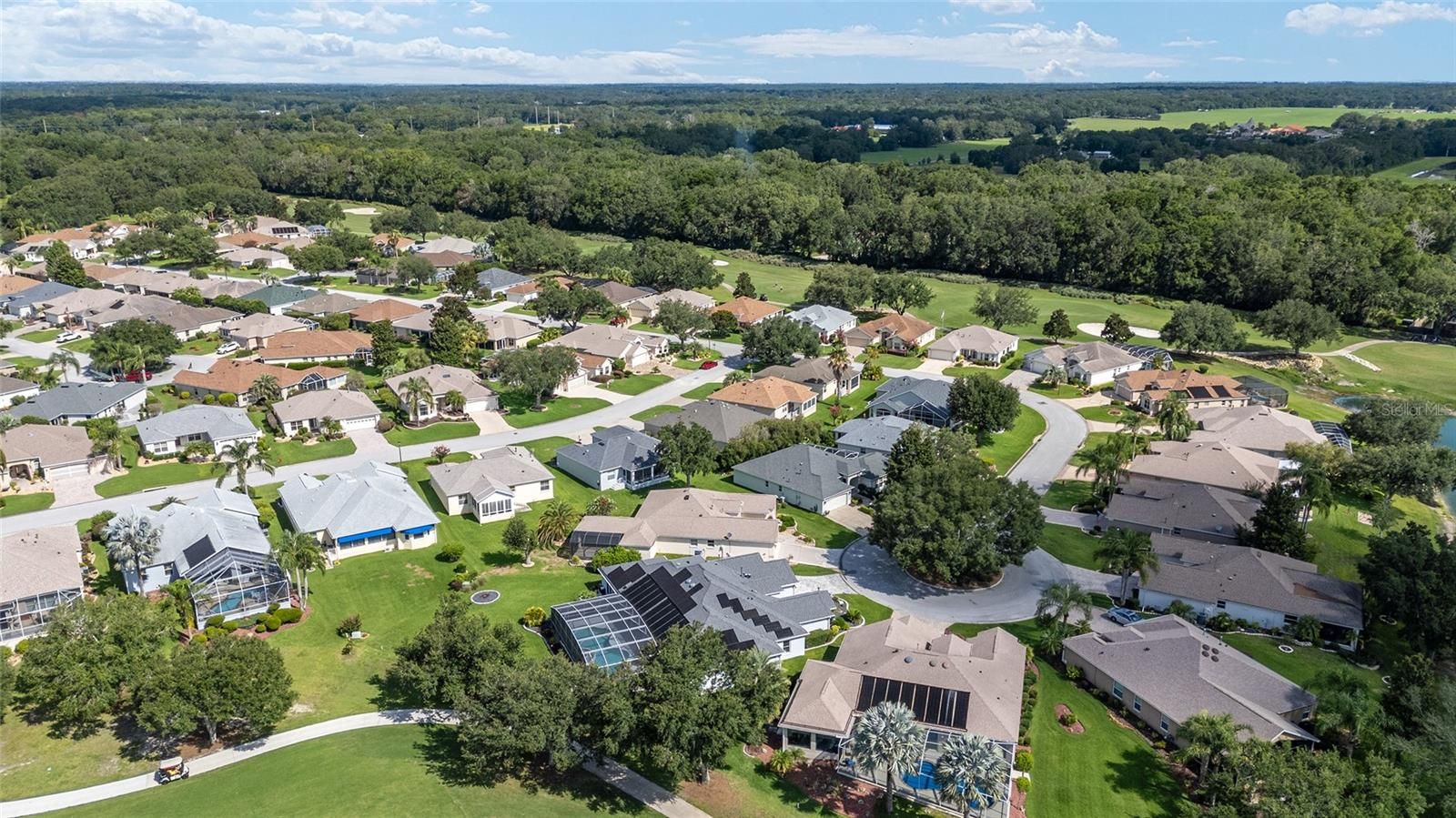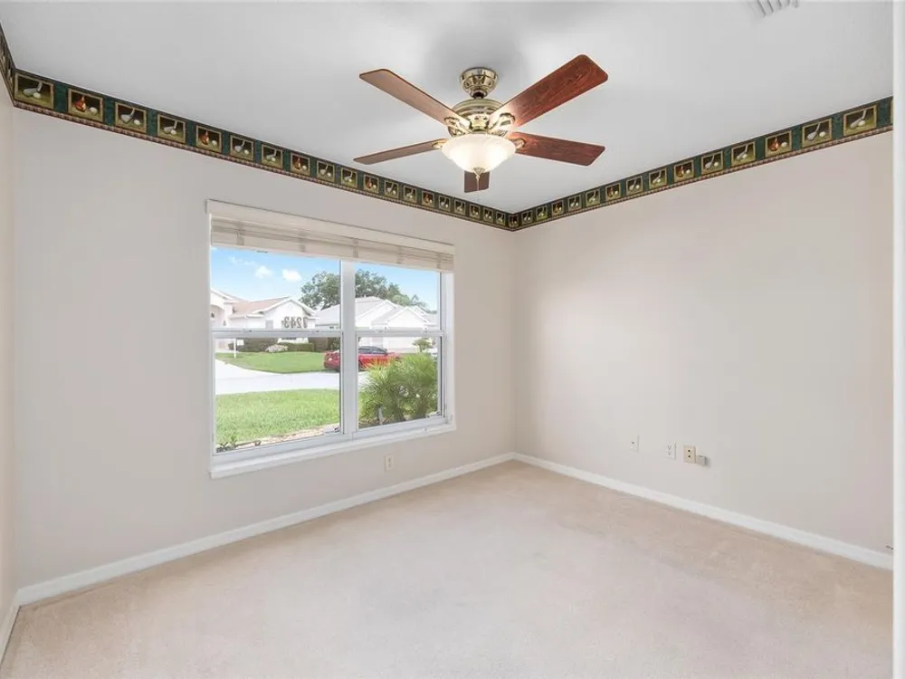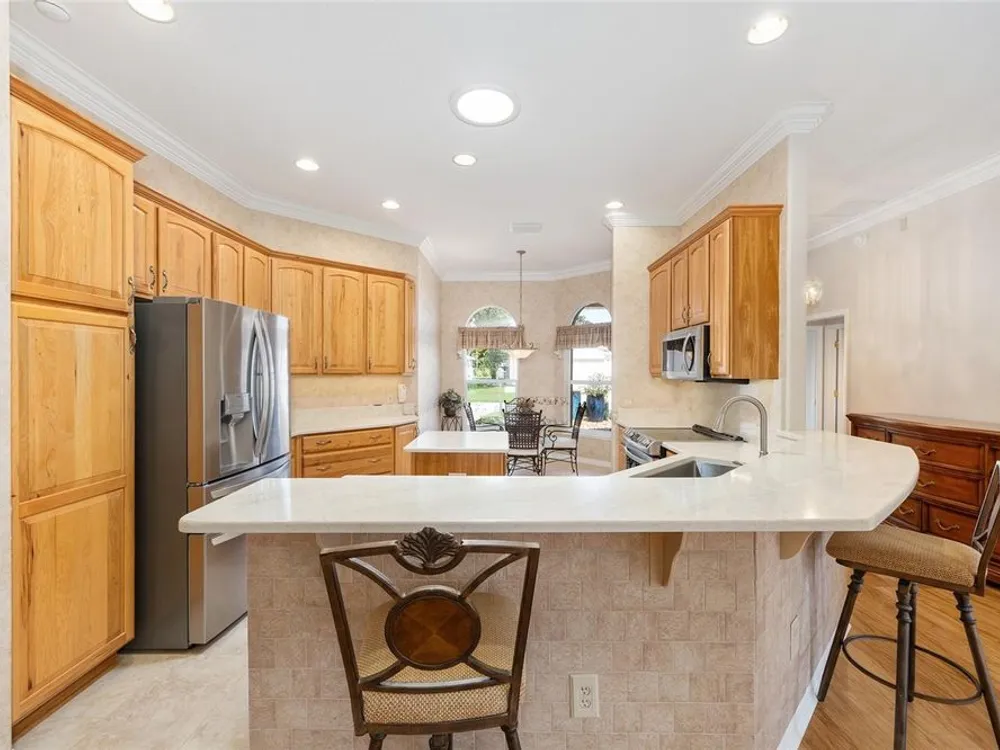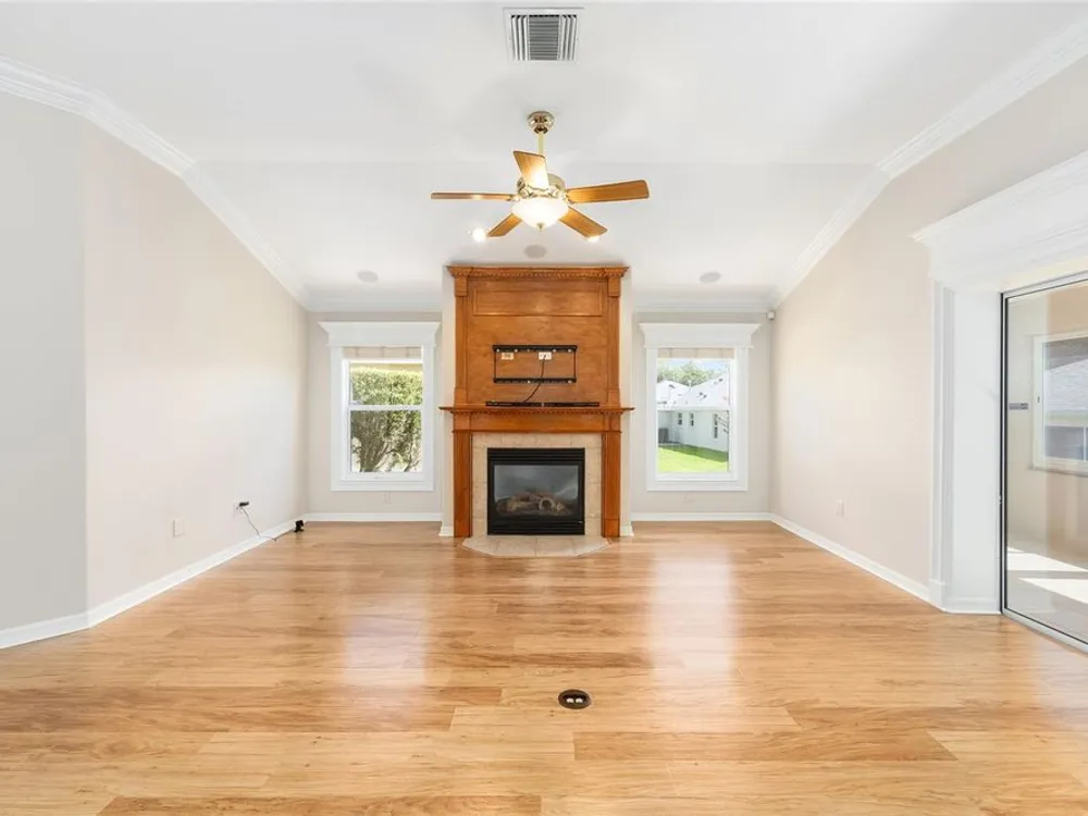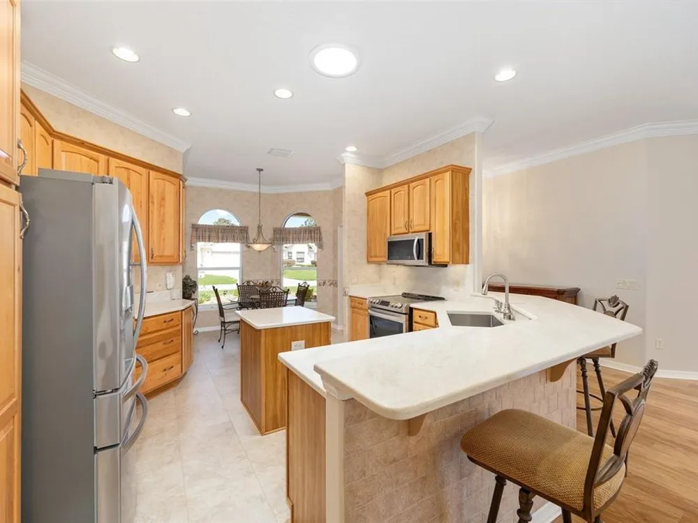 NO BOND~NEW ROOF 2025~NEW 3 TON HVAC 2012~WHOLE HOUSE GENERATOR~ADT SECURITY SYSTEM. This stunning and well maintained Designer model is concrete block and stucco, located in popular area of Chatham in The Villages. From the moment you arrive, you’ll notice the care and detail that set this home apart. The spacious kitchen is a chef’s dream, featuring upgraded stainless steel appliances, solid surface countertops, wood cabinetry, under-cabinet lighting, a built-in pantry with sliding drawers, recessed lighting, a central island, breakfast bar, and a cozy eat-in nook. Perfectly open to the dining and living areas, this layout is ideal for holiday gatherings and entertaining. Enjoy soaring ceilings and a gas fireplace in the expansive living room, which flows seamlessly into the enclosed Florida room, where insulated windows and fully retractable sliding glass doors provide abundant natural light and a perfect blend of indoor-outdoor living. The Florida room is a warm and cozy space to enjoy your morning coffee, a glass of wine, or watch sports. The spacious primary suite offers a peaceful retreat with double walk-in closets designed with custom built ins, a generous en suite bathroom featuring dual sinks, a makeup vanity, walk-in shower, and a generous linen closet. Crown molding, solar tubes, recessed lighting, and luxury vinyl flooring add elegance and easy maintenance throughout the home. Lightning Protection System & Air Filter System, Fresh Interior Paint, Treed Buffer Behind the Home for Added Privacy. Garage Storage Cabinets and furniture as pictured are included! Located close to the NEW FIRST RESPONDERS, as well as the MULBERRY GROVE Pool and Rec Center. A quick golf cart ride to world class golfing, NANCY LOPEZ LEGACY Championship Golf Course & GLENVIEW Championship Golf Course. Nearby Mulberry Grove is full of restaurants, shopping, entertainment & medical. Schedule your tour today and start enjoying The Villages lifestyle!