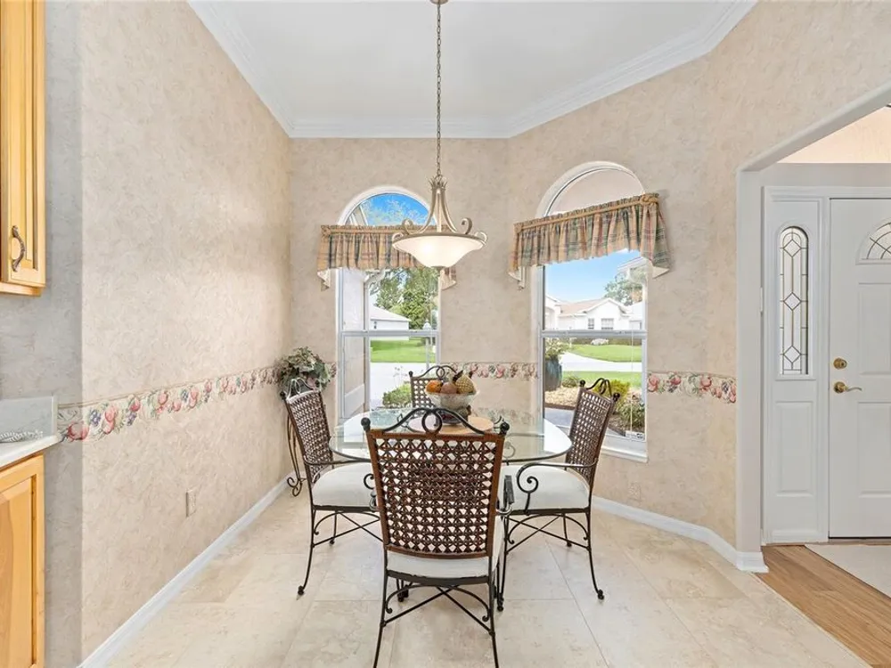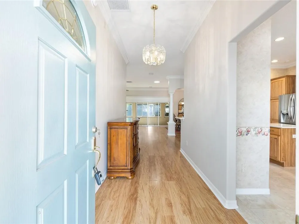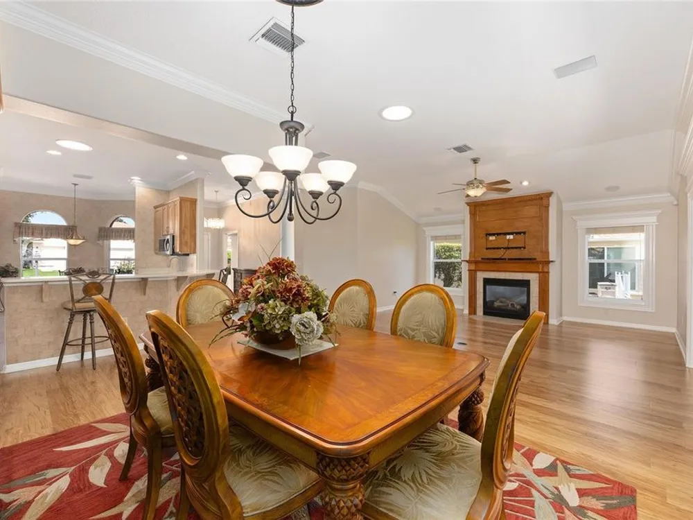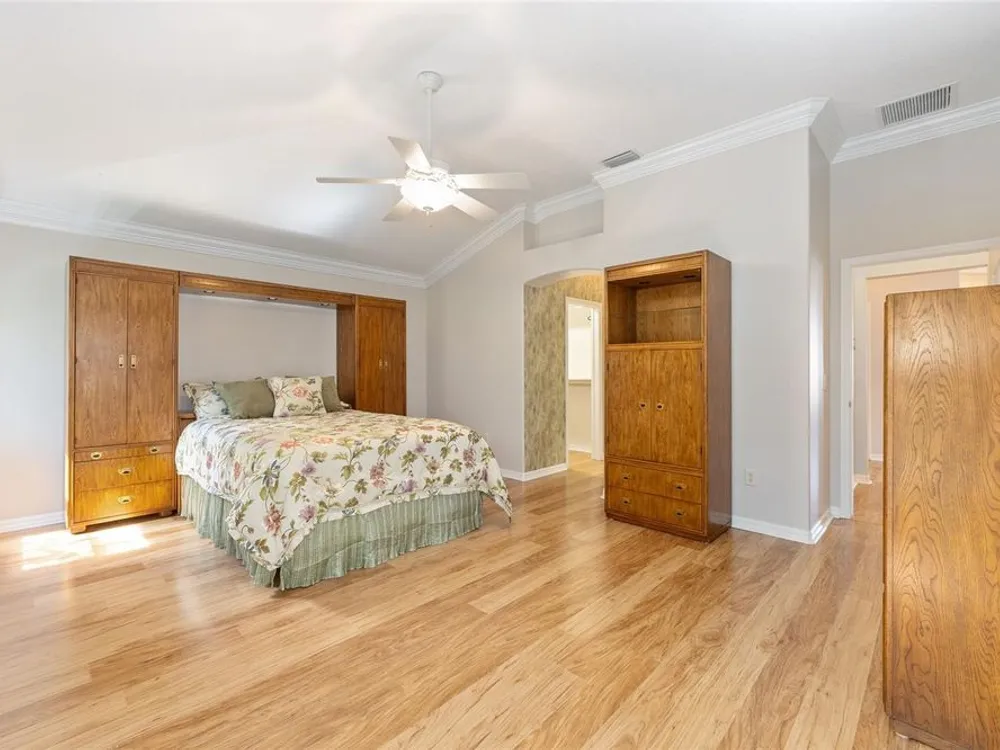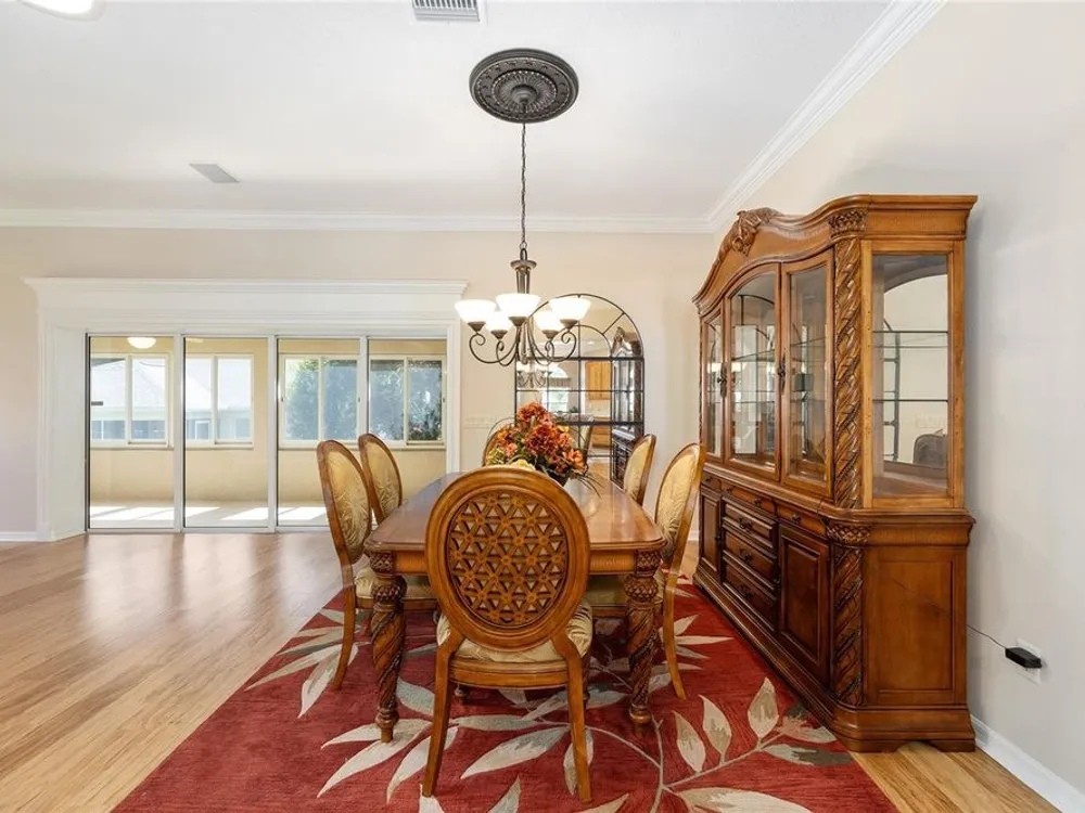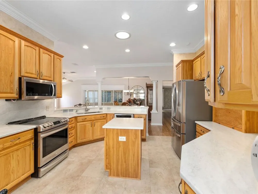 NO BOND~NEW ROOF 2025~NEW 3 TON HVAC 2012~WHOLE HOUSE GENERATOR~ADT SECURITY SYSTEM. This stunning and well maintained Designer model is concrete block and stucco, located in popular area of Chatham in The Villages. From the moment you arrive, you’ll notice the care and detail that set this home apart. The spacious kitchen is a chef’s dream, featuring upgraded stainless steel appliances, solid surface countertops, wood cabinetry, under-cabinet lighting, a built-in pantry with sliding drawers, recessed lighting, a central island, breakfast bar, and a cozy eat-in nook. Perfectly open to the dining and living areas, this layout is ideal for holiday gatherings and entertaining. Enjoy soaring ceilings and a gas fireplace in the expansive living room, which flows seamlessly into the enclosed Florida room, where insulated windows and fully retractable sliding glass doors provide abundant natural light and a perfect blend of indoor-outdoor living. The Florida room is a warm and cozy space to enjoy your morning coffee, a glass of wine, or watch sports. The spacious primary suite offers a peaceful retreat with double walk-in closets designed with custom built ins, a generous en suite bathroom featuring dual sinks, a makeup vanity, walk-in shower, and a generous linen closet. Crown molding, solar tubes, recessed lighting, and luxury vinyl flooring add elegance and easy maintenance throughout the home. Lightning Protection System & Air Filter System, Fresh Interior Paint, Treed Buffer Behind the Home for Added Privacy. Garage Storage Cabinets and furniture as pictured are included! Located close to the NEW FIRST RESPONDERS, as well as the MULBERRY GROVE Pool and Rec Center. A quick golf cart ride to world class golfing, NANCY LOPEZ LEGACY Championship Golf Course & GLENVIEW Championship Golf Course. Nearby Mulberry Grove is full of restaurants, shopping, entertainment & medical. Schedule your tour today and start enjoying The Villages lifestyle!
