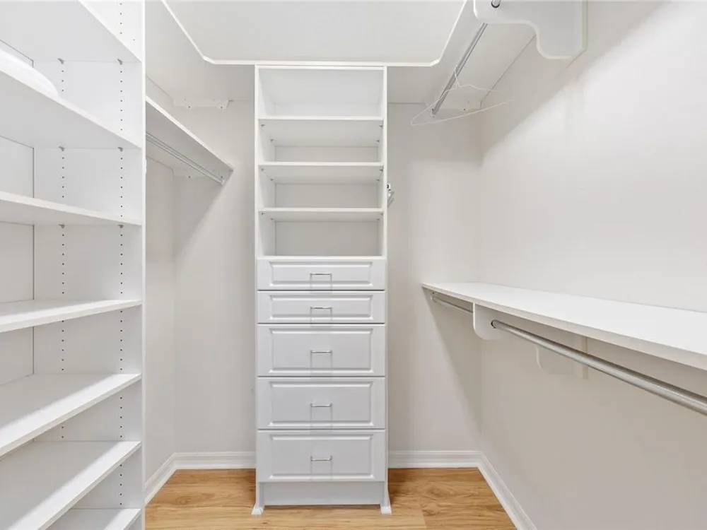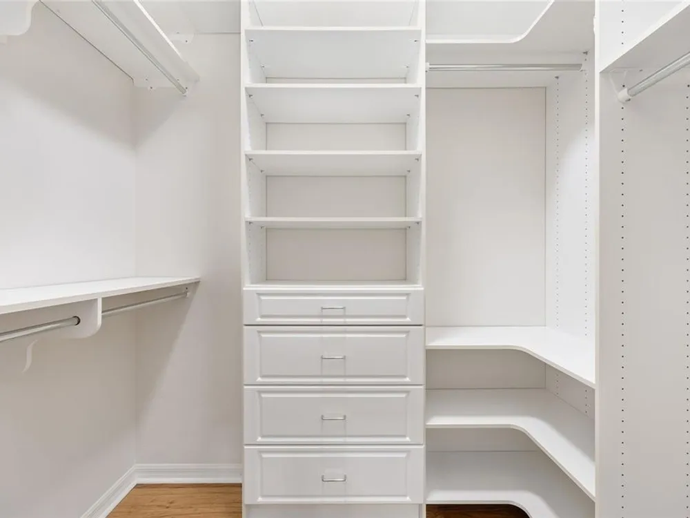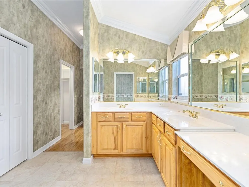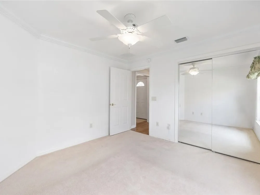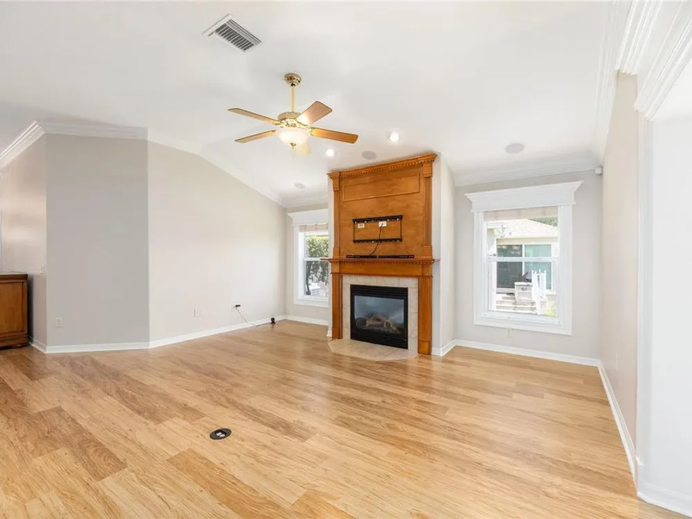 - Ceiling Fan(s), Crown Molding, Eat-in Kitchen, High Ceilings, Living/Dining Room, Open Floorplan, Main Level Primary, Solid Surface Counters, Solid-Wood Cabinets, Split Bedrooms, Thermostat, Walk-In Closet(s)