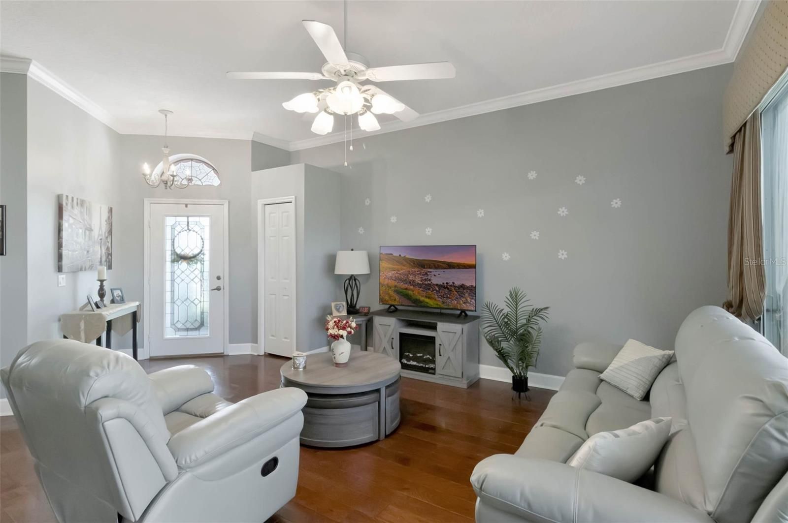 Discover the charm of this RidgeMont model home, featuring a perfect floor plan with solid surface flooring and a north-facing enclosed lanai. Located just 0.3 miles from High Vista's private clubhouse, this home boasts an expanded brick paver driveway and walkway leading to a large front porch and entry. The central great room has a 10 FT crown molded ceiling, coat closet, and wood flooring that extends to the bedrooms. The primary bedroom offers a full private bath with double sink vanity, soft-close doors and dovetailed drawers, frameless shower door, linen closet, and plantation shutters over the soaking tub. A 14x6 walk-in closet with built-in shelving. The eat-in kitchen is equipped with large windows, granite countertops and backsplash, stainless-steel kitchen appliances including a Bosch dishwasher, and a new refrigerator. The corridor laundry area has built in cabinets over the washer & dryer. A sliding glass door in the great room opens to an enclosed lanai with Florida glass over screens, a French door to the primary bedroom, and a cabana door to the exterior. Bedroom 2 features crown molding and built-in bookshelves, while Bedroom 3 has a double-door entry and a built-in closet system. The guest rooms share a full bath and large linen closet in this split bedroom floorplan. Additional features include a 2-car garage with sliding screen doors. Ridgewood Lakes is a golf cart-friendly community. *NEW HVAC UNIT* High Vista HOA fee includes Spectrum internet and basic cable TV, lawn mowing, and exclusive access to the resident-owned 12,000 SF private clubhouse and amenities. Ridgewood Lakes HOA fee provides 24/7 staffed security gate and master association-owned private road maintenance. Adjacent to the 18-hole White Heron Golf Club with a restaurant, privately owned and open to the public. High Vista is a vibrant 55+ community offering an outdoor heated pool and spa, fitness center, library, pub, and numerous organized activities. Enjoy pickleball, tennis, bocce, and shuffleboard courts, along with miles of biking and walking trails within the gated Ridgewood Lakes community. Nearby attractions include shopping centers, Disney, Universal, Orlando, and Central Florida entertainment venues. This location also provides easy access to I-4, medical facilities, airports, and AdventHealth hospital is conveniently located just 3 miles away.