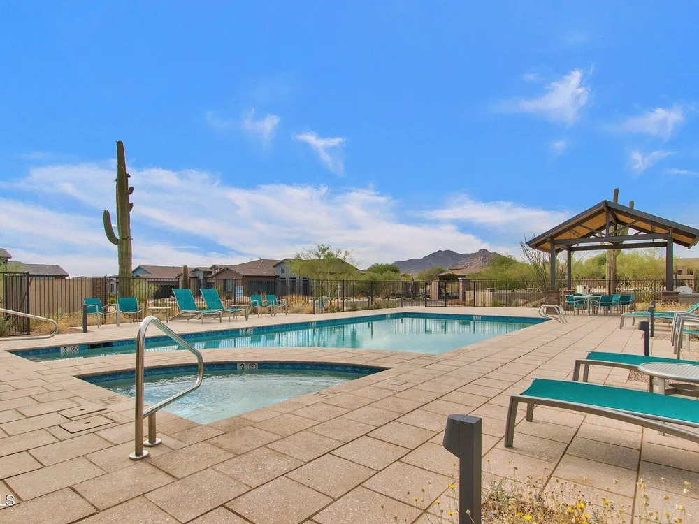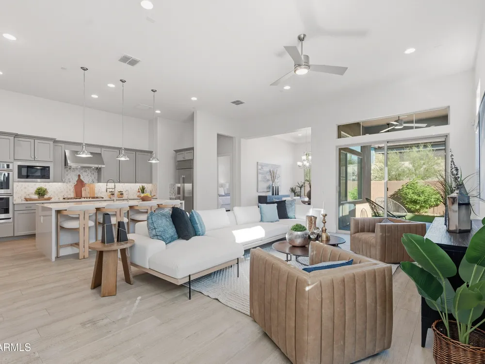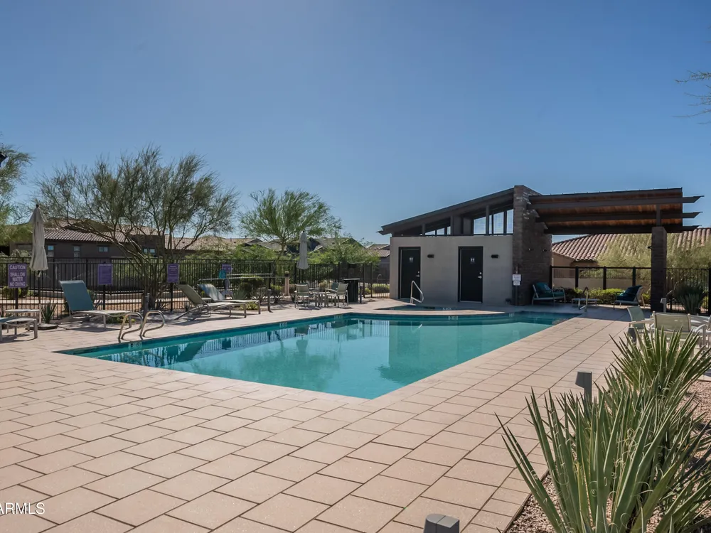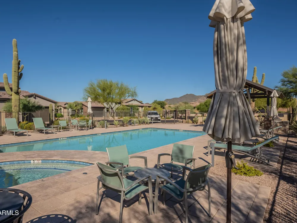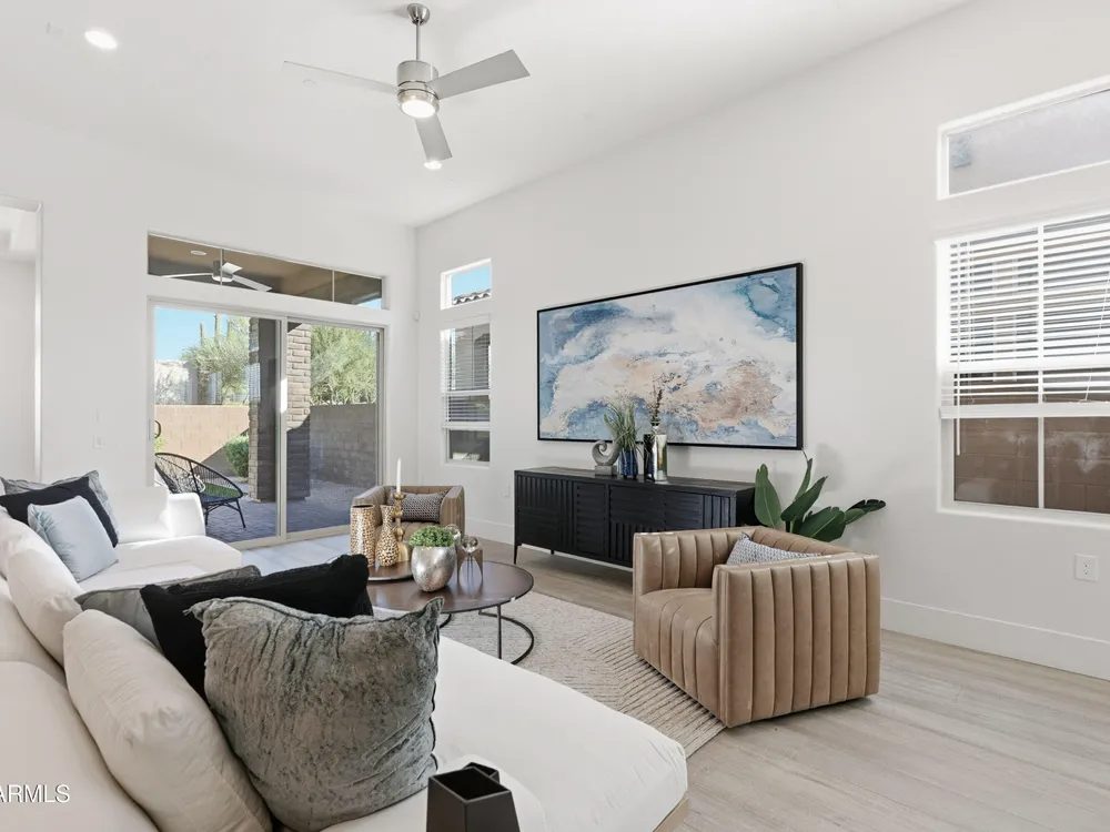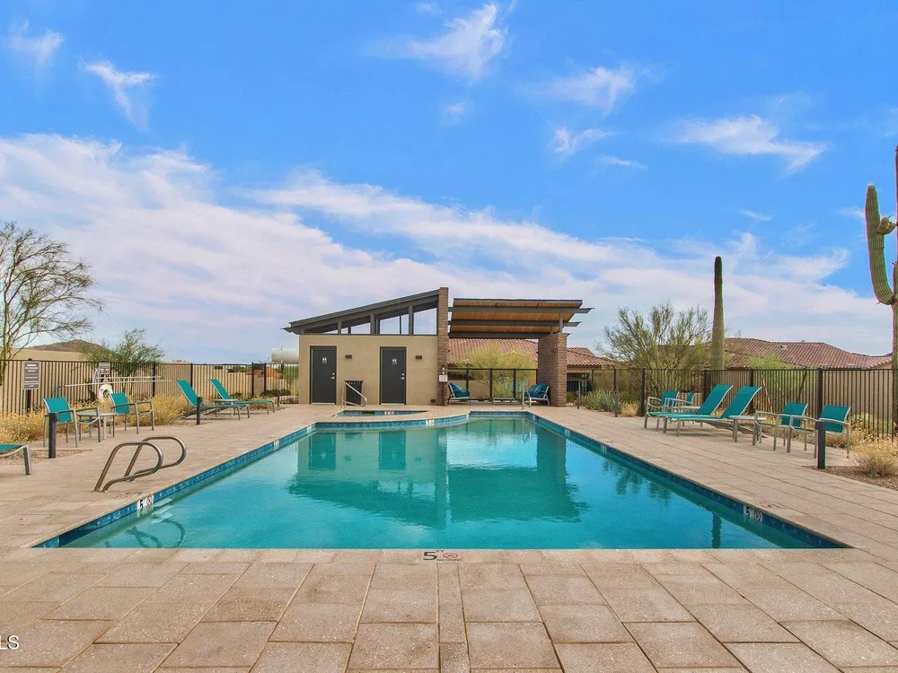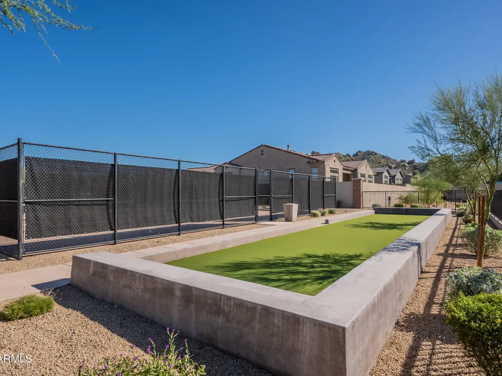 Luxury 2BR + Den in Scottsdale Heights 55+ Gated Community. Built in 2021, this single-story 2-bedroom + den, 2.5-bath home offers upscale living in the private, gated community of Scottsdale Heights in North Scottsdale. Enjoy an open floor plan with 12' ceilings, wood flooring throughout, and a chef's gourmet kitchen featuring Monogram stainless steel appliances, quartz countertops, double ovens, a large island, and breakfast bar. The spacious primary suite includes a double vanity, walk-in shower, and oversized walk-in closet. Step outside through sliding doors to a private backyard with new turf, pavers, and mountain views. Community amenities include a heated pool, jacuzzi, bocce ball and pickleball courts, full dog park, and professionally maintained front yards. Conveniently located near Summit Shopping Center, golf courses, and scenic walking, biking, and hiking trails. Move-in ready and a must-see!