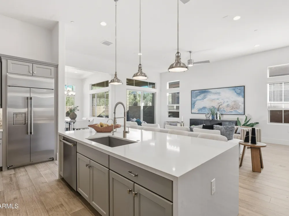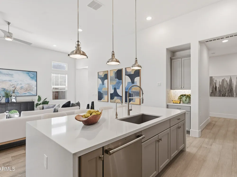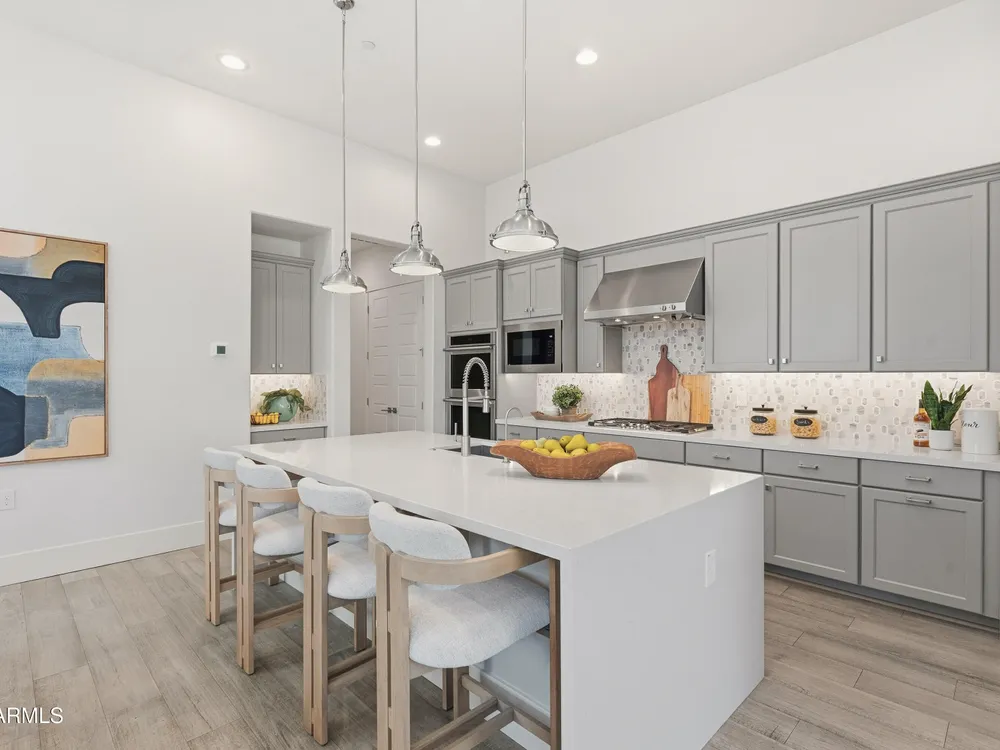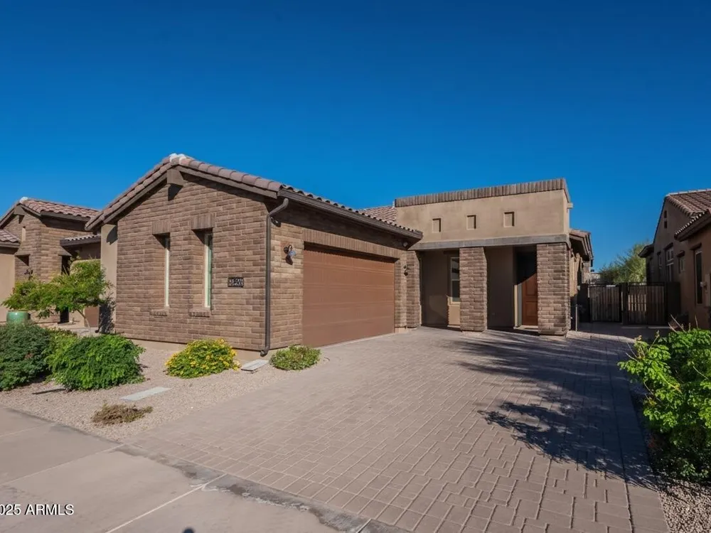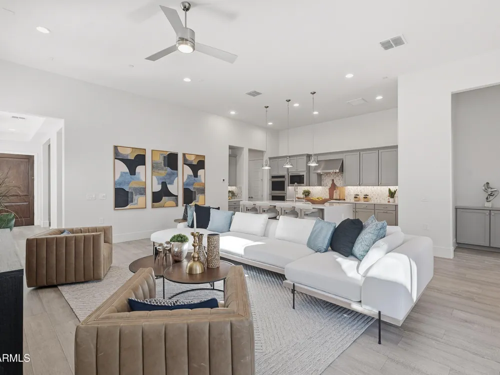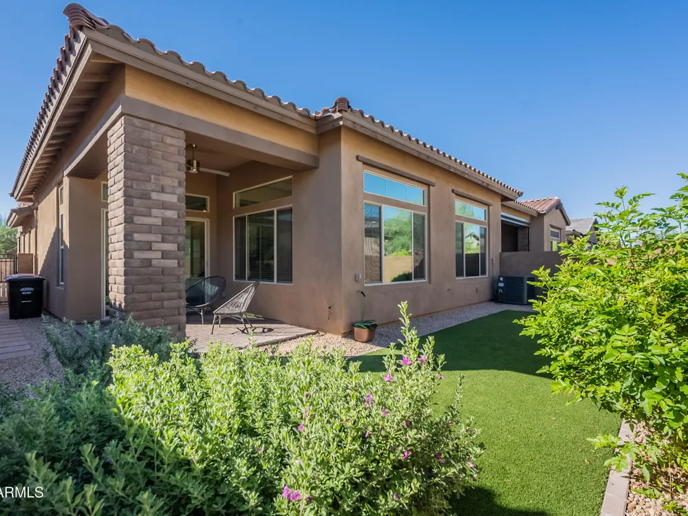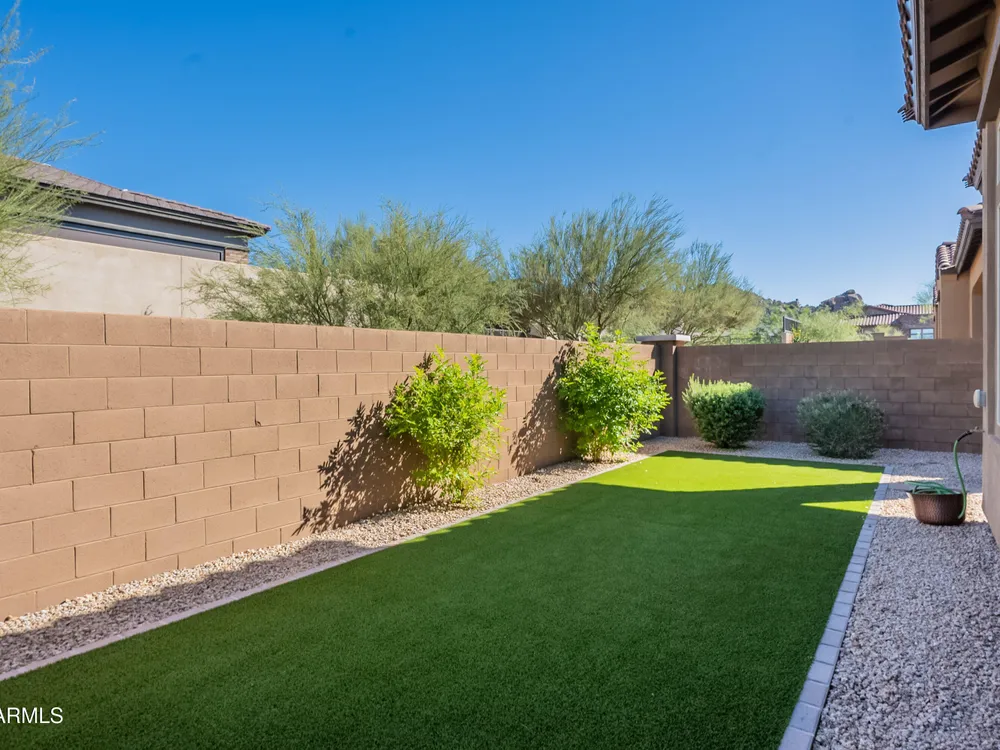 Luxury 2BR + Den in Scottsdale Heights 55+ Gated Community. Built in 2021, this single-story 2-bedroom + den, 2.5-bath home offers upscale living in the private, gated community of Scottsdale Heights in North Scottsdale. Enjoy an open floor plan with 12' ceilings, wood flooring throughout, and a chef's gourmet kitchen featuring Monogram stainless steel appliances, quartz countertops, double ovens, a large island, and breakfast bar. The spacious primary suite includes a double vanity, walk-in shower, and oversized walk-in closet. Step outside through sliding doors to a private backyard with new turf, pavers, and mountain views. Community amenities include a heated pool, jacuzzi, bocce ball and pickleball courts, full dog park, and professionally maintained front yards. Conveniently located near Summit Shopping Center, golf courses, and scenic walking, biking, and hiking trails. Move-in ready and a must-see!