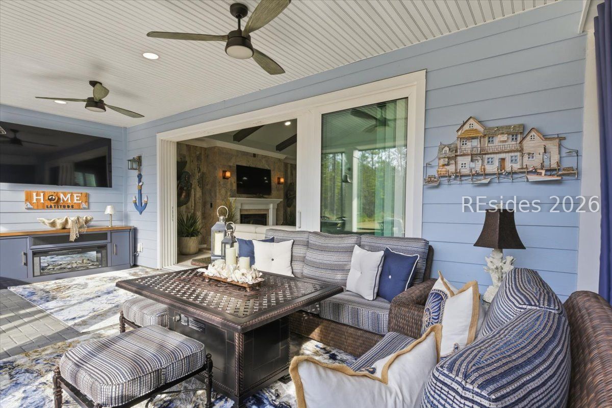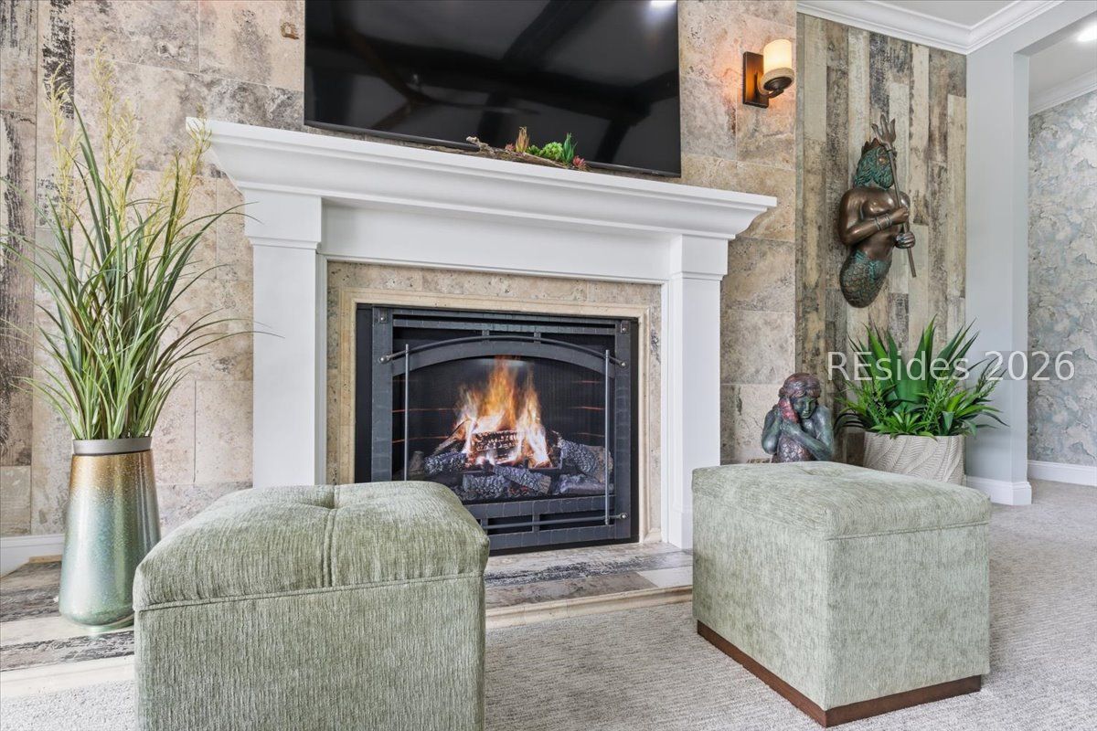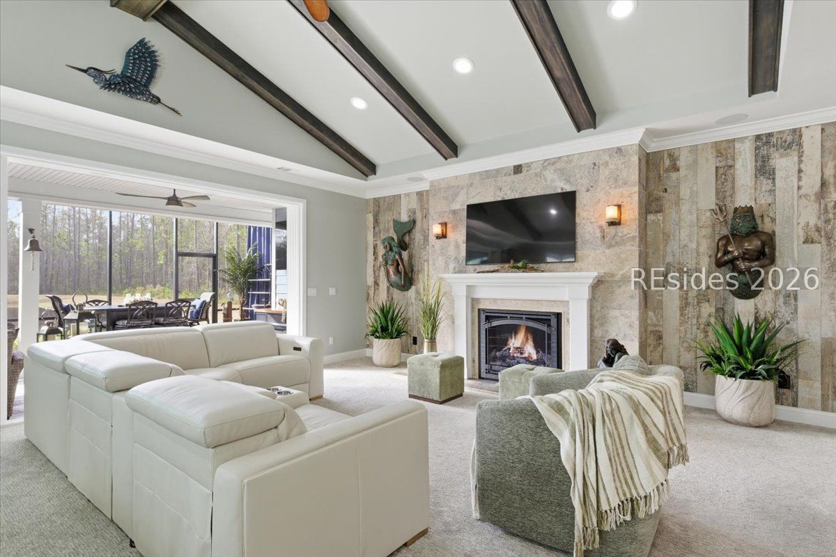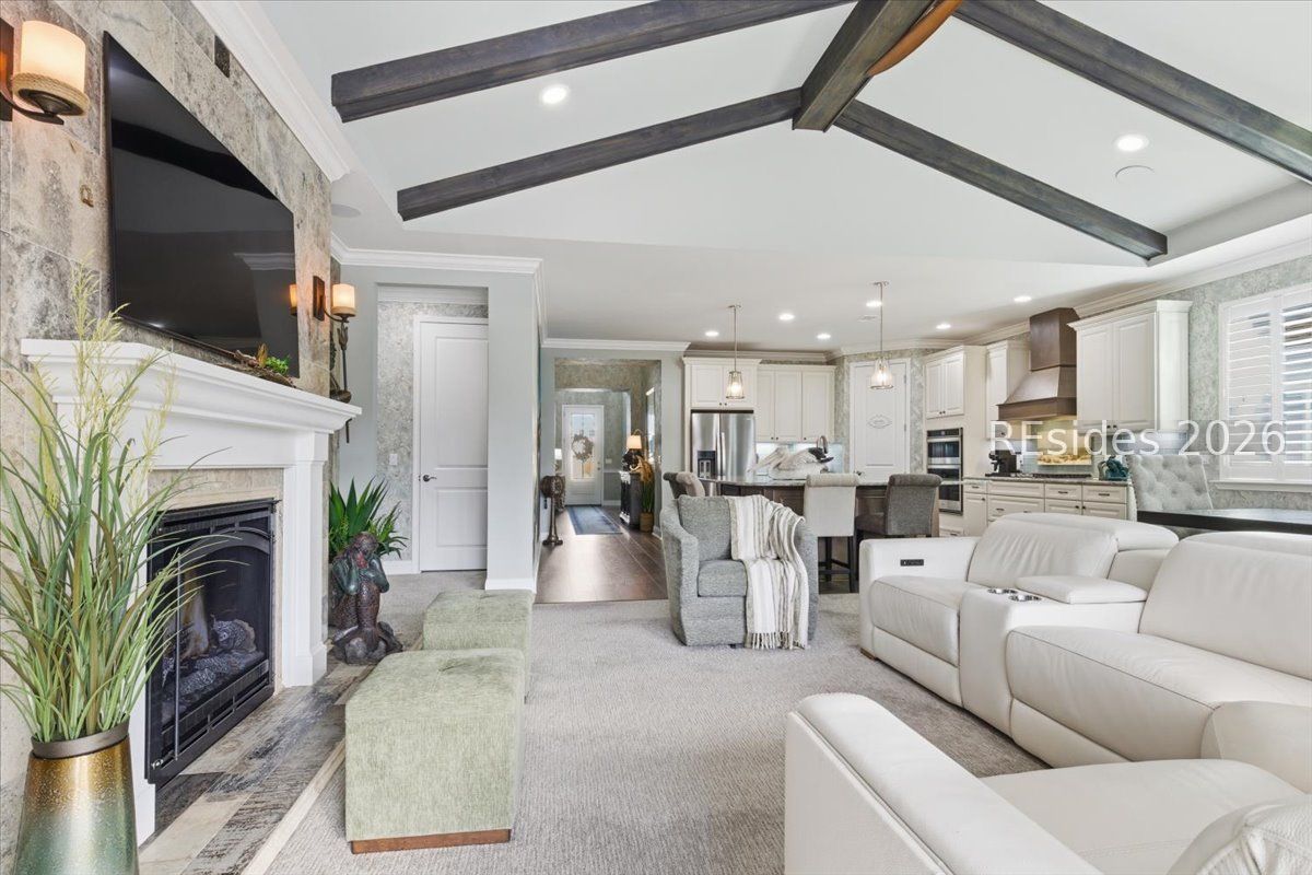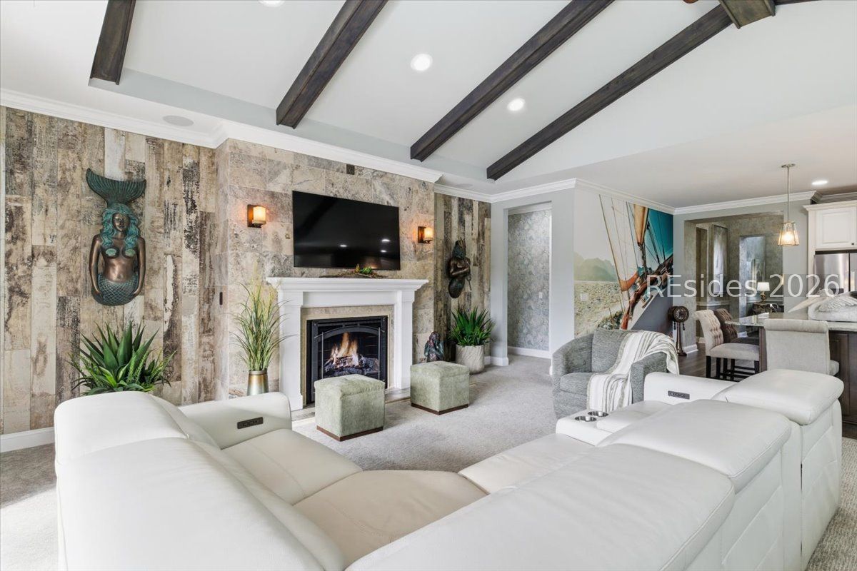Experience the ultimate & "no worries" & lifestyle in this stunning residence located within the award-winning Latitude Margaritaville. Nestled quietly in Phase 5, the home welcomes you through a sophisticated glass front door into an inviting foyer, where a dramatic 14-foot shiplap ceiling immediately sets a coastal-chic tone. The open-concept layout features rich flooring that leads to a true chef's kitchen, fully equipped with 42-inch cabinetry with built-in pantry, a gas cooktop, a combination microwave and wall oven, soft-close drawers, and convenient pull-out shelving. In the heart of the home, a one-of-a-kind, custom built-in electric fireplace serves as an elegant centerpiece, framed by tiled walls, a designer mantle, and a stereo surround system. High-end finishes abound, including crown molding and plantation shutters throughout, ensuring every corner feels polished and refined. Adding to the coastal elegance, this home features a spacious master suite designed for unwinding. Dual closets provide abundant storage for your island wardrobe. The primary bathroom offers a large walk-in shower with duals inks and water closet. Two additional generously sized bedrooms, each tastefully decorated, offer comfortable accommodations for guests or family with a shared full bath between both bedrooms. The home also includes a well-appointed guest bathroom. A dedicated den, currently configured as a functional home office, provides a quiet retreat for productivity or relaxation, further enhancing the home & versatile floor plan and commitment to the carefree Latitude Margaritaville lifestyle. The transition to outdoor living is seamless via triple sliding glass doors that open to an expansive, birdcage-screened lanai, featuring overhead Florida screening to allow full access use even during those occasional inclement weather days. Here, you can enjoy your morning coffee while taking ins erene, unobstructed views of the pond-the perfect backdrop for the relaxingSouth Carolina Lowcountry lifestyle. Even the garage has been transformed into a functional masterpiece, featuring eco-friending Lifetime Green Coating flooring, wood-covered walls, a built-in home water filtration system, and ample attic storage. This meticulously maintained home offers more than just a place to live. It provides a gateway to the vibrant lifestyle, where world-class amenities, live entertainment, and a tropical atmosphere make every day feel like a vacation. Welcome home!