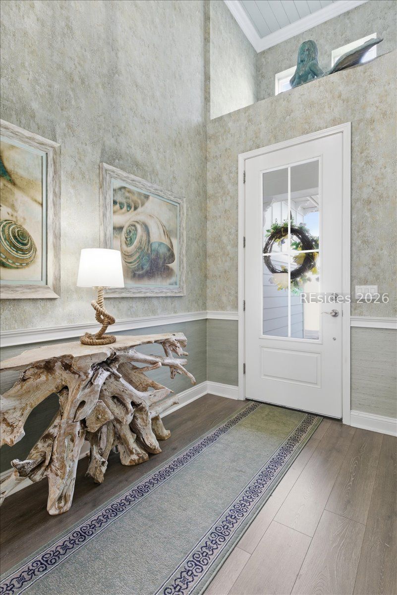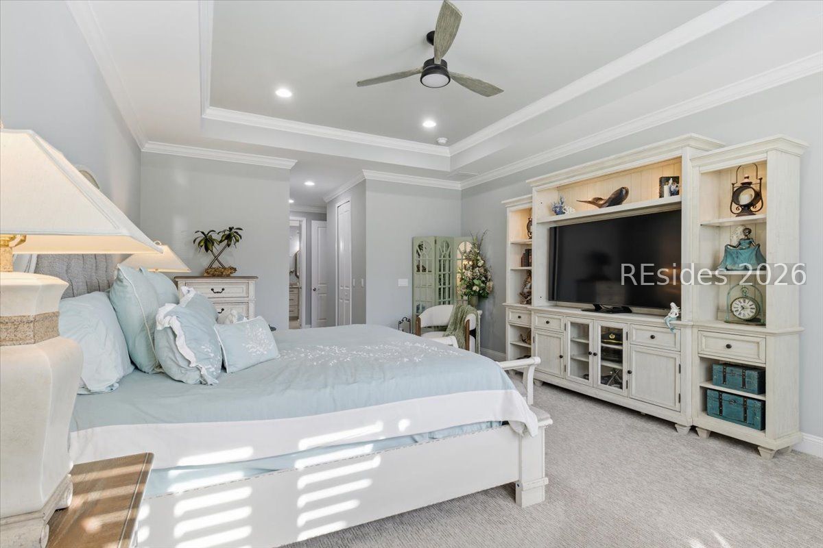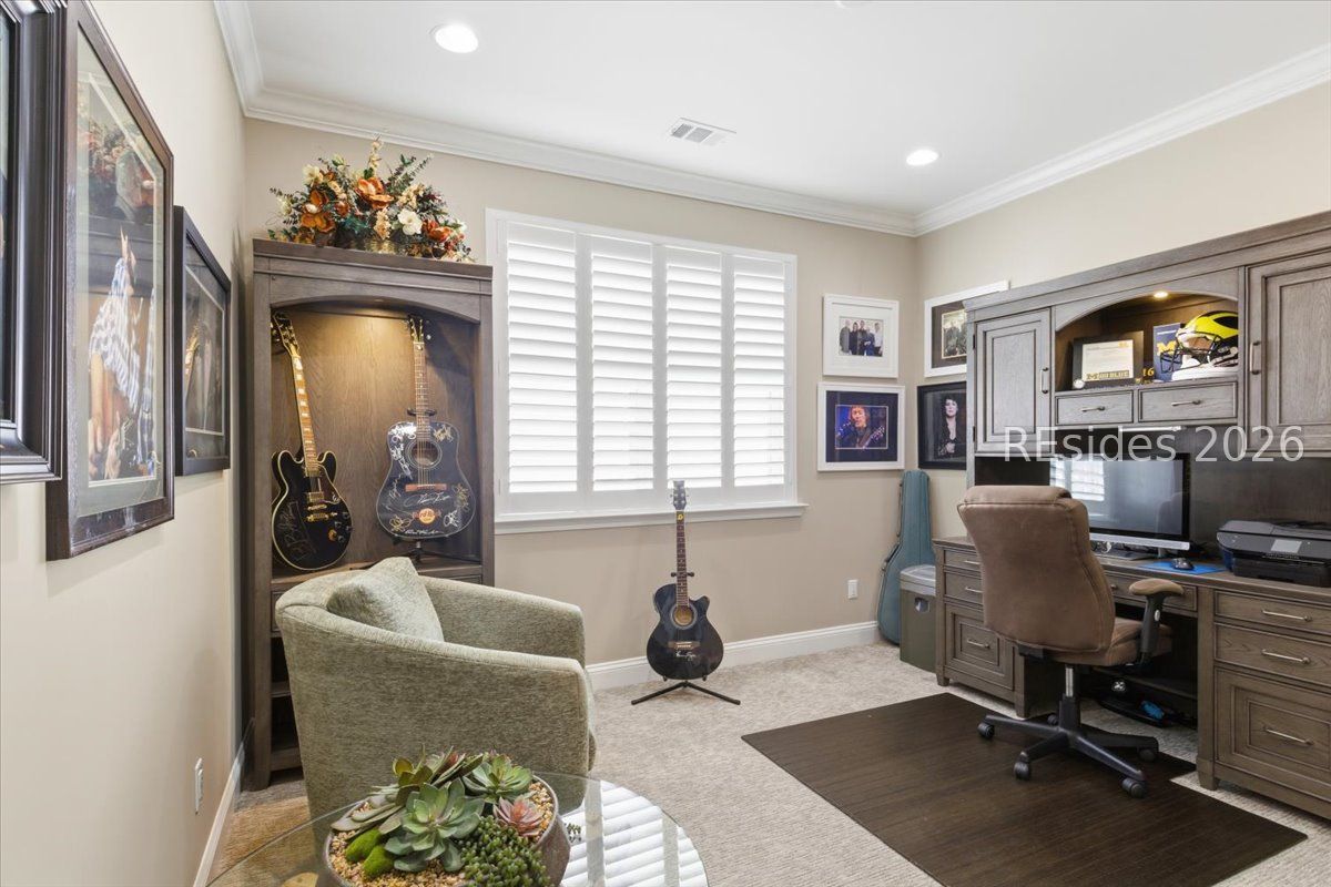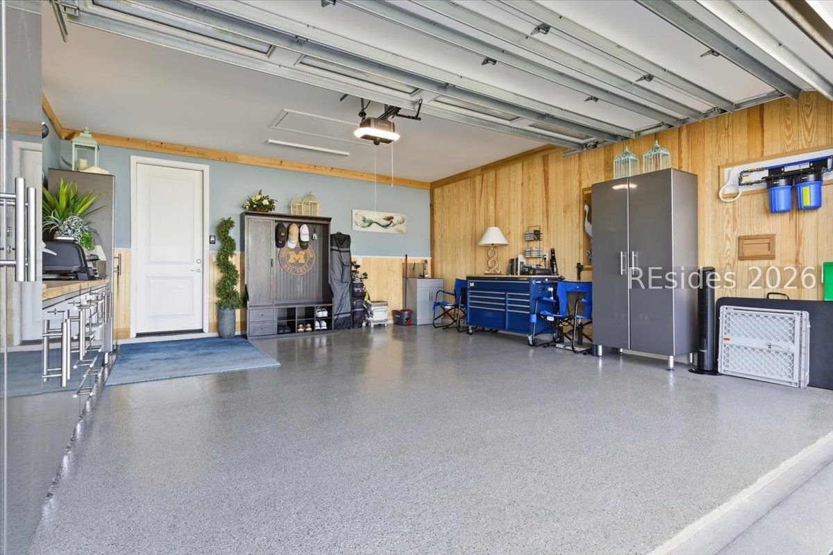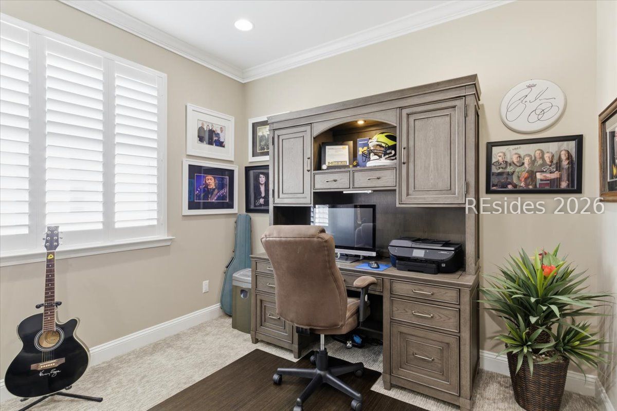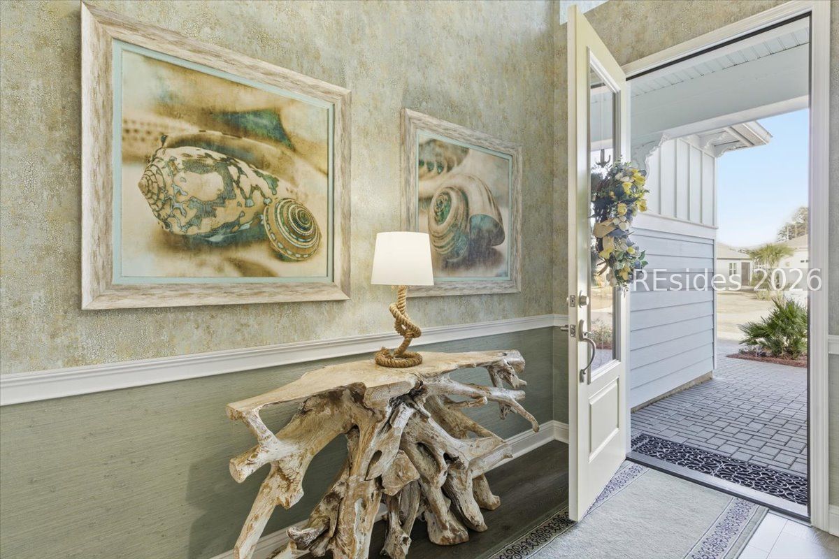 Experience the ultimate & "no worries" & lifestyle in this stunning residence located within the award-winning Latitude Margaritaville. Nestled quietly in Phase 5, the home welcomes you through a sophisticated glass front door into an inviting foyer, where a dramatic 14-foot shiplap ceiling immediately sets a coastal-chic tone. The open-concept layout features rich flooring that leads to a true chef's kitchen, fully equipped with 42-inch cabinetry with built-in pantry, a gas cooktop, a combination microwave and wall oven, soft-close drawers, and convenient pull-out shelving. In the heart of the home, a one-of-a-kind, custom built-in electric fireplace serves as an elegant centerpiece, framed by tiled walls, a designer mantle, and a stereo surround system. High-end finishes abound, including crown molding and plantation shutters throughout, ensuring every corner feels polished and refined. Adding to the coastal elegance, this home features a spacious master suite designed for unwinding. Dual closets provide abundant storage for your island wardrobe. The primary bathroom offers a large walk-in shower with duals inks and water closet. Two additional generously sized bedrooms, each tastefully decorated, offer comfortable accommodations for guests or family with a shared full bath between both bedrooms. The home also includes a well-appointed guest bathroom. A dedicated den, currently configured as a functional home office, provides a quiet retreat for productivity or relaxation, further enhancing the home & versatile floor plan and commitment to the carefree Latitude Margaritaville lifestyle. The transition to outdoor living is seamless via triple sliding glass doors that open to an expansive, birdcage-screened lanai, featuring overhead Florida screening to allow full access use even during those occasional inclement weather days. Here, you can enjoy your morning coffee while taking ins erene, unobstructed views of the pond-the perfect backdrop for the relaxingSouth Carolina Lowcountry lifestyle. Even the garage has been transformed into a functional masterpiece, featuring eco-friending Lifetime Green Coating flooring, wood-covered walls, a built-in home water filtration system, and ample attic storage. This meticulously maintained home offers more than just a place to live. It provides a gateway to the vibrant lifestyle, where world-class amenities, live entertainment, and a tropical atmosphere make every day feel like a vacation. Welcome home!