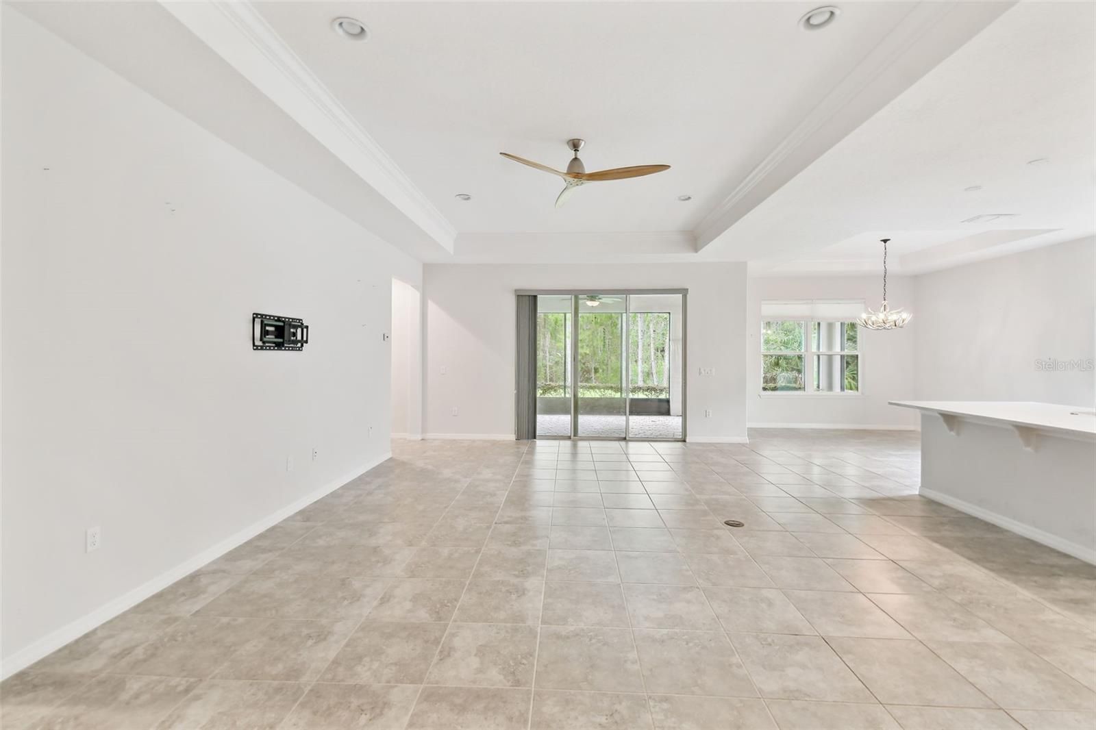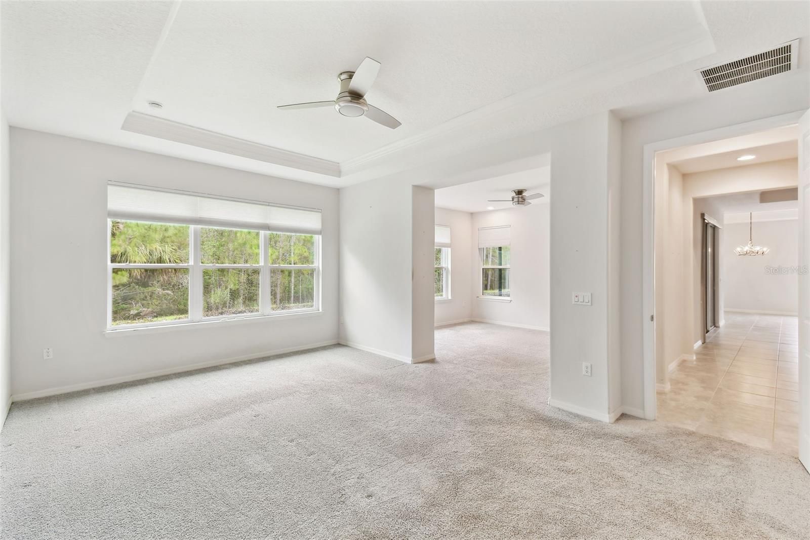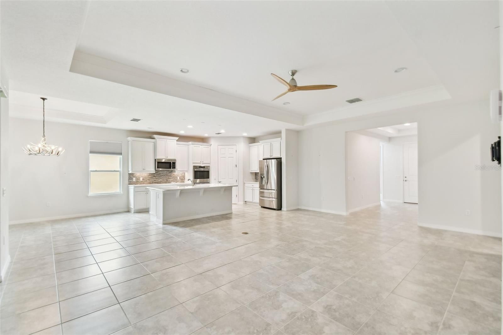 - Ceiling Fan(s), High Ceilings, Kitchen/Family Room Combo, Open Floorplan, Main Level Primary, Solid-Wood Cabinets, Split Bedrooms, Stone Counters, Thermostat, Tray Ceiling(s), Walk-In Closet(s), Window Treatments