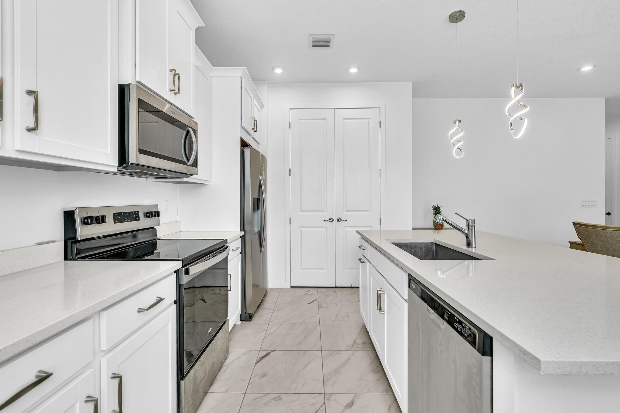 Immediate Occupancy. Built in 2025. Seller relocation forces sale. This Hazel Model has a large (24'x9') covered lanai overlooking a premium extended lot offering space and privacy. Upgraded cabinetry in kitchen and baths plus attractive quartz countertops. Comes with light fixtures, fans, window treatments and more. Stunning tile flooring throughout 1st floor plus a convenient powder room. Upstairs there are 4 bedrooms and 2 nicely appointed baths. Come see!