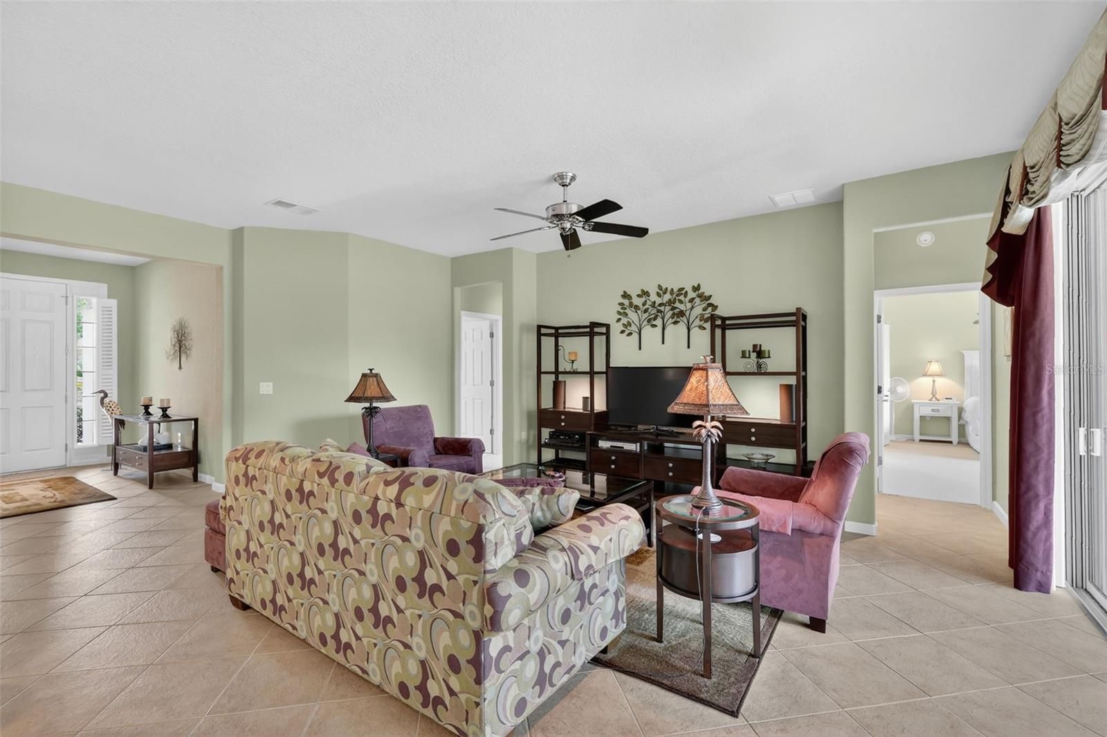 Snowbirds are saying goodbye to this beautifully maintained HANOVER model, gently lived in just 3–4 months every year! Situated on an expansive .33-acre lot, this property offers a large backyard with exceptional privacy and great separation from neighbors. Even better—no homes directly across the street, providing a peaceful and open front view. Major updates include a NEW ROOF (2024) and AIR CONDITIONER (2023), giving peace of mind for years to come. Furniture is included, making this a truly move-in-ready opportunity! Inside, you’ll find tile on the diagonal throughout the main living areas and carpet in the bedrooms. A versatile flex room with French doors offers the perfect space for a home office, den, or hobby room. The kitchen is well-appointed with wood cabinetry featuring pull-outs, under-cabinet lighting, Corian countertops, a pantry, new garbage disposal, breakfast bar, abundant prep space—ideal for everyday living and entertaining. Sliding glass doors from both the living room and kitchen are enhanced with custom sliding shades, leading out to the spacious 10 x 32 lanai. The lanai includes solar shades (stored in the garage when not in use), creating a comfortable outdoor retreat year-round. Additional energy-efficient features include a solar attic fan. Golf cart available separately outside of the home purchase. Don’t miss this rare opportunity to own a lightly lived-in home on an oversized lot with privacy, upgrades, and furnishings included! The amenities in Stone Creek are fabulous 3 clubhouses. The Stonewater cub offers a wine based alcohol bar, pool tables, dart board, patio with fire pit, corn hole and an awesome view of lake. You will not be bored here with all of the choices like soft ball, bocce ball, raised bed gardens, pickle ball, dog park, tennis, a ton of clubs, card games, sauna, resort style pool and indoor pool.