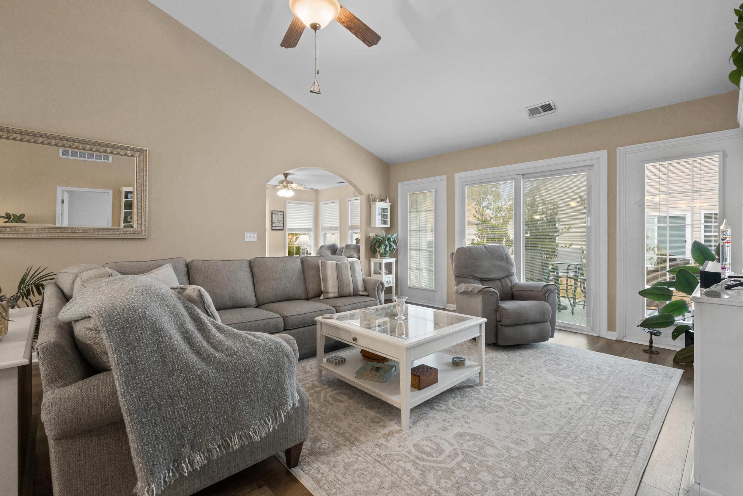 Charming Ranch-Style Home in Gated Myrtle Beach Golf and Yacht Club. Welcome to your dream home in the gated Myrtle Beach Golf and Yacht Club! This ranch-style residence offers a perfect blend of modern living and serene surroundings. Featuring three spacious bedrooms in a desirable split floor plan, this home showcases vaulted ceilings and beautiful archways that enhance its open, airy feel. The living room, equipped with a ceiling fan, provides an inviting space for relaxation and entertainment. Cook with ease in the stylish kitchen, which boasts modern stainless steel appliances, a tiled backsplash, and a cozy breakfast nook, perfect for casual dining. Adjacent is a separate dining area for more formal gatherings. Retreat to the primary bedroom, complete with a ceiling fan, a large walk-in closet and an en-suite bathroom featuring a walk-in shower and dual sinks. Two guest bedrooms, separated by a convenient guest bathroom with a tub-shower combo, provide comfortable accommodations for visitors. Enjoy the convenience of a dedicated laundry room with built-in cabinets and a two-car garage for ample storage. The Carolina room at the rear of the home overlooks the backyard, where you can unwind on the concrete patio. This gated community offers fantastic amenities, including a refreshing pool, tennis courts, basketball courts, and boat storage, catering to an active lifestyle. Located close to the beach, Murrells Inlet Marshwalk, Intracoastal Waterway, and a variety of shopping and dining options, this home combines the best of both coastal living and comfortable community amenities. Don't miss the opportunity to make this charming residence your new home!