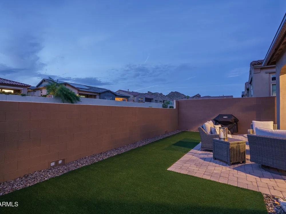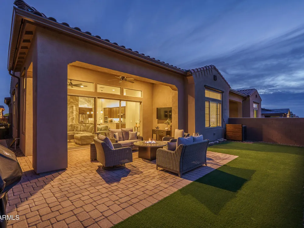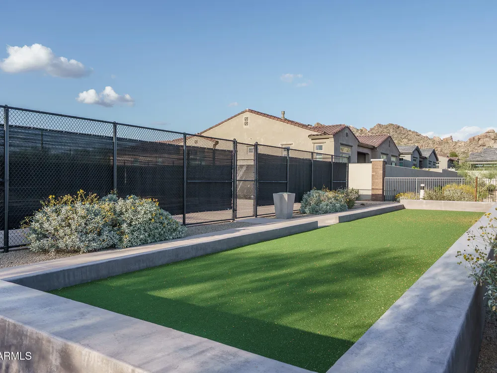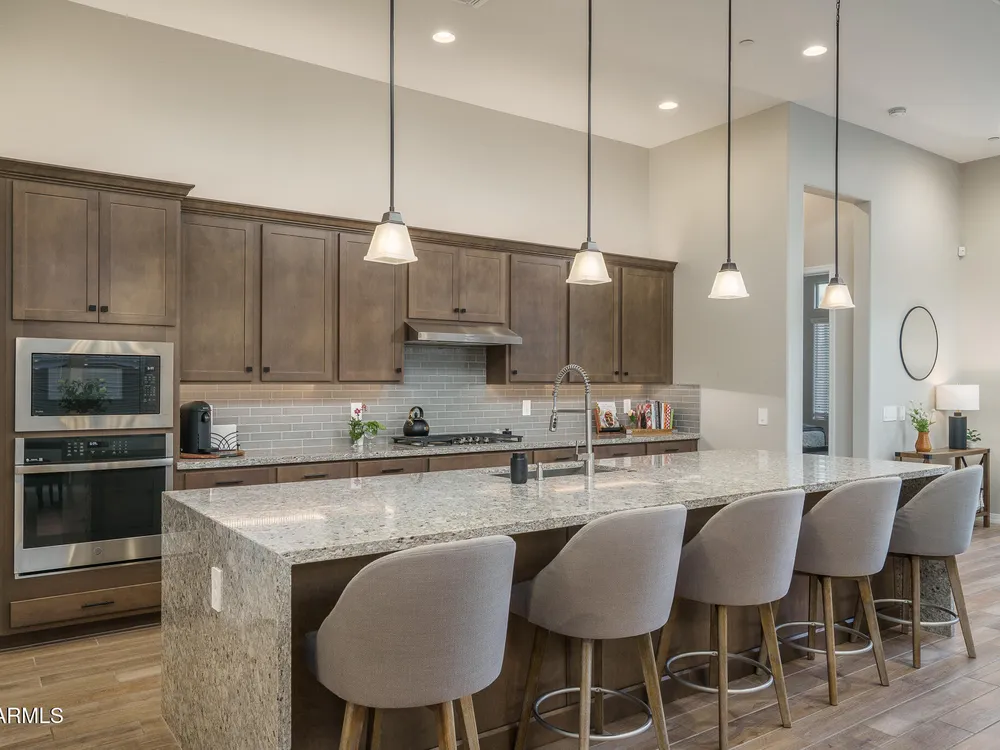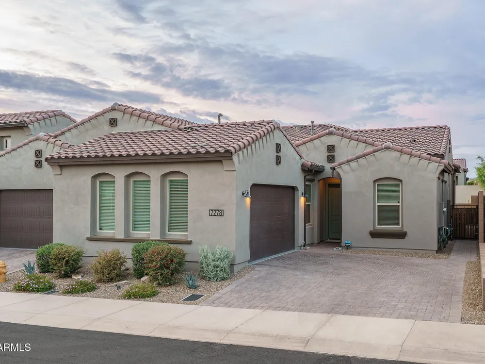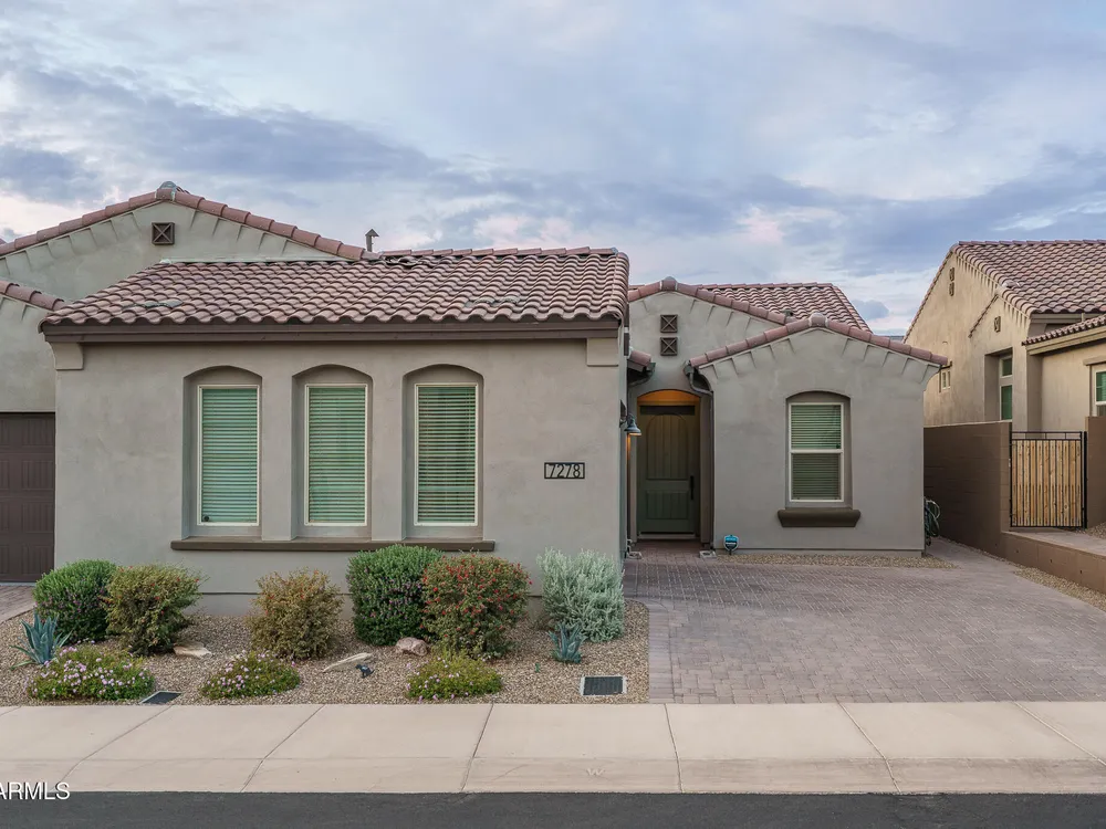 Welcome to this GATED 55+ upscale community of Scottsdale Heights. This pristine home is ideal for a full-or-part time residence and offers 2 bedrooms (each with en-suite baths) plus a den/flex room with double doors and 2.5 baths in 2195 SqFt. Designed for entertaining and hosting family and friends, this floor plan features a large great room and split bedrooms. The kitchen is beautifully designed with maple cabinetry featuring undercabinet lighting, wine refrigerator in island, granite countertops, subway tile backsplash, stainless GE Profile appliances including a gas cooktop and wall ovens, a walk-in pantry, and an extra-large island with waterfall edge, breakfast bar seating for five, and pendant lighting. Multi-panel sliding glass doors open up to the covered patio with ceiling fan and paver floor, and an easy-care backyard with artificial turf, mountain views, and no immediate backyard neighbors, as this home borders desert wash. The primary suite has a private bath with extended dual sink vanity, tiled two-person double-entry spa-shower with rain, wall-mounted, and hand-held showerheads, and a spacious walk-in closet. Other features include a mudroom with cabinets & built-ins, roomy laundry room with cabinets, upgraded lighting fixtures and fans, a water softener, and a 2-car side-entry garage with epoxy floors, a 220V electric car charger, and paver driveway. Amenities in this gated North Scottsdale community include a heated pool and spa with picnic/BBQ ramadas, pickleball and bocce ball courts, and a fenced dog park. Plus enjoy the newly built, desert-inspired park at Ashler Hills, a 17-acre retreat featuring open turf areas, a shaded playground, lighted pickleball and basketball courts, and scenic walking trails. Located at Ashler Hills Drive and 74th Way, this beautifully designed park adds everyday recreation and natural beauty just steps from home. You will love being within walking distance to Safeway, Target, and local restaurants, offering easy access to everyday essentials and dining options.