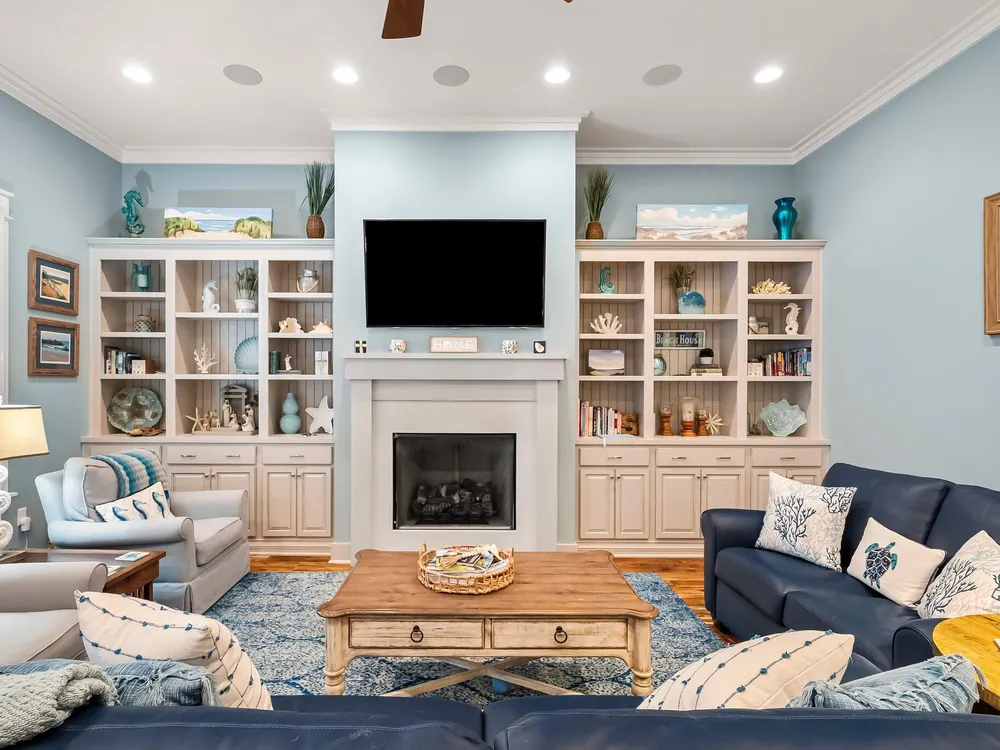 - Built-in Bookcase, Crown Molding, Fireplace, Pantry, Plantation Shutters, Washer/Dryer Hookup, Window Treatments