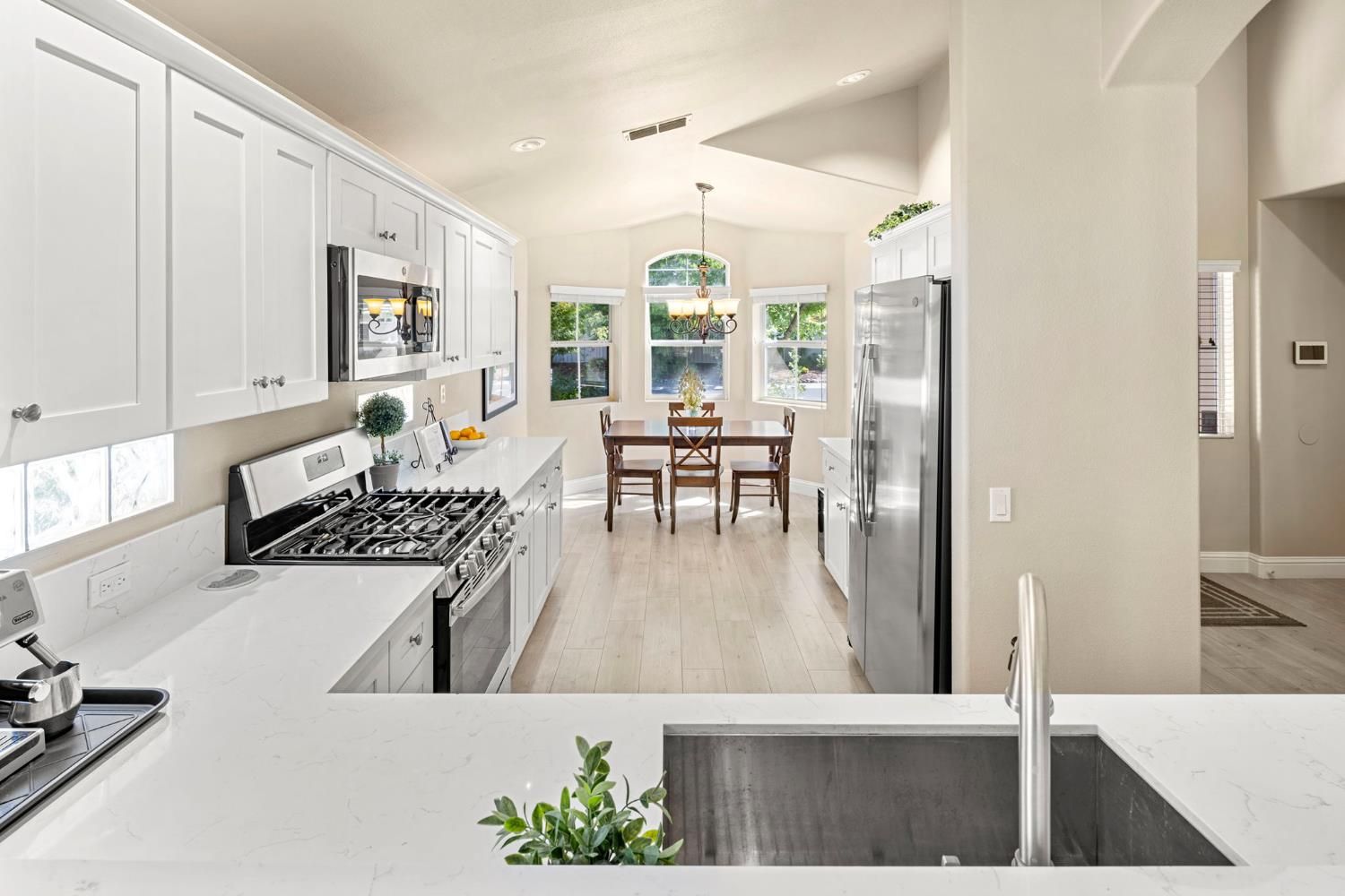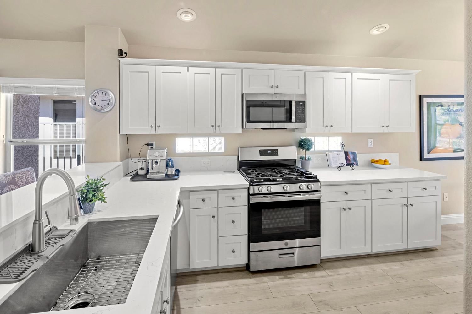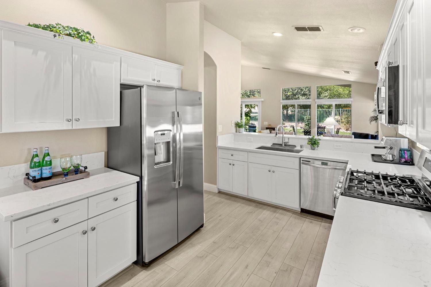 New price on this beautifully remodeled Rosetree model with open space, scenic park views! The kitchen features white cabinets, quartz counter tops, high-end stainless-steel appliances and LED lighting. Both bathrooms have been updated and gorgeous laminate floors flow throughout making this home extra special. Enjoy a covered patio and fully fenced north facing backyard with views of School House Park and nature. The bonuses in this home are endless with closets and a garage equipped with top notch organizers, HVAC 2020, brand new slider, a cozy fireplace and raised garden beds. Come and enjoy Sun City Roseville's Active 55+ community with the Timbers restaurant & bar, fitness center, pools, golf, tennis, pickleball, bocce, walking trails and so many activity clubs! No Mello Roos, low HOA and Roseville Electric.