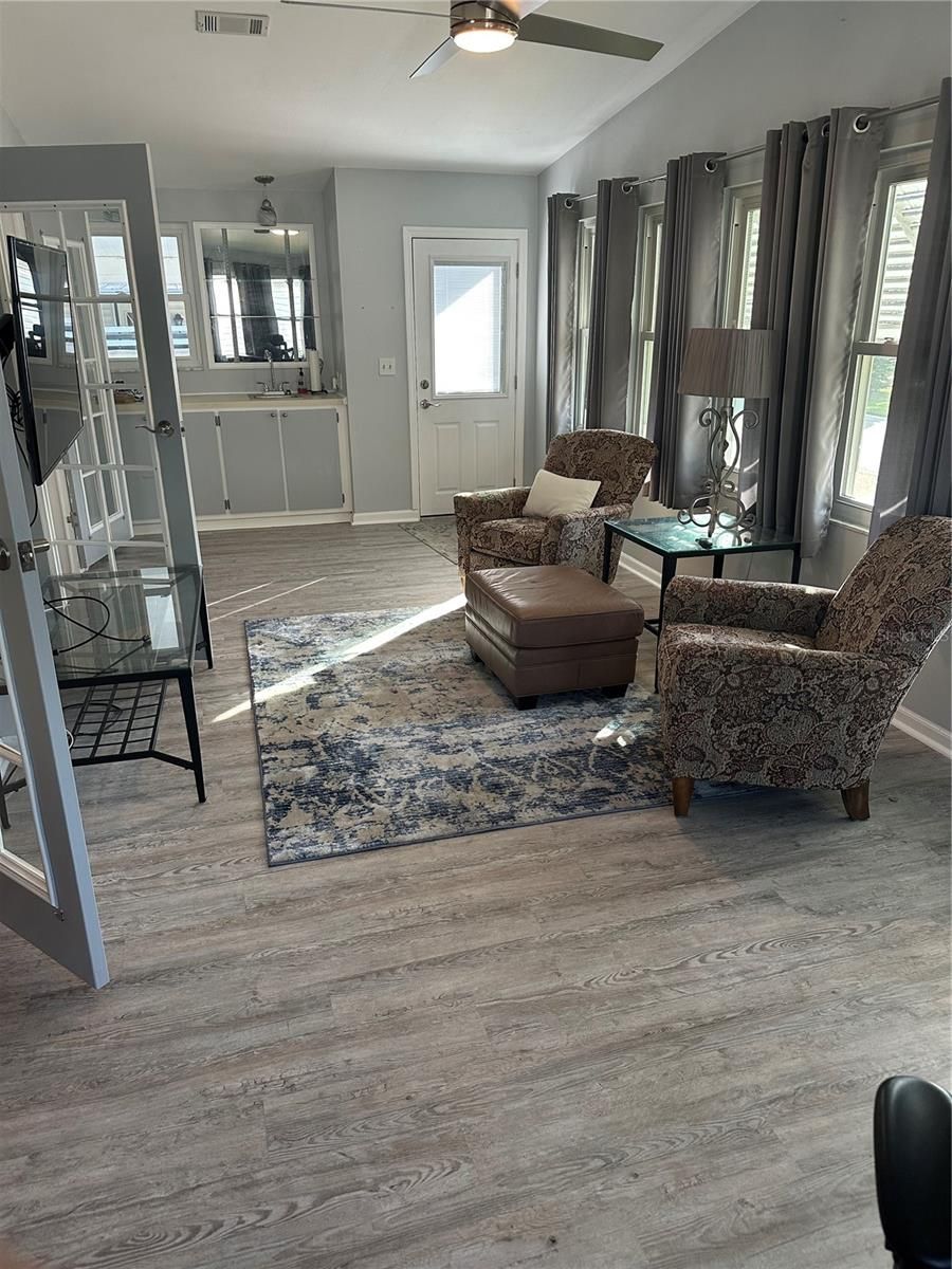 New on the Market. No Bond and No CDD. Located in the beautiful historic area of The Villages and just a short golf cart ride to Spanish Springs Square for your nightly entertainmen with a different band every night This is a spacious 2 bedroom - 2 bath home and features double pane windows , a remodeled kitchen, luxury vinyl flooring - (no carpet), vaulted ceilings, skylights in the kitchen and bathroom, and a family room the width of the house with sink. The carport is covered and wide enough for a car and a golf cart (there is even a golf cart garage with a lot of storage.) There is an enclosed deck to sit and relax. The roof was installed in 2020, and the A/C installed 2016. There are many 9 and 18 hole golf courses, pickleball courts,tennis courts, boccee ball courts, softball fields, bowling lanes, many pools and many recreation centers for your inside activities with pool tables, shopping, restaurants, doctors, and a nearby hospital. Be sure to call today to view this home.