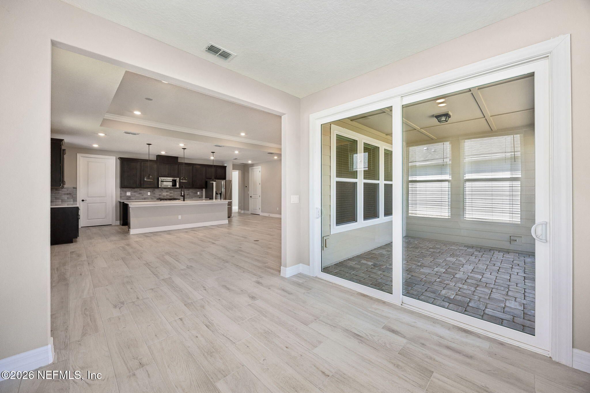 Single Story on pond in gated Del Webb 55+ Wildlight Community! Includes a Flex Room perfect for a dedicated office, wine room, or yoga retreat. Kitchen has stainless appliances, gas cooktop, abundant cabinetry, and large walk-in pantry, making meal prep and storage a breeze. The large island is perfect for casual dining and entertaining, and flowing into the family room and dining area filled with natural light. Primary Suite with spa-like En-Suite Bath has dual vanities and a walk-in shower with dual shower heads. A 2nd bedroom offers access to a full bath for guest's comfort and privacy. Added features include tankless water heater, Taexx Pest Control and Epoxy Garage Flooring. Enjoy relaxing year-round in the four-season room, or indoor-outdoor living on the screened lanai and extended paver patio overlooking the pond. Steps from the trail to the Horizon Club and resort style amenities, including the Helm Restaurant, pool, pickleball, tennis, fire pit, exercise room, and The Farm.