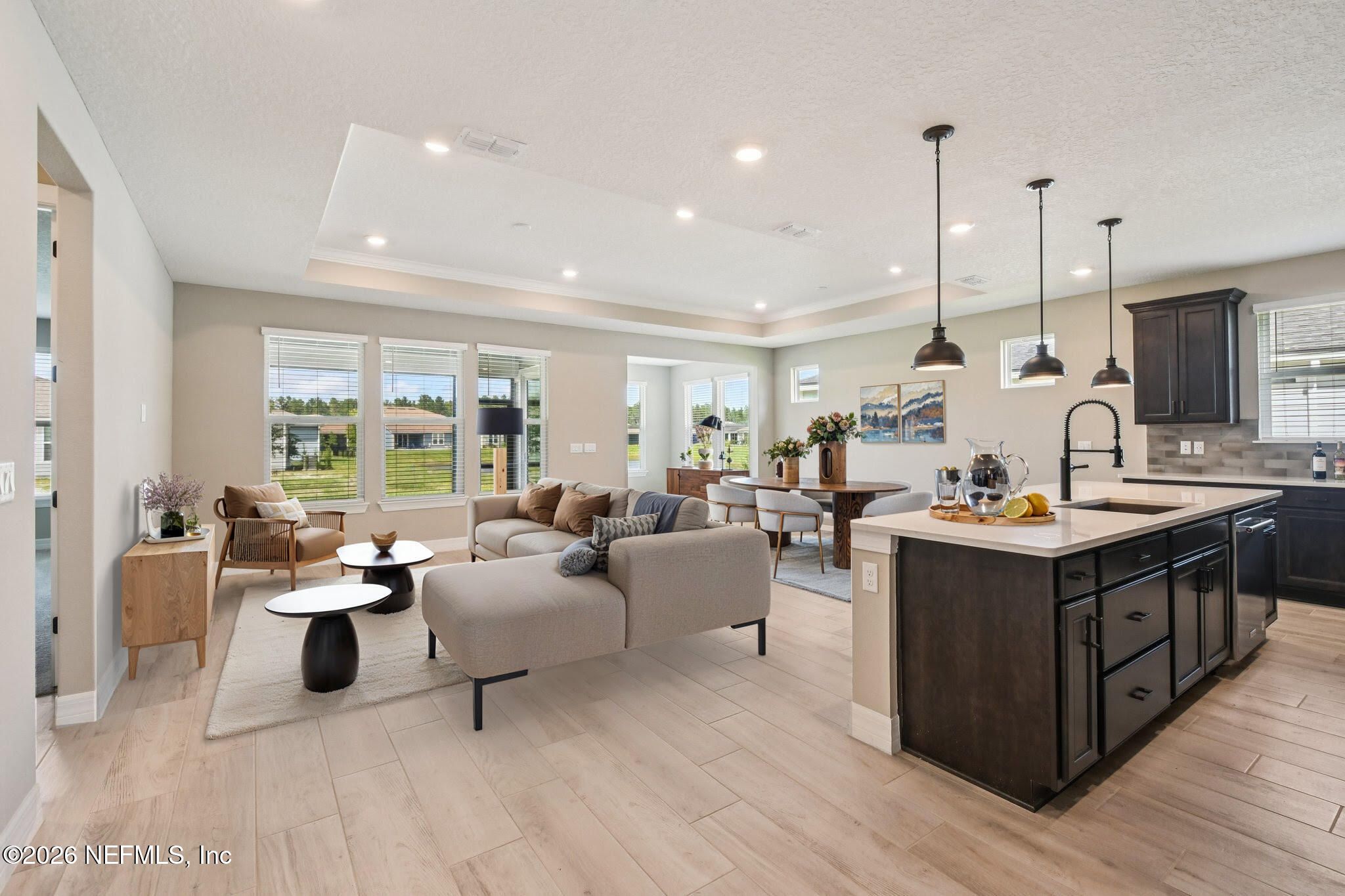 Live the Florida 55+ lifestyle now—no waiting on builders! This beautifully barely lived-in 2024 Del Webb Wildlight villa features 2 bedrooms plus a flex room (ideal office or 3rd bedroom), quartz chef's kitchen with gas appliances, sunroom, and extended screened patio overlooking a peaceful pond and fountain. Upgrades include tray ceilings, custom lighting, extended epoxy-finish garage, laundry with sink, and tankless water heater. Steps from the clubhouse path with access to resort-style dining, fitness, and pool. Modern luxury + location + move-in ready convenience.