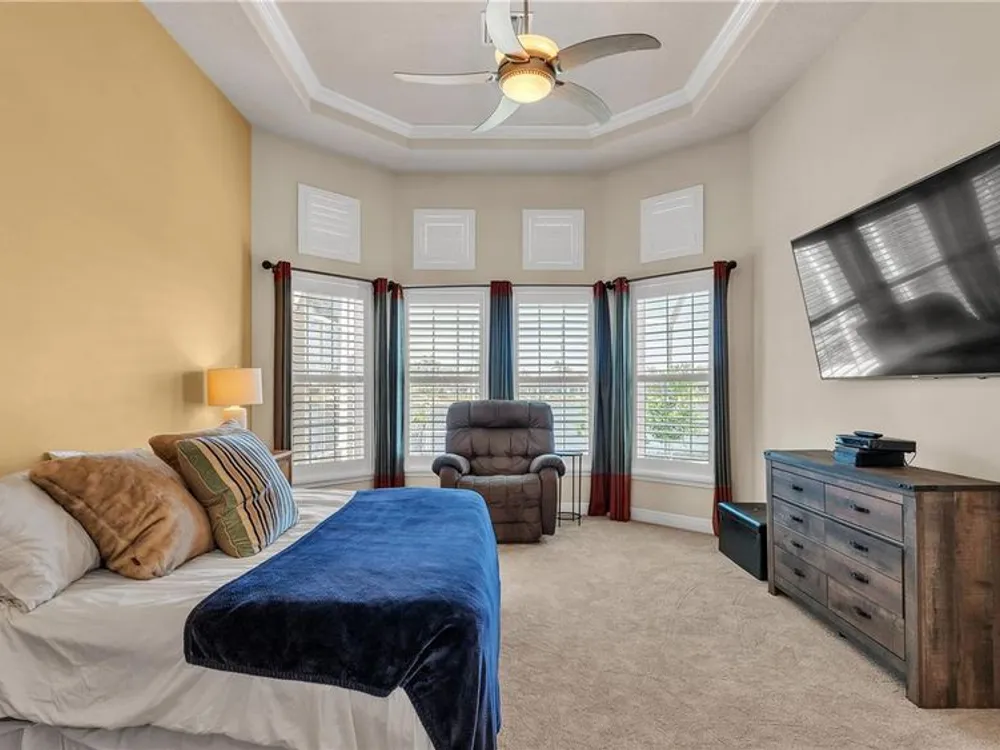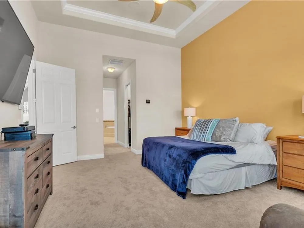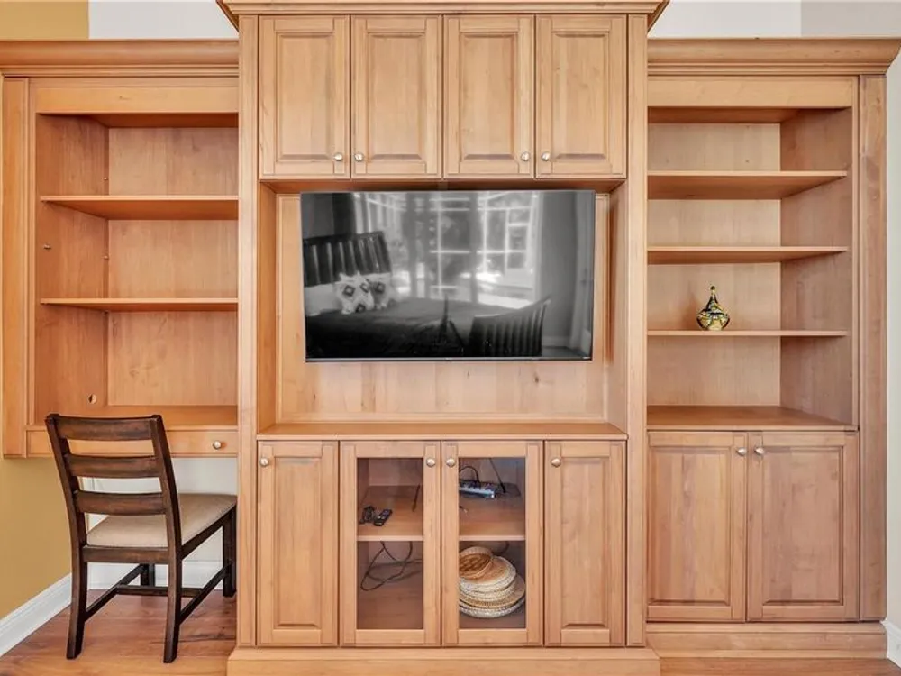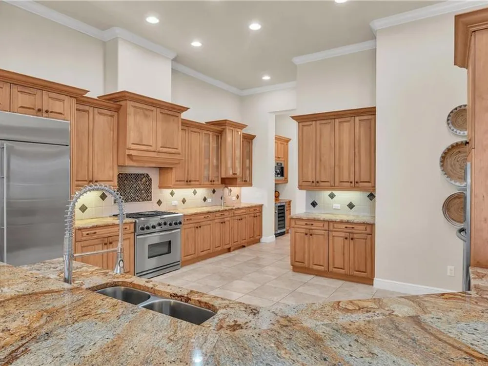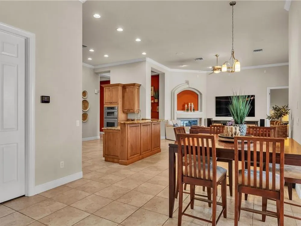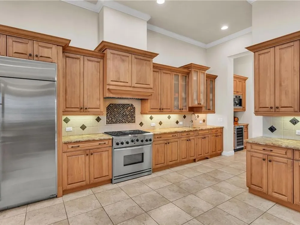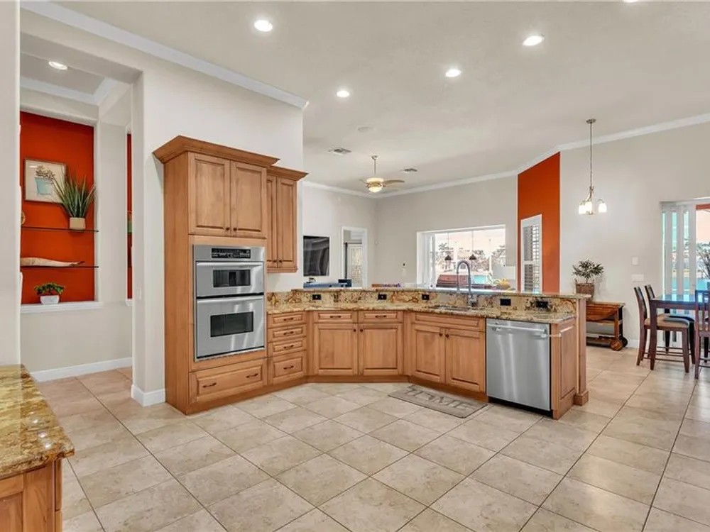 - Built-in Features, Ceiling Fan(s), Coffered Ceiling(s), Crown Molding, Dry Bar, Eat-in Kitchen, High Ceilings, Open Floorplan, In-Wall Pest Control, Main Level Primary, Split Bedrooms, Stone Counters, Thermostat, Tray Ceiling(s), Walk-In Closet(s), Window Treatments