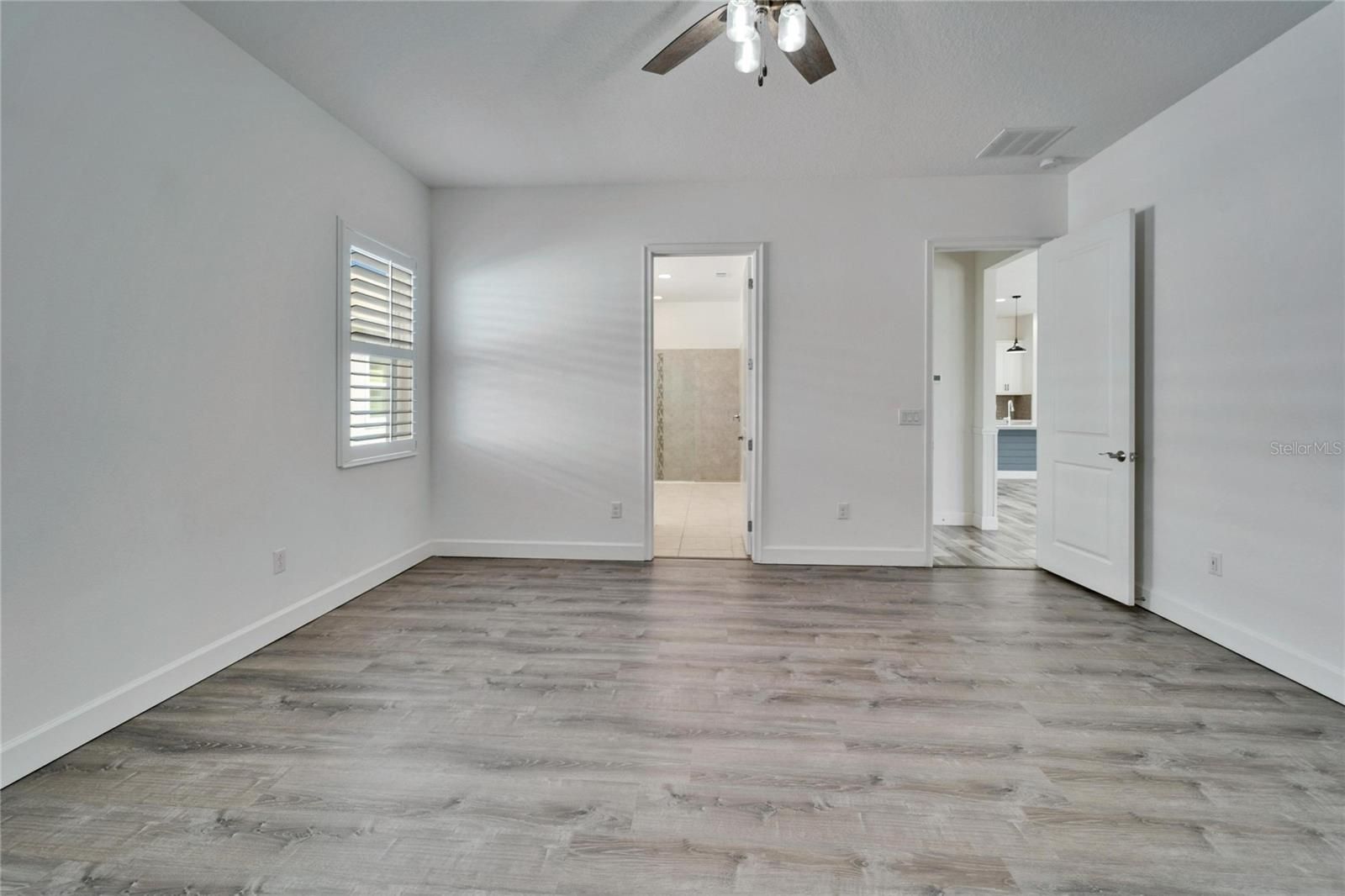 - Ceiling Fan(s), Kitchen/Family Room Combo, Open Floorplan, Main Level Primary, Solid Surface Counters, Solid-Wood Cabinets, Thermostat, Walk-In Closet(s)