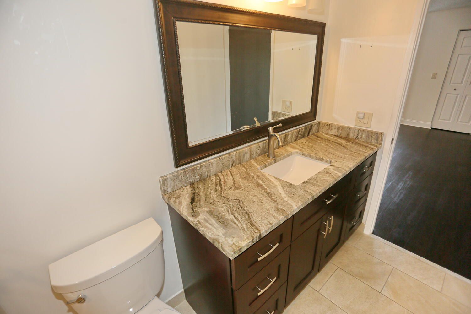 Seller is offering the buyer a three month credit for condo fees at closing. Storm Smart Screen provides hurricane protection for gusts up to 150 mph on the balcony. A/C 2021, water heater 2022. Some rooms have been virtually staged. Lancaster model 2 bedroom, 2 bath condo with lake views. Updated kitchen features soft close wood cabinetry, quartz countertops, GE Profile fingerprint-resistant black stainless appliances, and a pantry with pull-out drawers. Duralux waterproof luxury vinyl flooring throughout the entire unit, offering both style and durability. Primary suite includes an updated en suite bath, 2 walk-in closets and direct access to the balcony. Updated 2nd bath provides access from both the second bedroom and hallway, enhancing functionality and privacy.