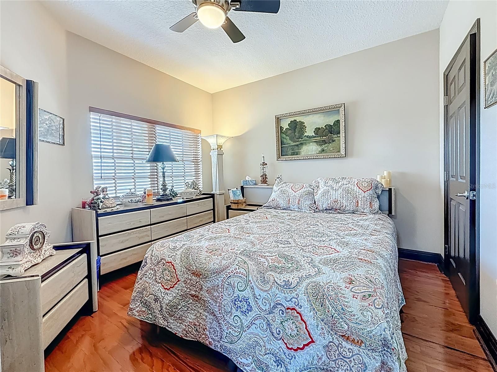 - Ceiling Fan(s), Eat-in Kitchen, High Ceilings, Open Floorplan, Main Level Primary, Solid-Wood Cabinets, Split Bedrooms, Stone Counters, Walk-In Closet(s), Window Treatments
