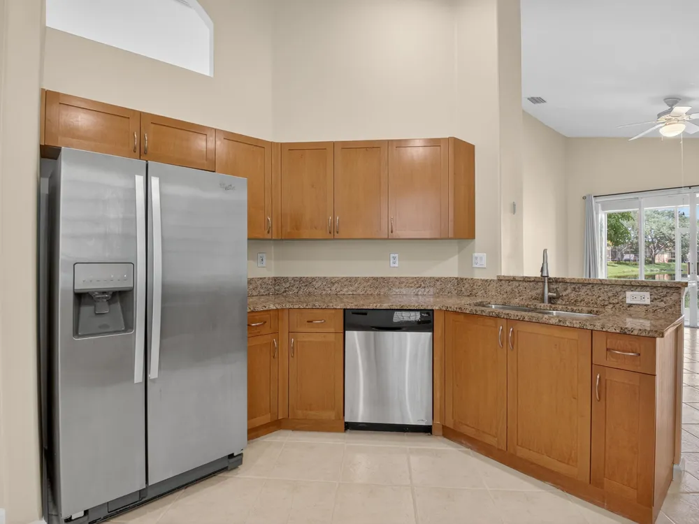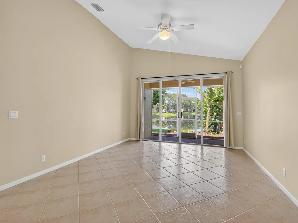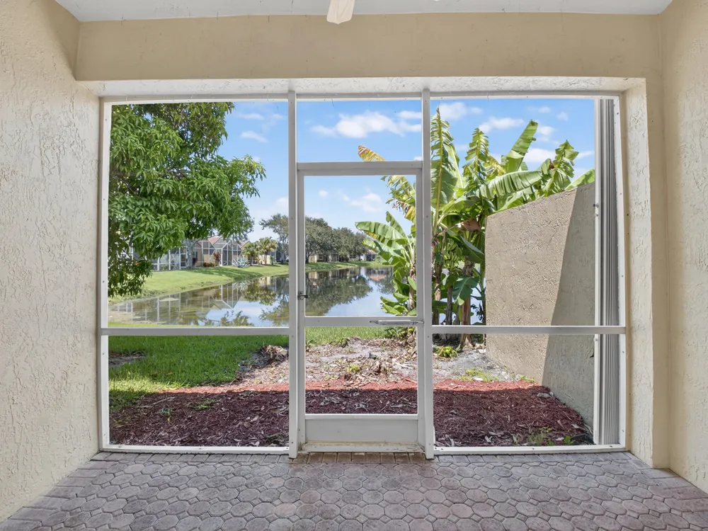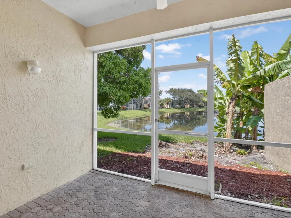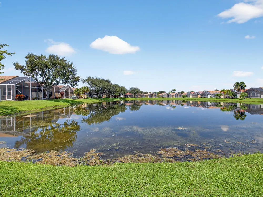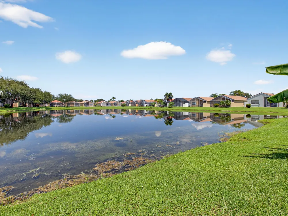 Enjoy peaceful water view from this beautifully maintained 2 bedroom 2 bath +plus den home in this sought after 55+ guard gated community of Vizcaya in sunny Delray Beach.This bright and airy residence features entertainment size living and dining room, updated kitchen with wood cabinets, granite countertops Large family room to play all your games or watch TV.. Spacious primary bedroom with ensuite bath . Screened lanai overlooking the tranquil water for rest and relaxation.This home offers easy access to updated clubhouse , fitness center, theater, card rooms, olympic size pool, tennis, pickleball, and bocce and full social calendar.Low HOA, Full time manager and social director make this the ideal community at a fabulous price.