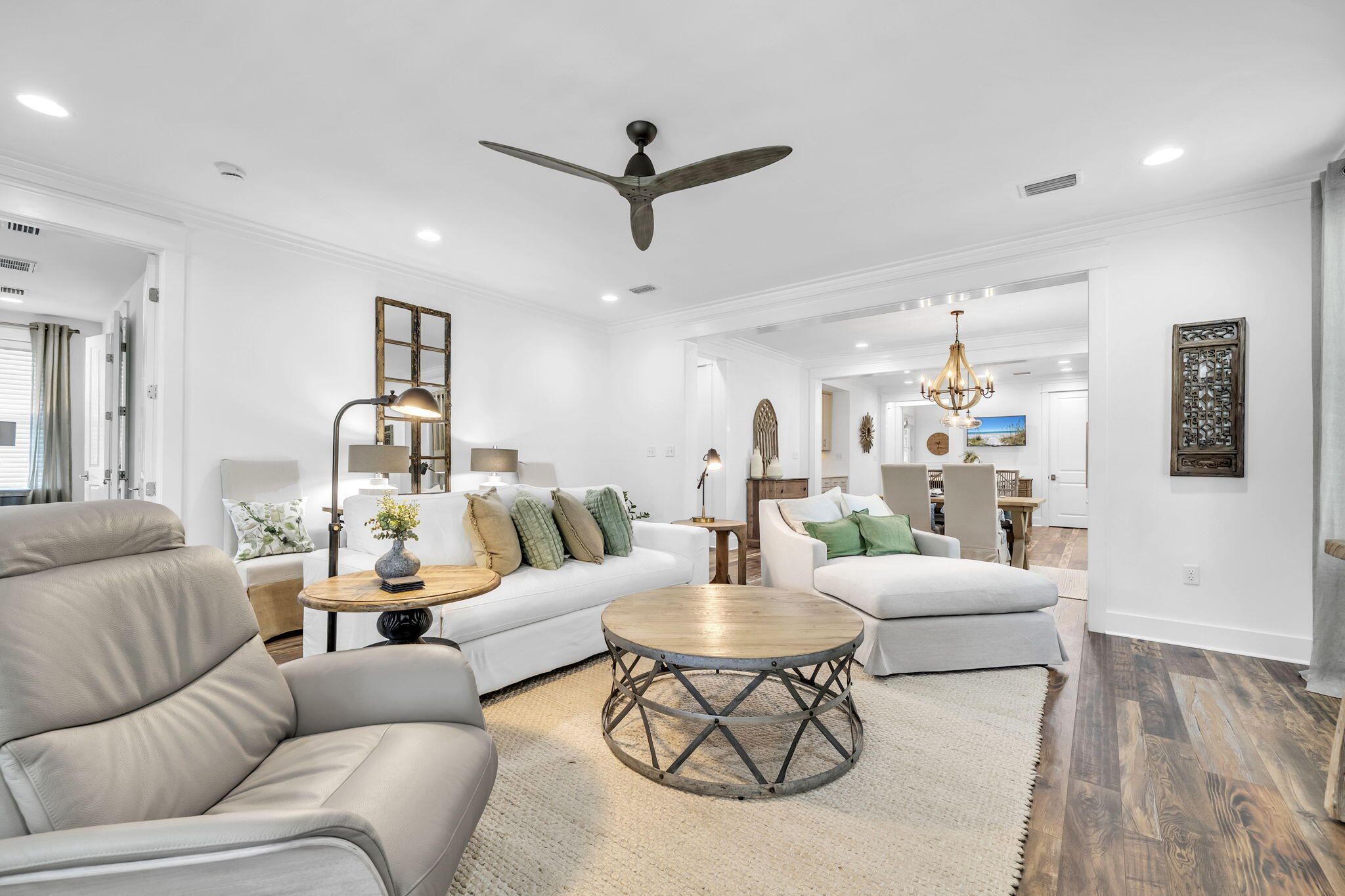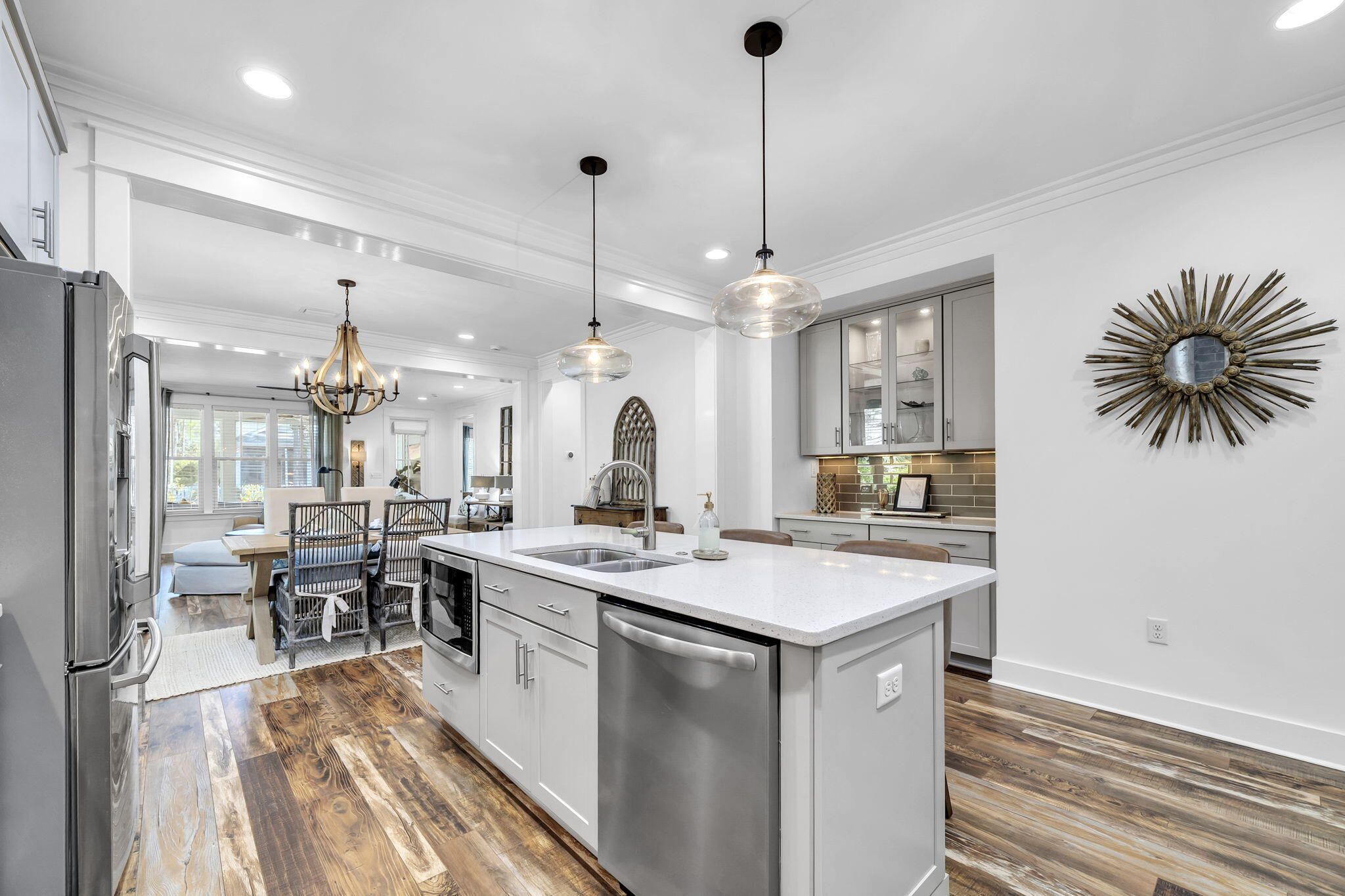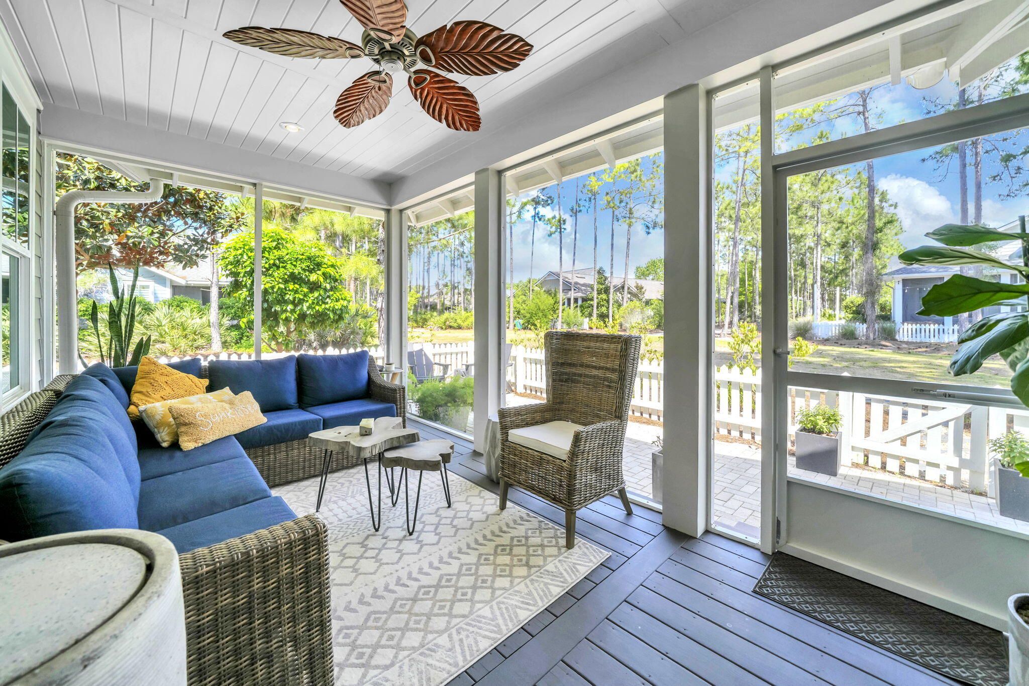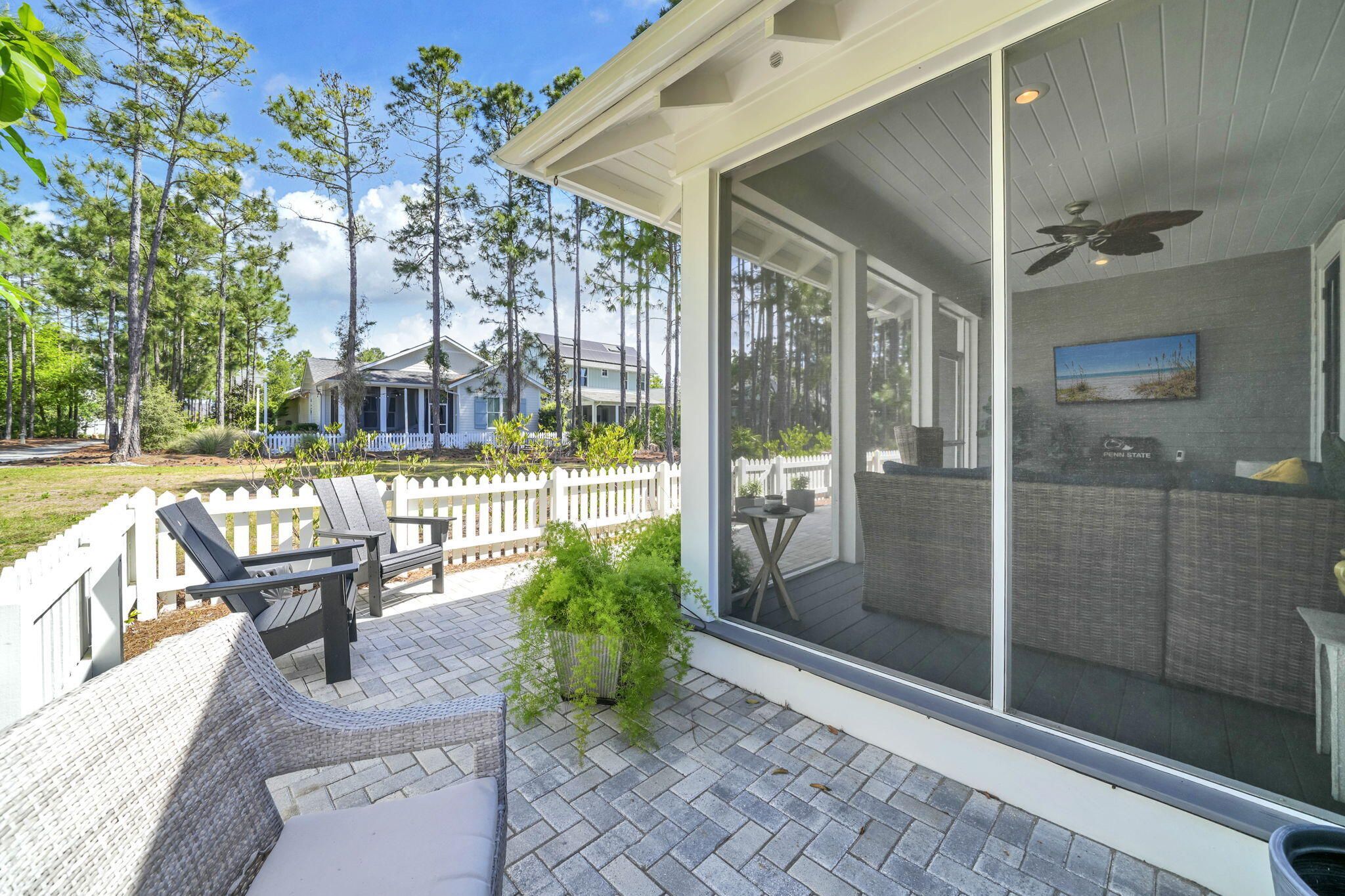 Immaculate single-level 3-bedroom, 3-bath home built by Huff Homes in the sought-after Winter Garden phase of Watersound Origins. This move-in-ready residence sits on a premium lot featuring a side buffer, white picket fenced yard, and beautiful views of landscaped park and natural green space that backs directly to walking trails. Enjoy easy walkability to the Village Commons fitness center and resort-style pool. The open-concept floor plan seamlessly connects the living, dining, and kitchen areas, complete with stainless steel appliances, gas cooktop, large island with breakfast bar, and custom bar nook. Wood-look vinyl plank flooring runs throughout most of the home. The primary suite includes a soaking tub, seamless glass-and-tile shower, double vanity, and custom walk-in closet. Two additional bedrooms and two full baths complete the single-level layout. Outside, a screened porch opens to a paved patio for effortless outdoor living. This rental-restricted community offers golf, tennis, pickleball, gym, pool, playground, and kayaking on Lake Powell with access to 30A beaches near Camp Helen State Park. Just minutes from Scenic Highway 30A's white-sand beaches, dining, and shops. Perfect as a primary residence or second home, this Huff Homes gem delivers exceptional lifestyle, location, and value in a desirable single-level 3 bed, 3 bath floor plan.