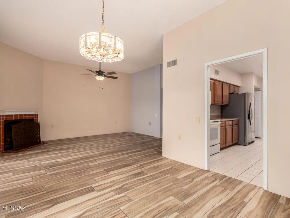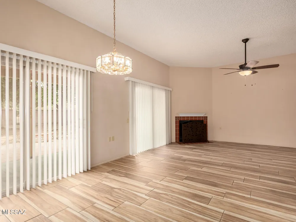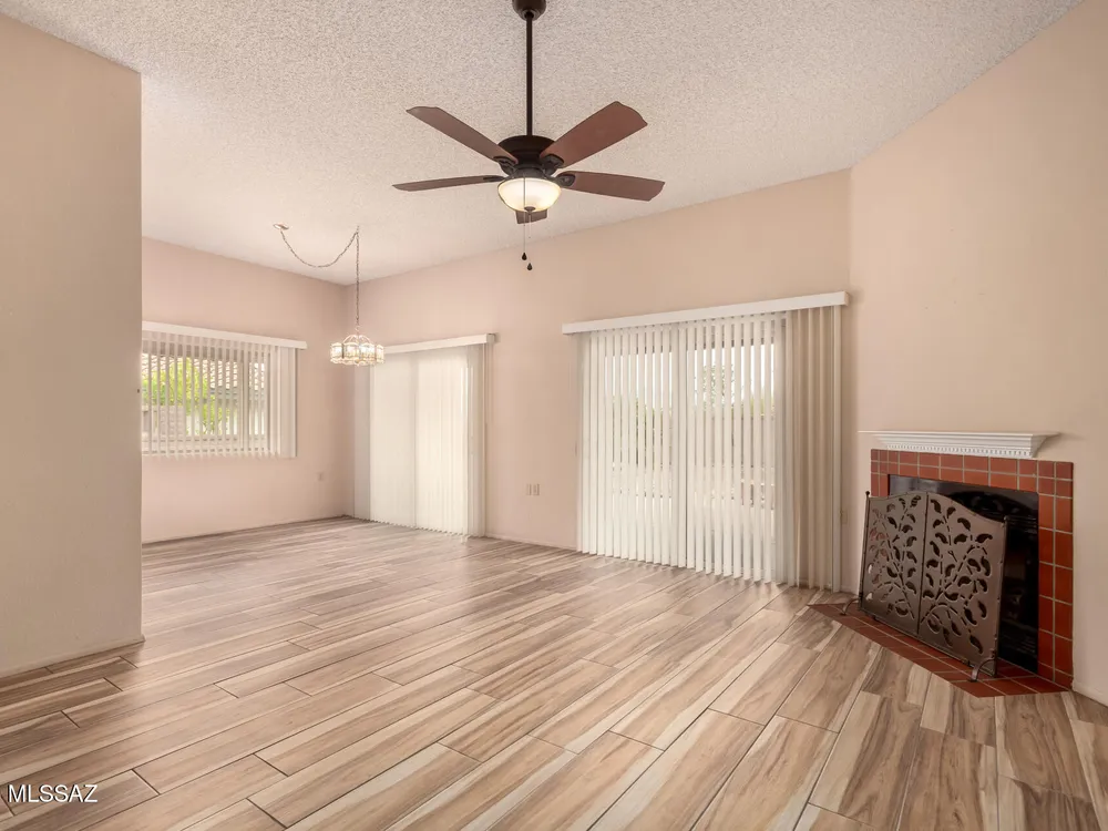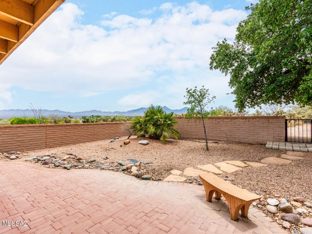 Located in a 55+ community, this inviting home offers comfort and charm! Inside you'll find a cozy wood burning fireplace that adds warmth and character to the living space. The kitchen features a breakfast nook that looks out onto a wraparound covered porch, perfect for enjoying quiet mornings. The dining area flows seamlessly into the living room, creating a welcoming space for gatherings. With 2 bedrooms and 2 bathrooms, the layout is both practical and flexible. The second bedroom doubles as a den and with a Murphy bed, it easily transforms into a comfortable guest room. The primary bedroom includes a walk-in closet for added convenience. Step outside to a beautifully landscaped backyard, ideal for relaxing or entertaining while taking in the peaceful Santa Rita Mountain views.