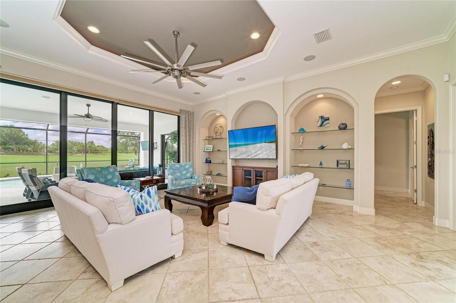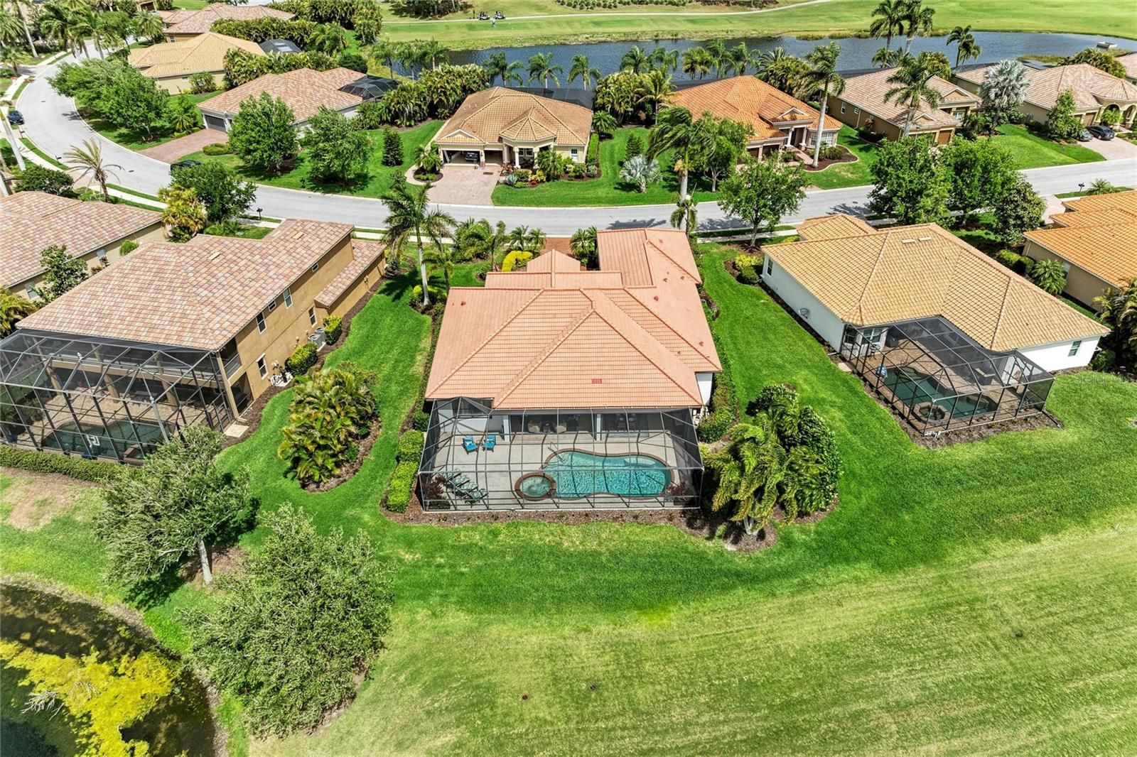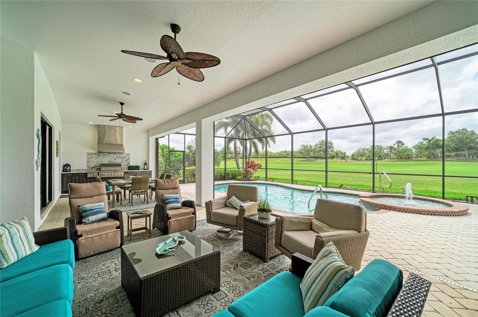 Experience timeless sophistication in this CUSTOM RESIDENCE BY JOHN CANNON, ideally situated within the gated resort community of River Strand Golf & Country Club! One of only a select few custom-built homes in the community, this distinguished GOLF DEEDED property showcases masterful craftsmanship, innovative architectural design and beautiful refined finishes. From the moment of arrival, the home’s striking curb appeal makes a lasting impression, highlighted by a three-car side-entry garage. Inside, a grand foyer unfolds into an expansive great room, where dual arched built-ins, soaring 10-foot illuminated tray ceilings, and triple 10-foot sliding glass doors create an atmosphere of elegance bathed in natural light. A formal dining room offers an inviting setting for elevated entertaining, while the OPEN CONCEPT main living space seamlessly blends casual dining with a beautifully appointed chef’s kitchen. Featuring a generous center island and breakfast bar, this space is thoughtfully designed to overlook both the main living area and the outdoor retreat beyond. Step outside to a breathtaking private oasis. The custom SALTWATER POOL AND SPA are framed by an expansive lanai designed for luxurious outdoor living. A substantial covered area provides the perfect setting for alfresco dining and entertaining, complemented by a fully equipped outdoor kitchen. The PANORAMIC VIEWS are truly extraordinary—offering sweeping, private vistas of the 8th hole of the Tributary Course, along with tranquil water views that span the entire rear of the property. The primary suite is a serene sanctuary, privately situated behind double doors and occupying its own wing of the home. This grand retreat features dual walk-in closets, a spacious spa-inspired en-suite with dual vanities, and direct access to the lanai. On the opposite side of the residence, two well-appointed guest bedrooms provide comfort and privacy—one with its own en-suite bath, and the other conveniently located adjacent to a full bath that also serves as a pool bath. A richly appointed office with custom wood built-ins offers a refined space for work or study. Throughout the home, HURRICANE IMPACT WNDOWS and newer installed (2024) lanai screens provide peace of mind. Every detail has been meticulously curated—from the oversized laundry room with built-in sink to plantation shutters, custom ceiling features, designer lighting, and custom paint finishes. Set on a generously sized, private homesite, this remarkable residence embodies the very essence of luxury living. River Strand Golf & Country Club is celebrated for its 27 holes of impeccable championship golf and has recently unveiled a stunning 9 MILLION DOLLAR RENOVATION OF IT'S CLUBHOUSE, RESTAURANT, grill room, and tiki bar—elevating the resort lifestyle. Residents enjoy an exceptional array of amenities, including two resort-style pools and spas, six additional satellite pools, two fitness centers, and premier tennis and pickleball facilities. A vibrant calendar of curated social events and wellness activitiies is also offered year round. Perfectly positioned just minutes from I-75 and the Marketplace, featuring an expanding selection of shopping and dining and close to the beautiful beaches of the Gulf Coast! Discover an unparalleled standard of living where luxury, leisure, and location converge—so come and experience River Strand at its absolute finest, you may never want to leave!