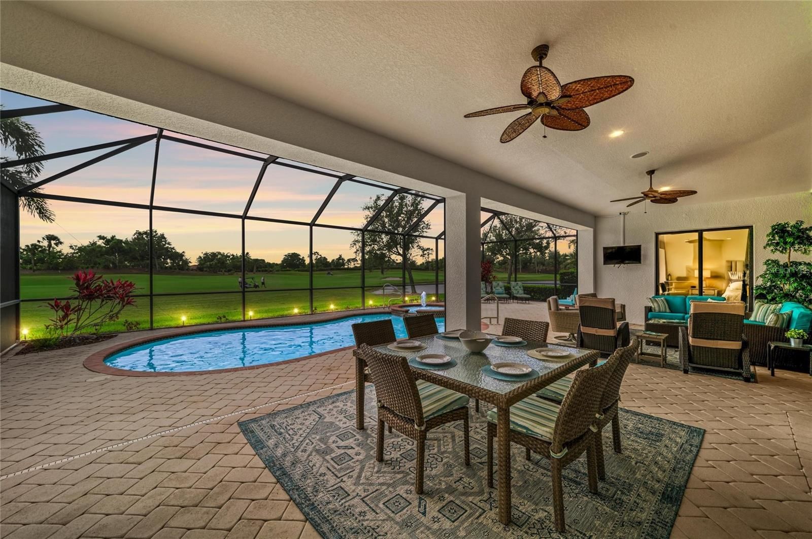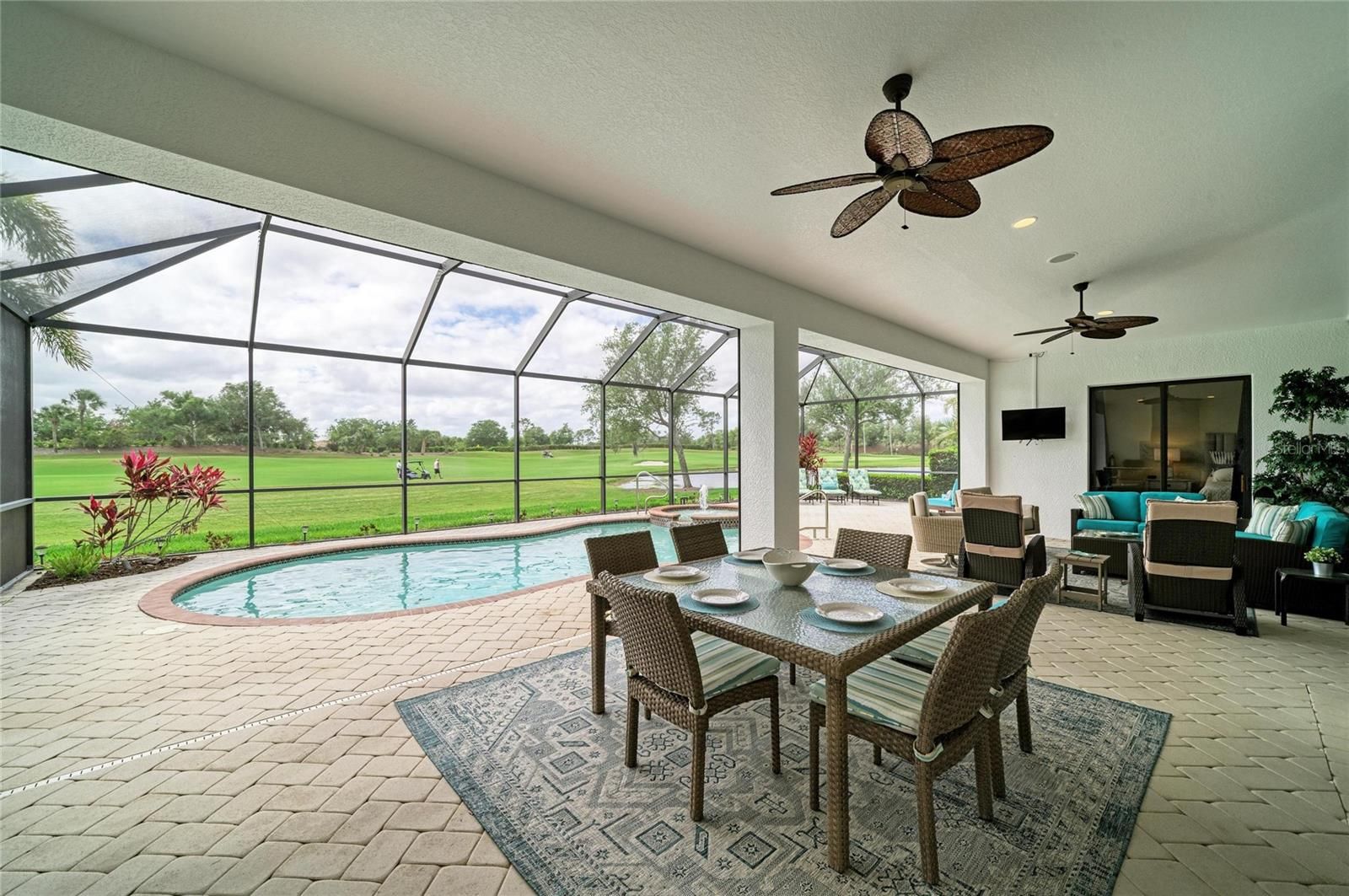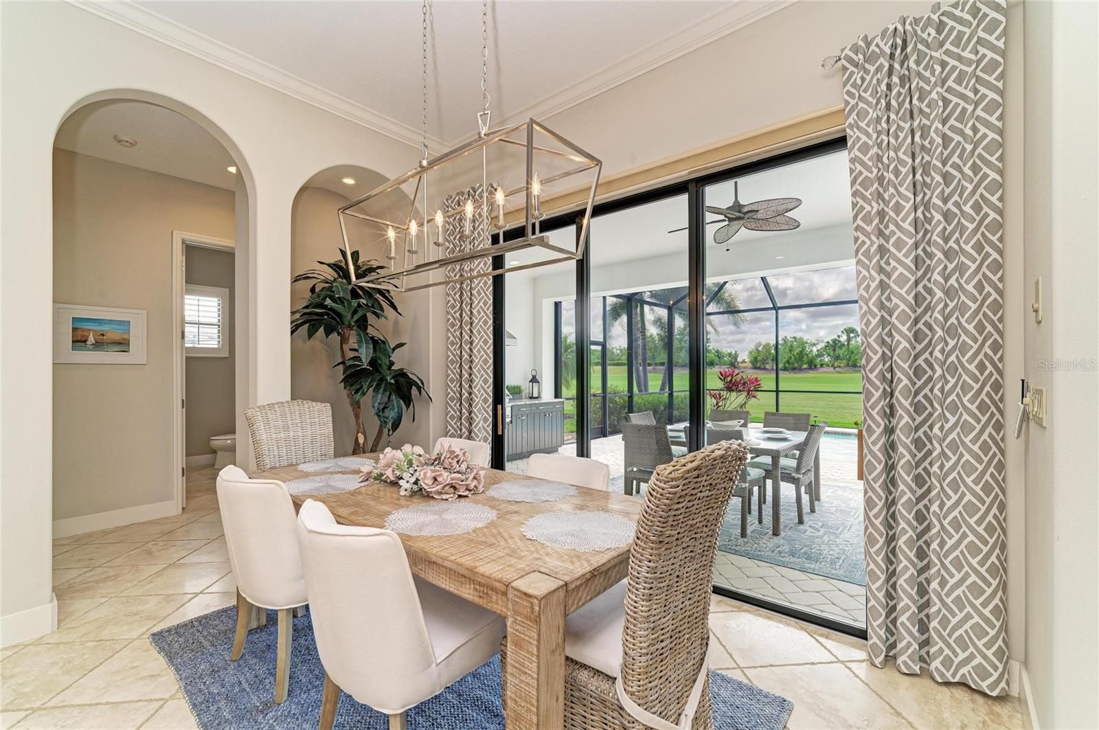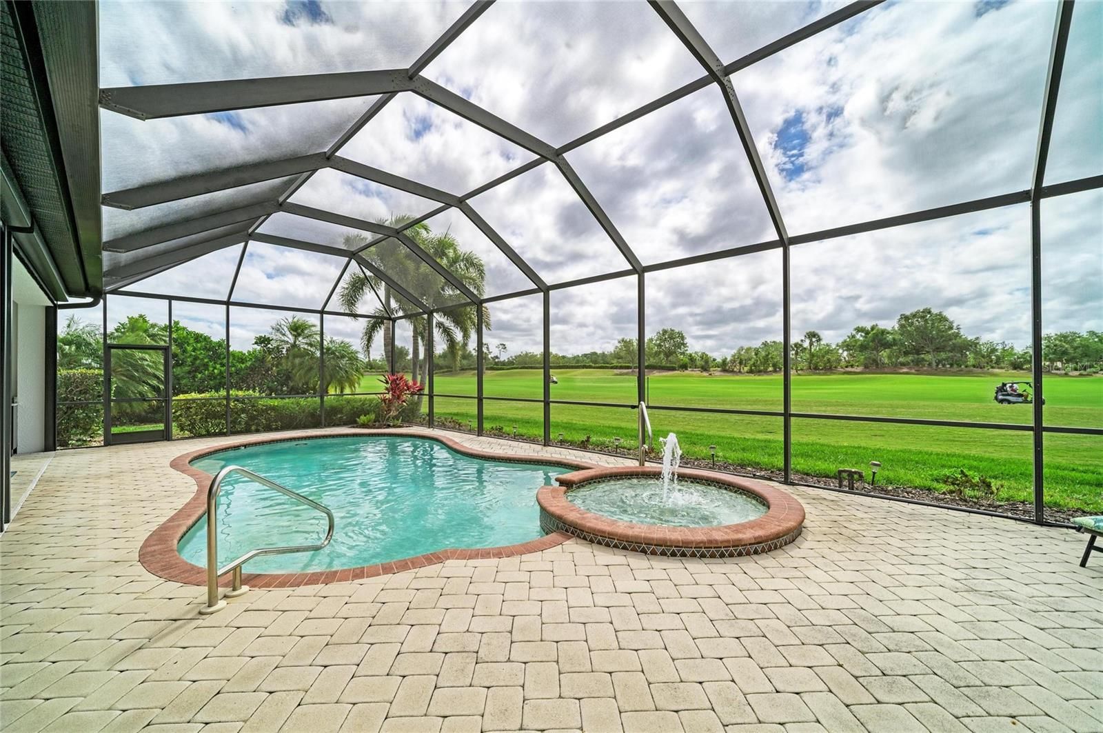 Experience timeless sophistication in this CUSTOM RESIDENCE BY JOHN CANNON, ideally situated within the gated resort community of River Strand Golf & Country Club! One of only a select few custom-built homes in the community, this distinguished GOLF DEEDED property showcases masterful craftsmanship, innovative architectural design and beautiful refined finishes. From the moment of arrival, the home’s striking curb appeal makes a lasting impression, highlighted by a three-car side-entry garage. Inside, a grand foyer unfolds into an expansive great room, where dual arched built-ins, soaring 10-foot illuminated tray ceilings, and triple 10-foot sliding glass doors create an atmosphere of elegance bathed in natural light. A formal dining room offers an inviting setting for elevated entertaining, while the OPEN CONCEPT main living space seamlessly blends casual dining with a beautifully appointed chef’s kitchen. Featuring a generous center island and breakfast bar, this space is thoughtfully designed to overlook both the main living area and the outdoor retreat beyond. Step outside to a breathtaking private oasis. The custom SALTWATER POOL AND SPA are framed by an expansive lanai designed for luxurious outdoor living. A substantial covered area provides the perfect setting for alfresco dining and entertaining, complemented by a fully equipped outdoor kitchen. The PANORAMIC VIEWS are truly extraordinary—offering sweeping, private vistas of the 8th hole of the Tributary Course, along with tranquil water views that span the entire rear of the property. The primary suite is a serene sanctuary, privately situated behind double doors and occupying its own wing of the home. This grand retreat features dual walk-in closets, a spacious spa-inspired en-suite with dual vanities, and direct access to the lanai. On the opposite side of the residence, two well-appointed guest bedrooms provide comfort and privacy—one with its own en-suite bath, and the other conveniently located adjacent to a full bath that also serves as a pool bath. A richly appointed office with custom wood built-ins offers a refined space for work or study. Throughout the home, HURRICANE IMPACT WNDOWS and newer installed (2024) lanai screens provide peace of mind. Every detail has been meticulously curated—from the oversized laundry room with built-in sink to plantation shutters, custom ceiling features, designer lighting, and custom paint finishes. Set on a generously sized, private homesite, this remarkable residence embodies the very essence of luxury living. River Strand Golf & Country Club is celebrated for its 27 holes of impeccable championship golf and has recently unveiled a stunning 9 MILLION DOLLAR RENOVATION OF IT'S CLUBHOUSE, RESTAURANT, grill room, and tiki bar—elevating the resort lifestyle. Residents enjoy an exceptional array of amenities, including two resort-style pools and spas, six additional satellite pools, two fitness centers, and premier tennis and pickleball facilities. A vibrant calendar of curated social events and wellness activitiies is also offered year round. Perfectly positioned just minutes from I-75 and the Marketplace, featuring an expanding selection of shopping and dining and close to the beautiful beaches of the Gulf Coast! Discover an unparalleled standard of living where luxury, leisure, and location converge—so come and experience River Strand at its absolute finest, you may never want to leave!