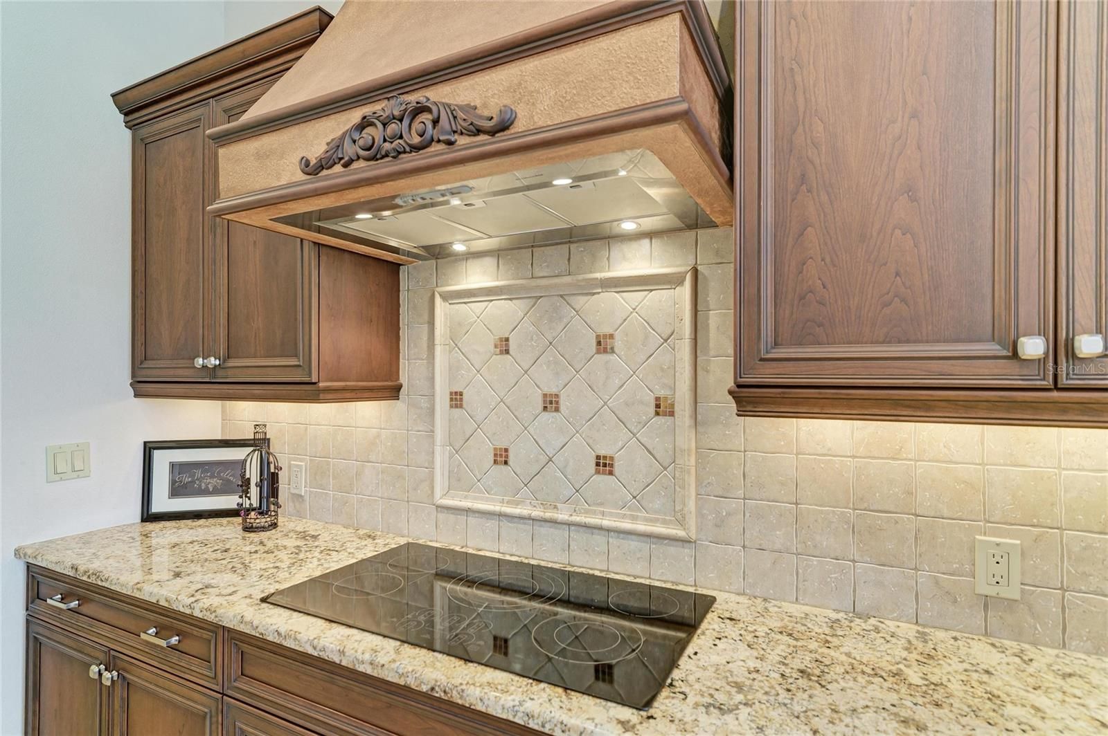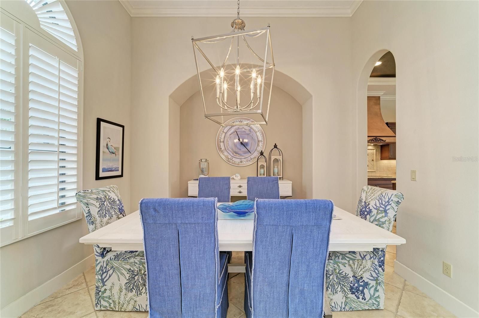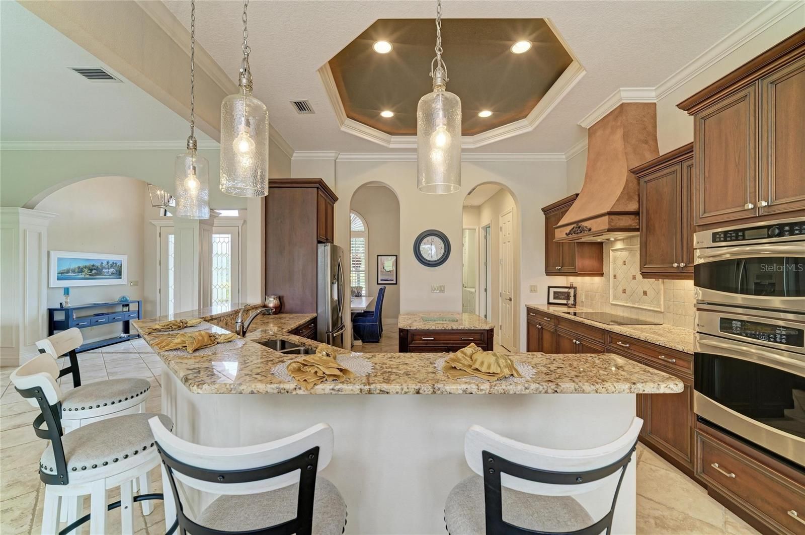 - Ceiling Fan(s), Coffered Ceiling(s), Crown Molding, Eat-in Kitchen, High Ceilings, Kitchen/Family Room Combo, Living/Dining Room, Open Floorplan, Solid Surface Counters, Solid-Wood Cabinets, Thermostat, Tray Ceiling(s), Walk-In Closet(s), Window Treatments