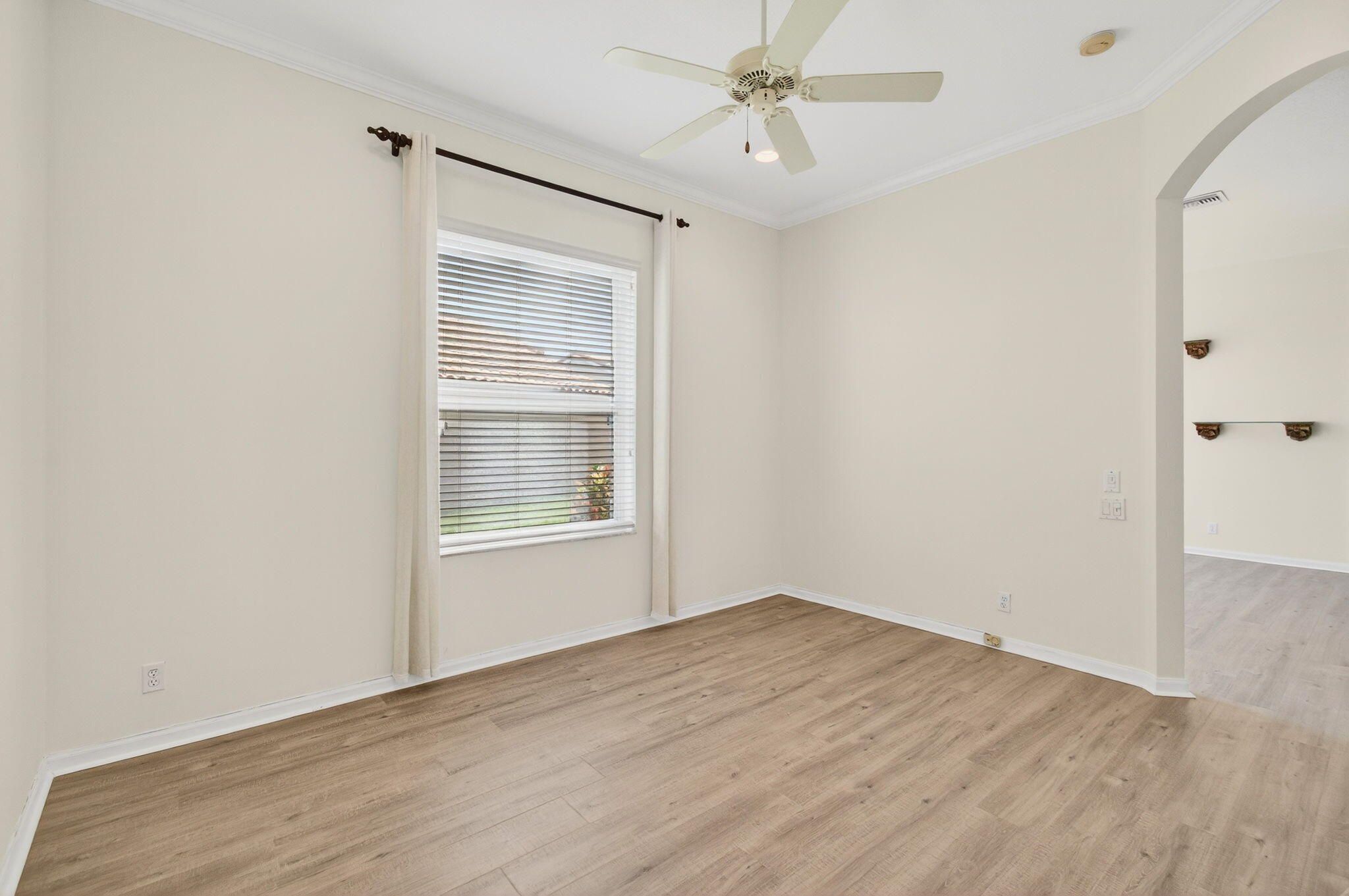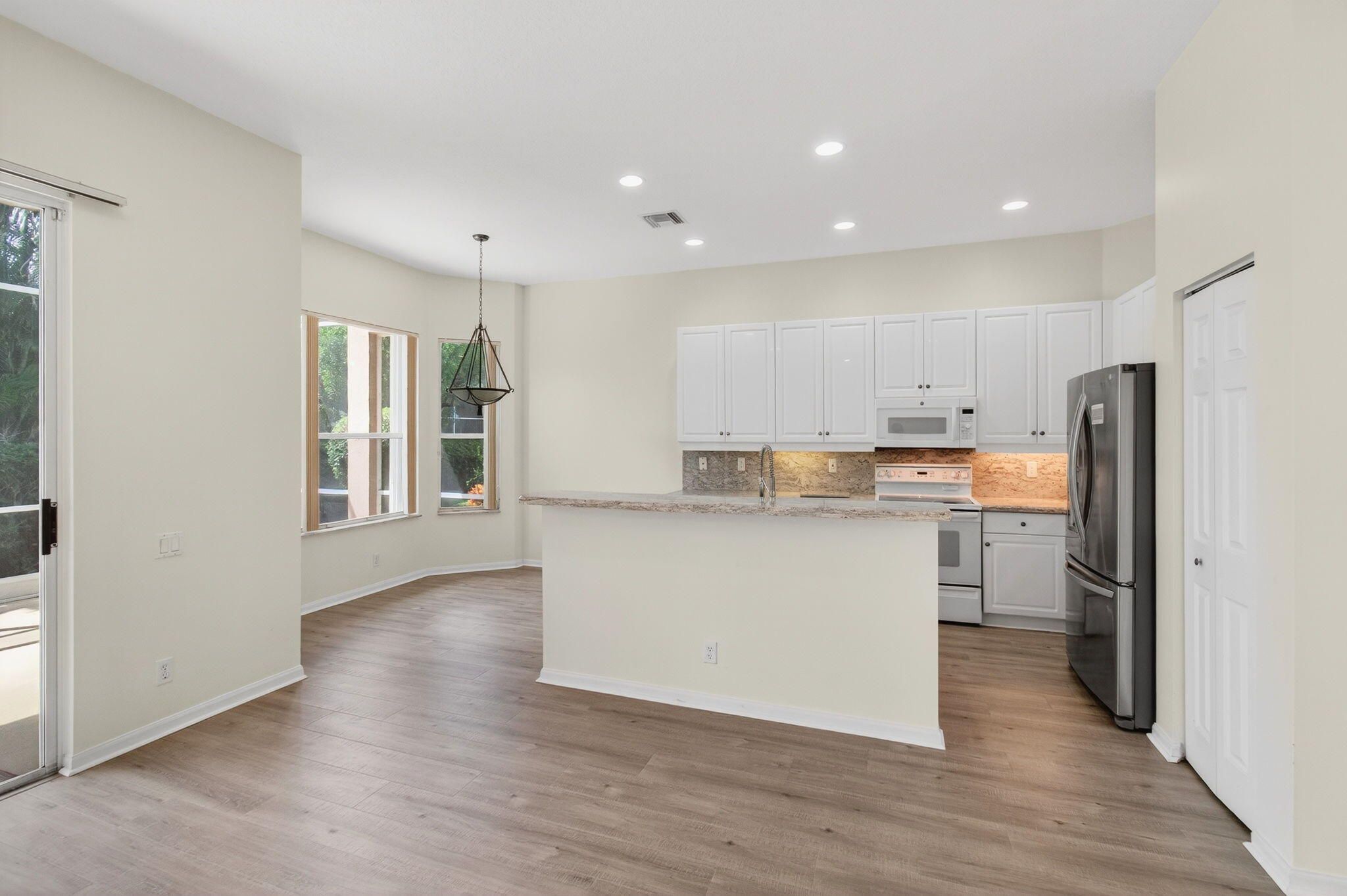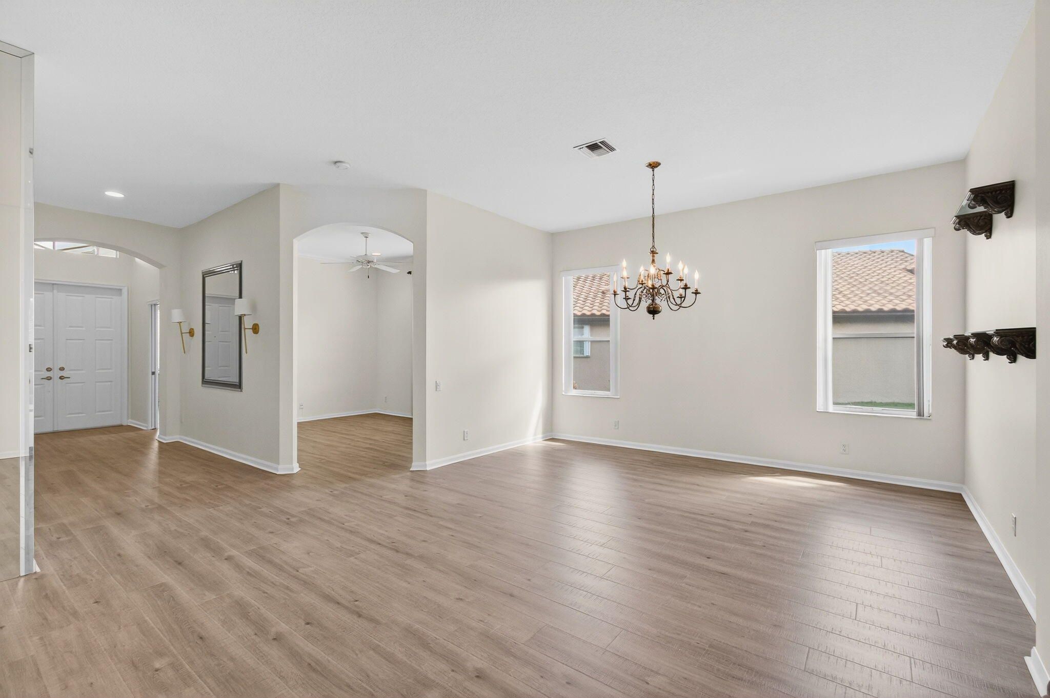 This Granville model in Cascades has been beautifully transformed with BRAND NEW Nature Tek laminate flooring installed throughout the home, offering a seamless and elegant look that enhances every room. With 2 bedrooms plus a den, 2 bathrooms, and over 2,000 square feet of living space, this residence sits on a larger lot with an extended side yard. Freshly painted in neutral Sherwin-Williams tones with wallpaper thoughtfully removed, the interiors are ready for your personal touch. The spacious kitchen offers white 42'' cabinetry, sleek granite countertops, stainless steel appliances--including an LG Stainless Steel refrigerator, a KitchenAide new dishwasher, and a brand new disposal. It opens to both formal and casual living areas, perfect for entertaining or relaxing.
