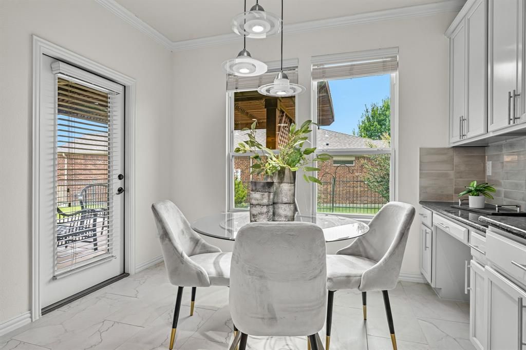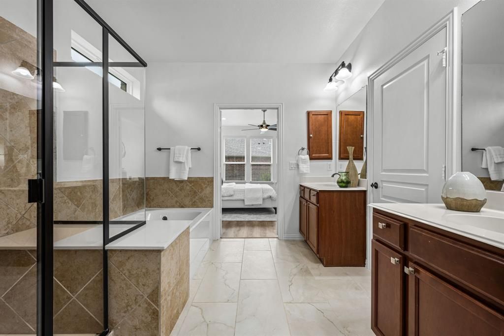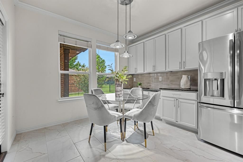 Welcome to 7315 Trull Brook, where thoughtful upgrades meet an ideal layout in the sought-after Vernon Hill floor plan. Featuring 3 spacious bedrooms, a private office, built-in planning desk, large family room, and two distinct dining areas, this home offers both function and flexibility for your lifestyle. Inside, you’ll be greeted by stunning recently updated 15x30 porcelain tile set in a brick pattern, elevating the space with style and durability. The kitchen shines with freshly painted cabinets, creating a light and inviting atmosphere, perfect for everyday meals or entertaining guests. Key updates bring peace of mind, including recently updated roof (2024) and updated lighting. The oversized garage with epoxy floors offers extra storage and is the perfect spot for your new golf cart! Enjoy conversations with new friends and family on your large covered patio—enhanced with an extended pergola. Set in the top-selling 55+ community of Frisco Lakes, you’ll enjoy resort-style amenities, a vibrant social calendar, and an unbeatable location close to shopping, dining, and Lake Lewisville. Your next chapter starts here.