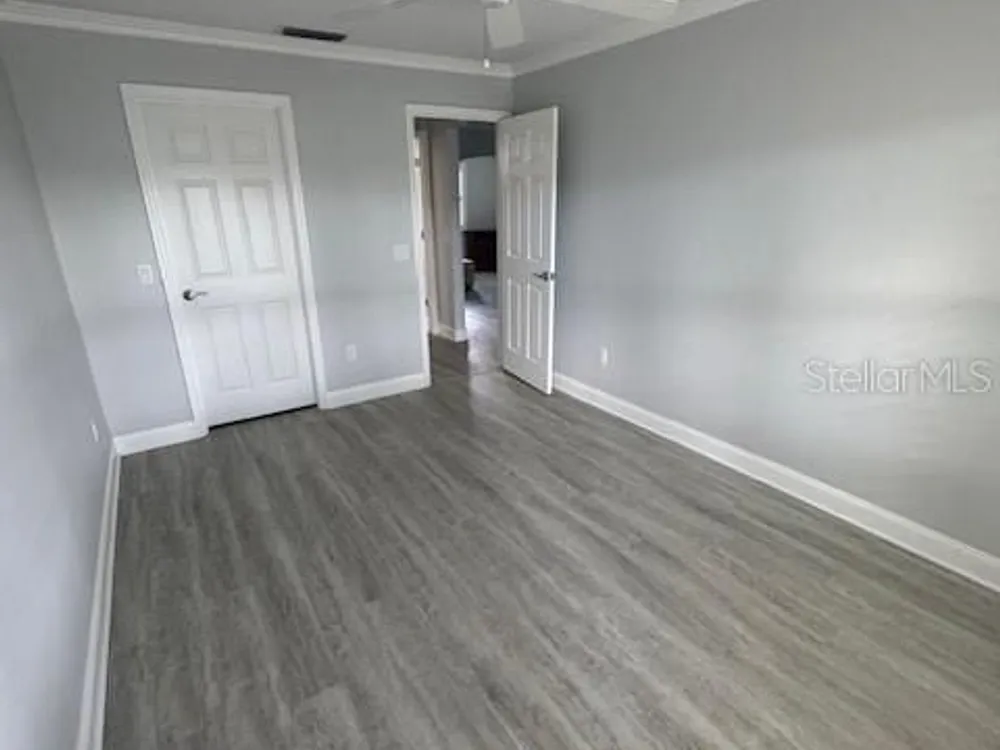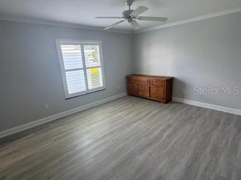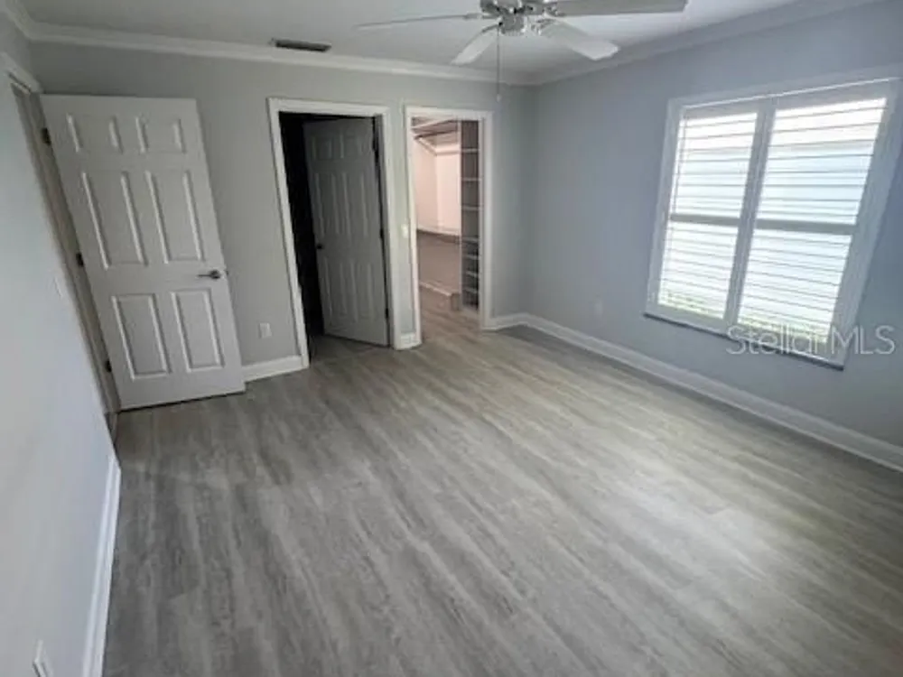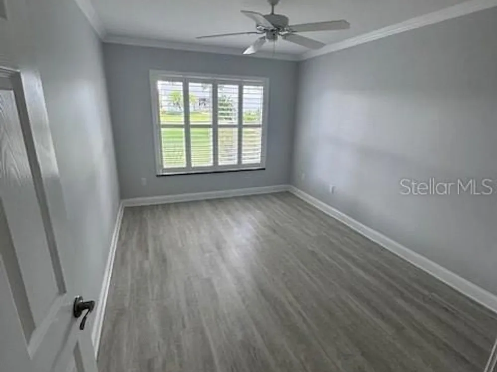 - Built-in Features, Ceiling Fan(s), Crown Molding, Living/Dining Room, Open Floorplan, Main Level Primary, Solid Surface Counters, Solid-Wood Cabinets, Walk-In Closet(s), Window Treatments