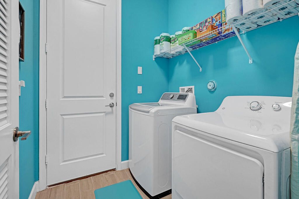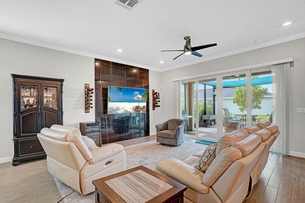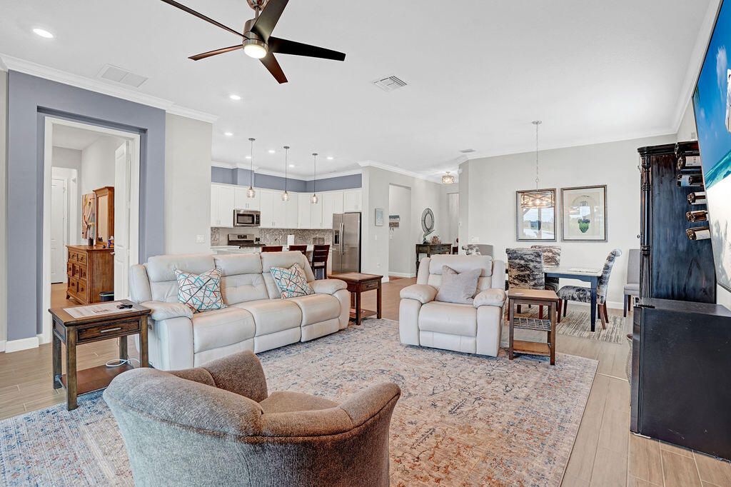 Beautiful lakefront 3/3 home w/office in the vibrant 55+ gated community of Veranda Preserve. This open floorplan offers 9-foot ceilings, plank tile flooring throughout, crown molding, ceiling fans & IMPACT glass. Enjoy the gourmet kitchen with S/S appliances, GAS range and large bar top island w/quartz countertops & backsplash, large dining area & family room w/a mounted 75'' TV that conveys. The primary suite offers views of the lake, master bath has dual sinks and accessible walk-in shower. Relax on your extended covered lanai w/ gas hook-up for your grill overlooking the sunset on the water. Resort style clubhouse offers a heated pool/spa, cafe, fitness room, movie theater, card room, tennis, pickleball and monthly planned activities. Awesome location near the FL Turnpike and I-95
