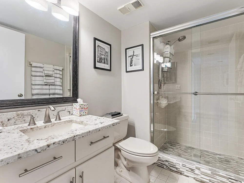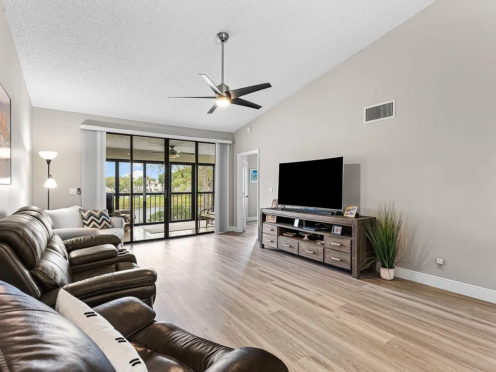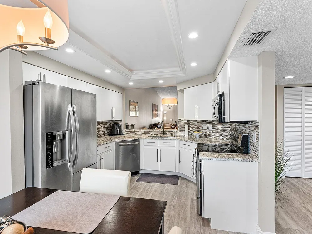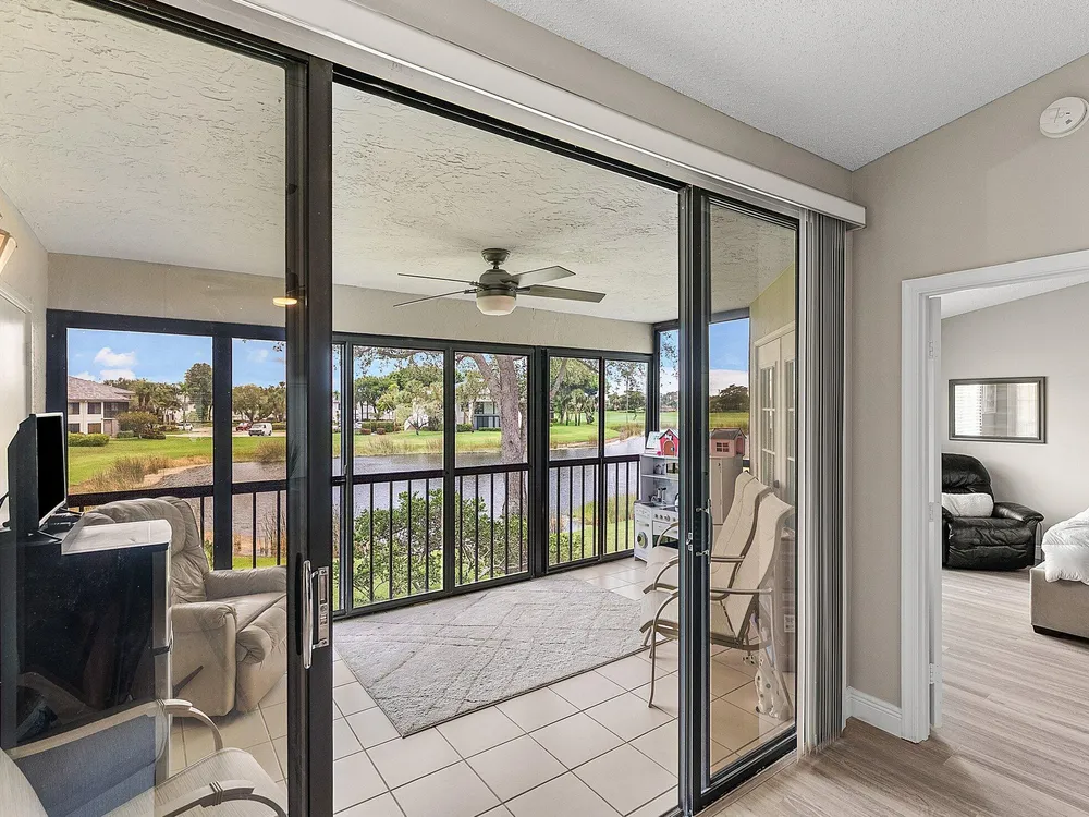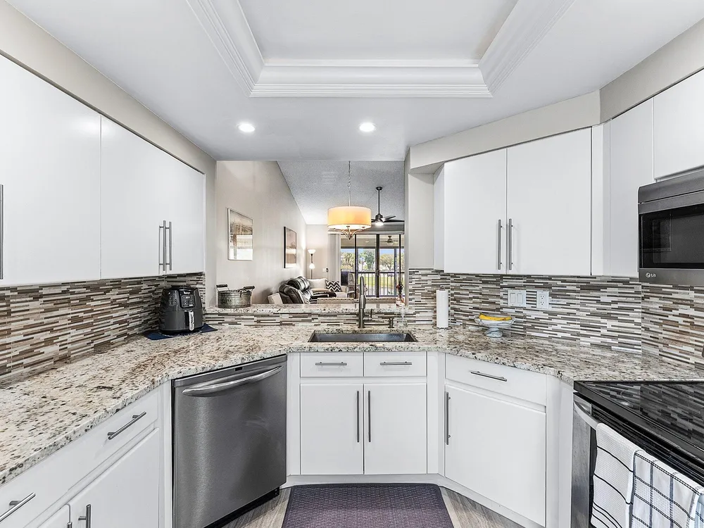 You are going to fall in love with this stunning 2 bedroom, 2 bath condo in the highly sought after Country Club of Gleneagles! This condo is nestled in a great location overlooking a sparkling lake and pool. The view is incredible. The owners spared no expense in updating this condo as it offers an updated kitchen with granite countertops, mosaic backsplash, and stainless steel appliances. There is no carpet in the condo as it has beautiful luxury vinyl plank throughout. The owners installed impact windows in the front of the condo as well! The interior floorplan is fantastic as you have split bedrooms, an eat in kitchen with an open dining room / living room. The guest bathroom has been fully upgraded.