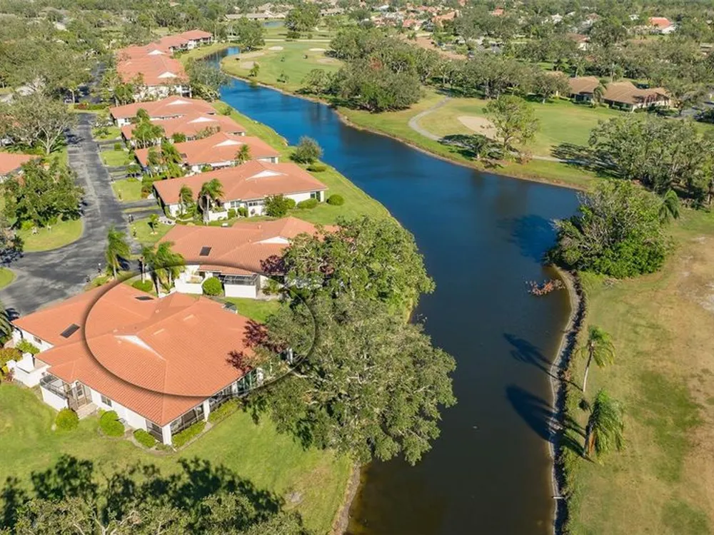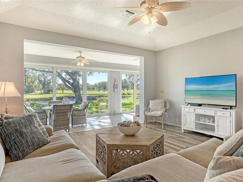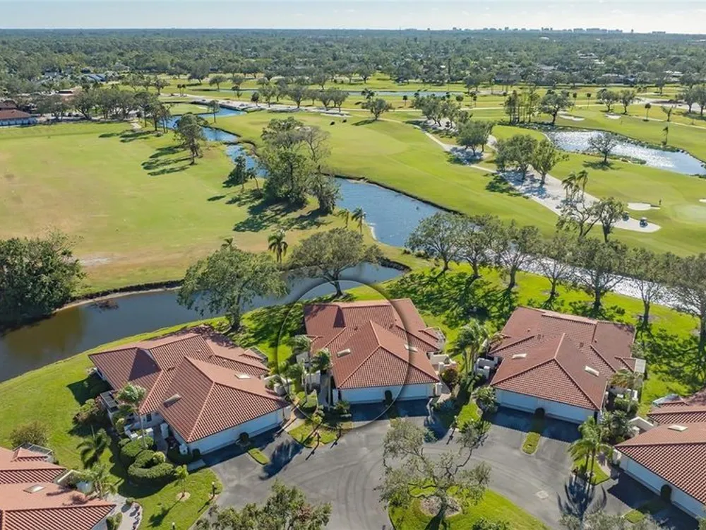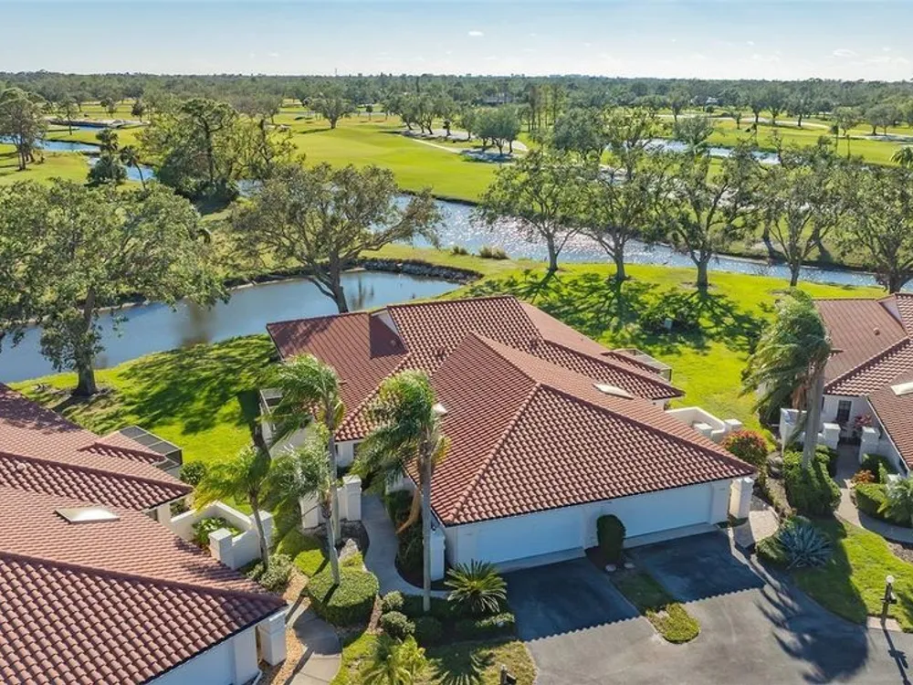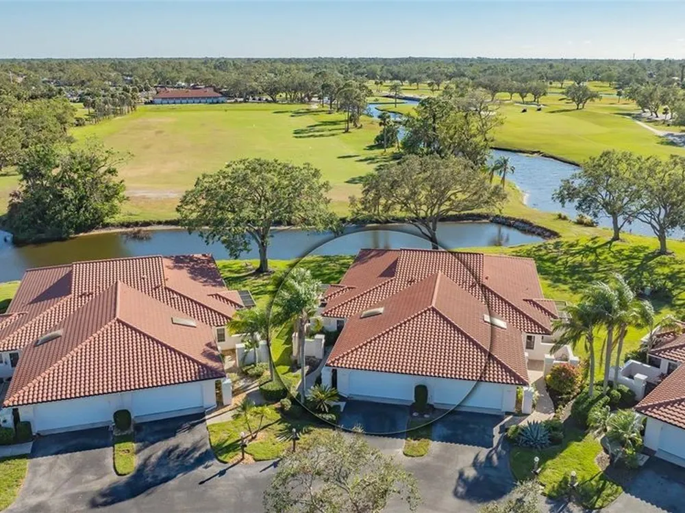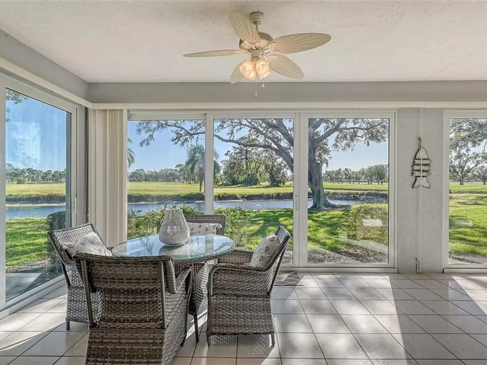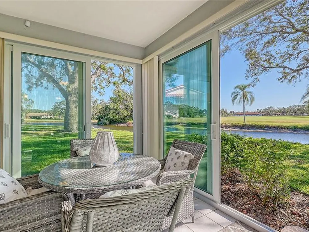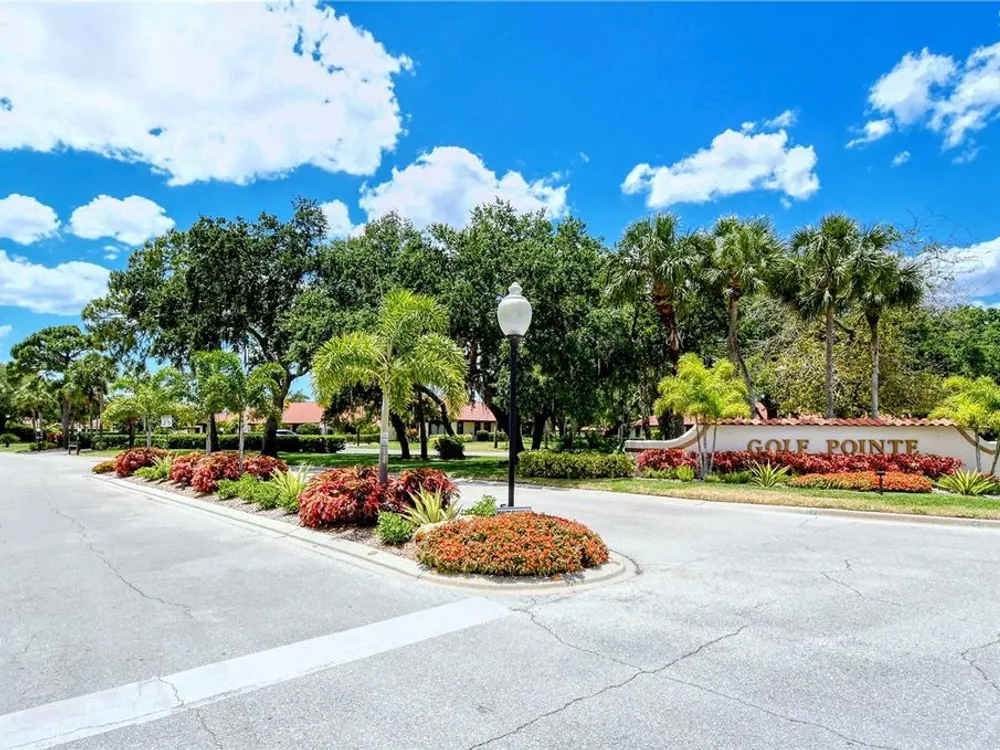 Highly sought-after Golf Pointe Circle Villa in the Palm Aire Country Club. This 3 Bedroom and 2 Bath Villa is being Sold Turnkey Furnished, minus some items (see inventory sheets). Beachy Coastal Decor gives you the feeling of living on the Beach, but even better, you're right on the Palm Aire Golf Course. With over 1,800 sq ft of living space this split floor plan has a Living Room/Dining Room combination, great for entertaining or just a comfortable and enjoyable relaxed environment. Or you might be spending all your time in the air-conditioned Florida Room, where Hurricane Impact Resistant Sliding Glass Doors were added earlier this year giving you sweeping landscapes of the club's practice range, golf course and water views. Starting with your first cup of coffee in the morning to your last evening cocktail enjoying the stunning sunsets. Kitchen has a nice eat-in area with sliding glass doors out to your private screened -in porch, perfect for your BBQ grilling. Primary Bedroom has sliding glass doors out to the Florida Room. The Primary Bath has a large walk-in closet with 2 entrances. Dual sinks, garden tub and separate shower stall. Second and Third Bedrooms are located towards the front of the home and share the second Bathroom, which is next to the closet laundry. All three Bedrooms have newer carpeting. The 2-car garage has plenty of room for your car and your golf cart with storage above if needed. Golf Pointe Community has a clubhouse and 2 heated pools for your enjoyment. Palm Aire Country Club has 2 Championship Golf Courses, Clubhouse, Fitness Center, Olympic Sized Heated Swimming Pool,12 Tennis and 8 Pickleball Courts. Golf, Sport and Fitness and Social/Dining memberships are offered but membership is not mandatory. Convenient location close to the UTC Mall, Benderson Rowing Venue, Sarasota Airport and the local beaches.