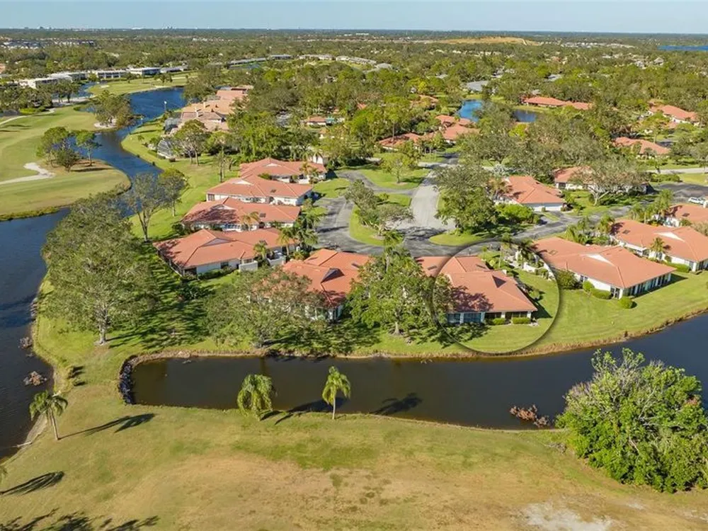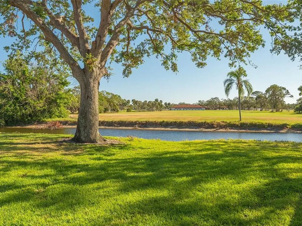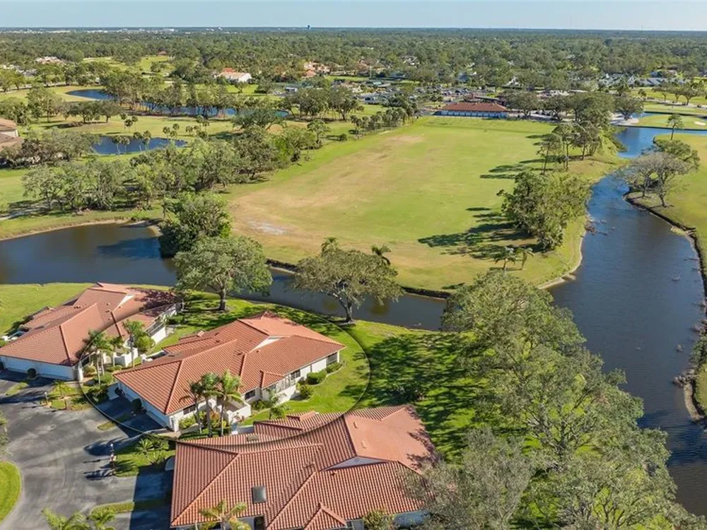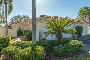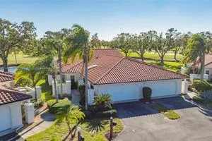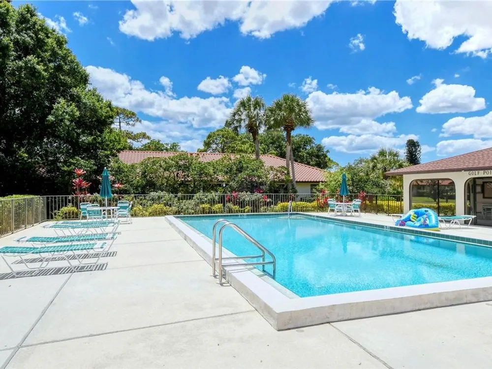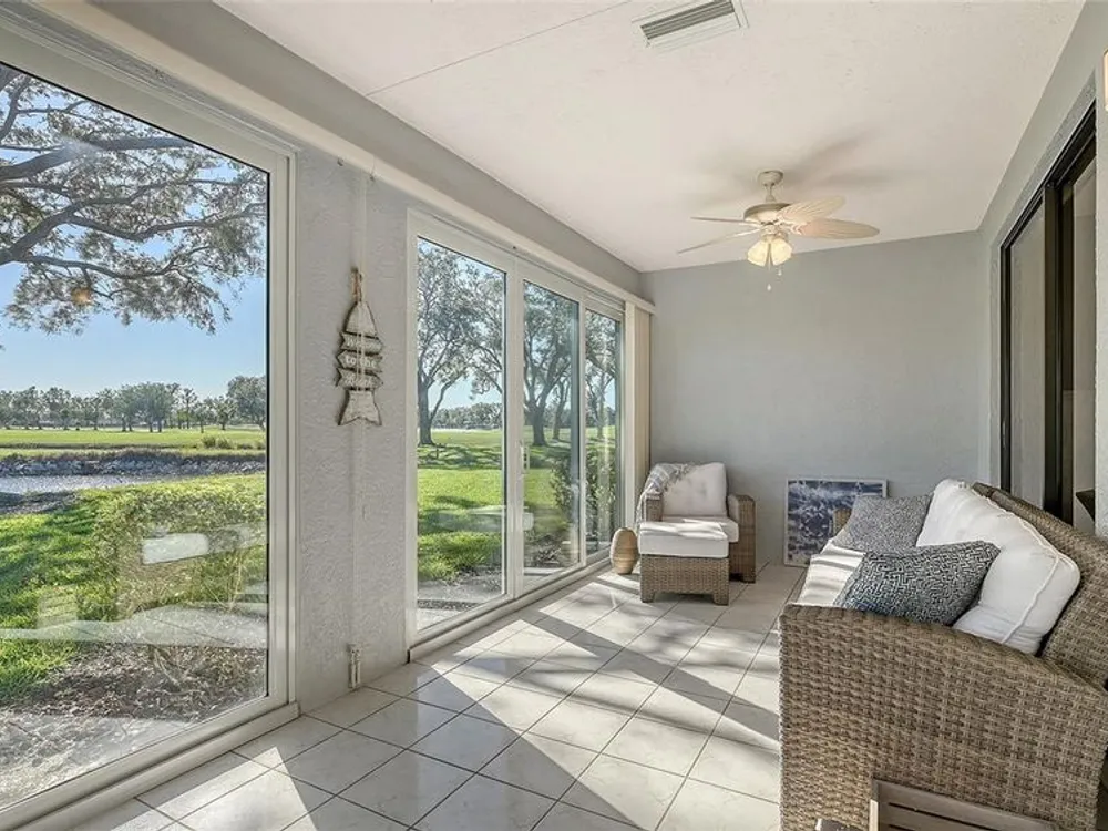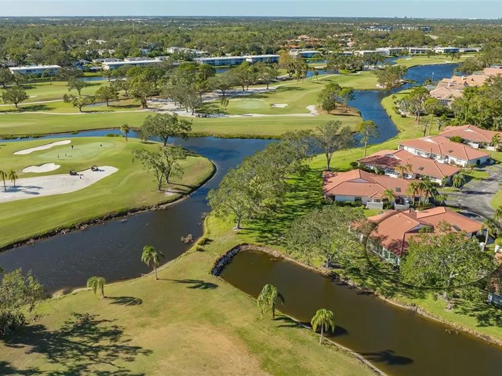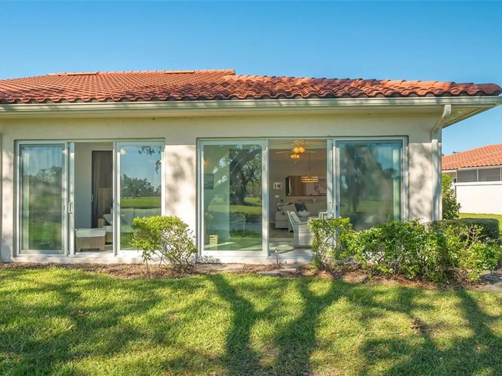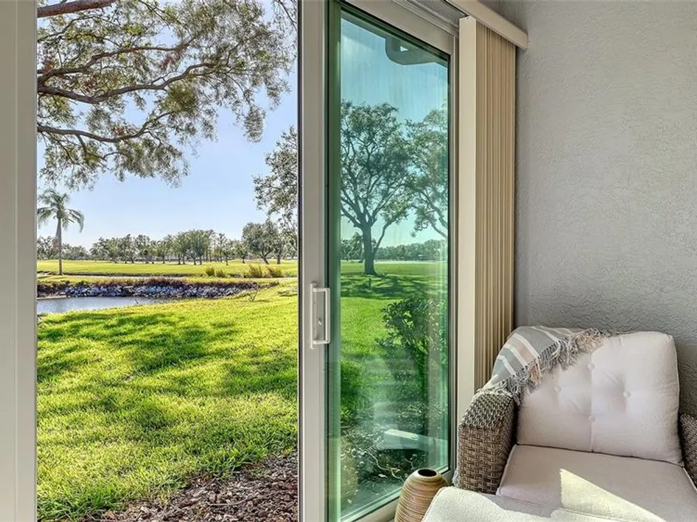 Highly sought-after Golf Pointe Circle Villa in the Palm Aire Country Club. This 3 Bedroom and 2 Bath Villa is being Sold Turnkey Furnished, minus some items (see inventory sheets). Beachy Coastal Decor gives you the feeling of living on the Beach, but even better, you're right on the Palm Aire Golf Course. With over 1,800 sq ft of living space this split floor plan has a Living Room/Dining Room combination, great for entertaining or just a comfortable and enjoyable relaxed environment. Or you might be spending all your time in the air-conditioned Florida Room, where Hurricane Impact Resistant Sliding Glass Doors were added earlier this year giving you sweeping landscapes of the club's practice range, golf course and water views. Starting with your first cup of coffee in the morning to your last evening cocktail enjoying the stunning sunsets. Kitchen has a nice eat-in area with sliding glass doors out to your private screened -in porch, perfect for your BBQ grilling. Primary Bedroom has sliding glass doors out to the Florida Room. The Primary Bath has a large walk-in closet with 2 entrances. Dual sinks, garden tub and separate shower stall. Second and Third Bedrooms are located towards the front of the home and share the second Bathroom, which is next to the closet laundry. All three Bedrooms have newer carpeting. The 2-car garage has plenty of room for your car and your golf cart with storage above if needed. Golf Pointe Community has a clubhouse and 2 heated pools for your enjoyment. Palm Aire Country Club has 2 Championship Golf Courses, Clubhouse, Fitness Center, Olympic Sized Heated Swimming Pool,12 Tennis and 8 Pickleball Courts. Golf, Sport and Fitness and Social/Dining memberships are offered but membership is not mandatory. Convenient location close to the UTC Mall, Benderson Rowing Venue, Sarasota Airport and the local beaches.