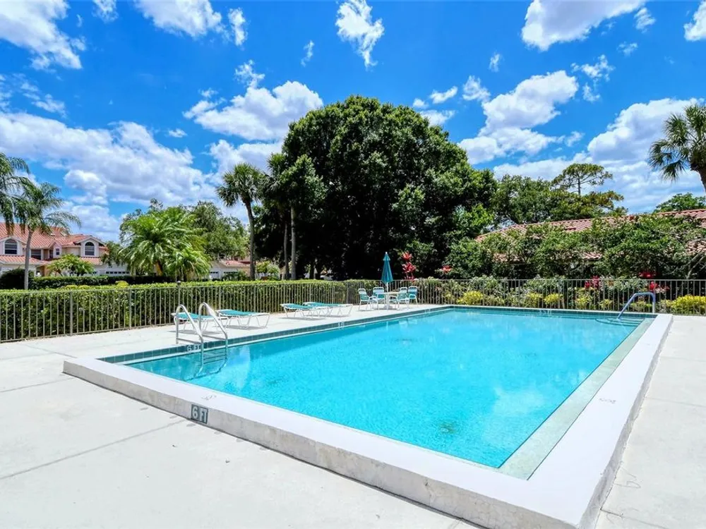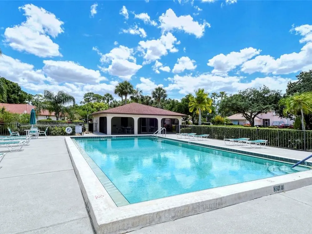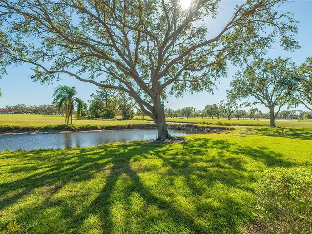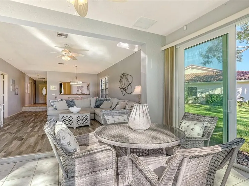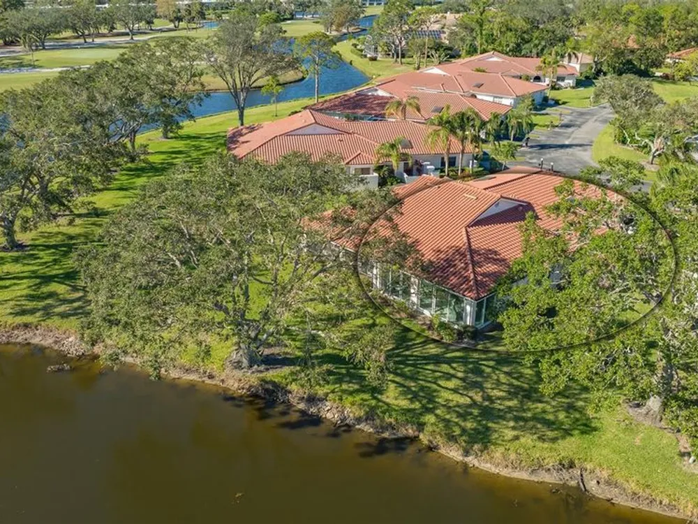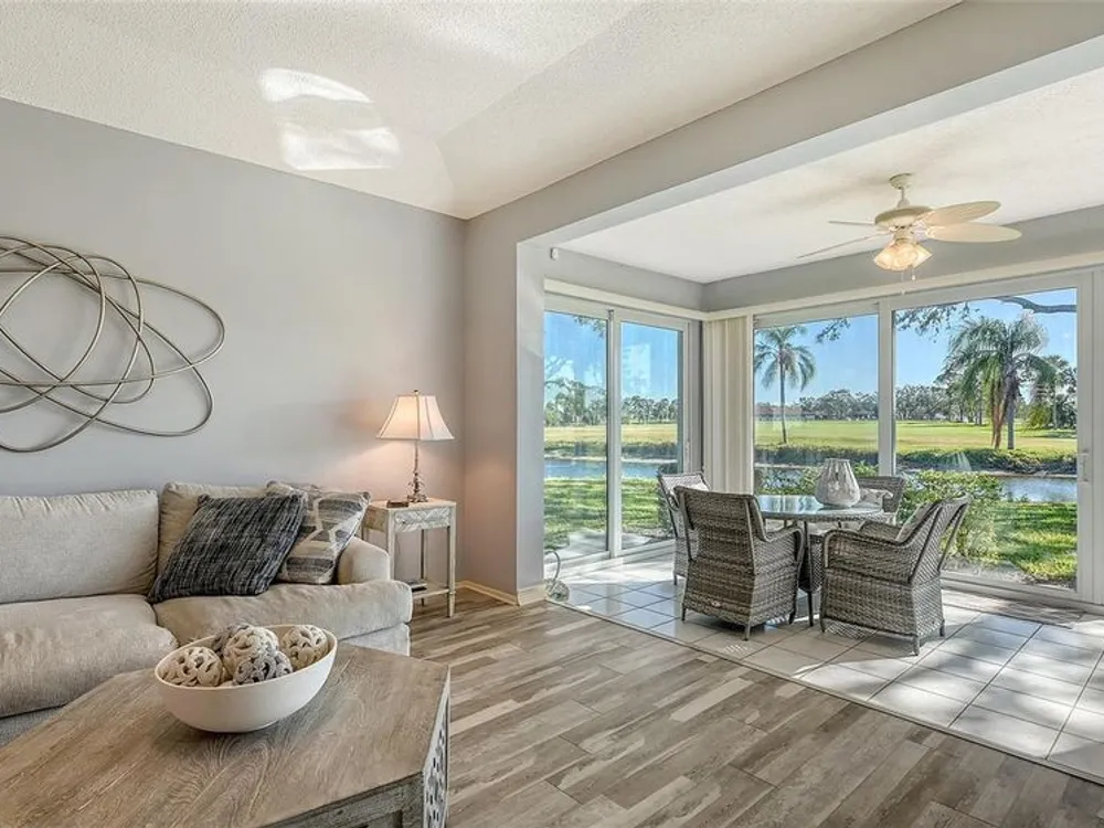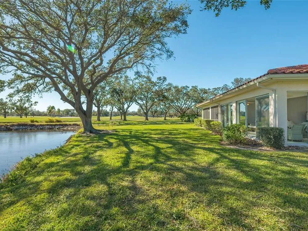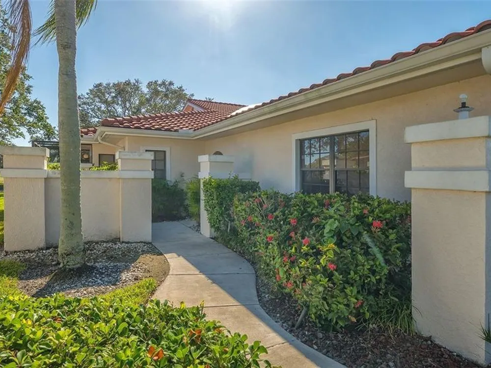 Highly sought-after Golf Pointe Circle Villa in the Palm Aire Country Club. This 3 Bedroom and 2 Bath Villa is being Sold Turnkey Furnished, minus some items (see inventory sheets). Beachy Coastal Decor gives you the feeling of living on the Beach, but even better, you're right on the Palm Aire Golf Course. With over 1,800 sq ft of living space this split floor plan has a Living Room/Dining Room combination, great for entertaining or just a comfortable and enjoyable relaxed environment. Or you might be spending all your time in the air-conditioned Florida Room, where Hurricane Impact Resistant Sliding Glass Doors were added earlier this year giving you sweeping landscapes of the club's practice range, golf course and water views. Starting with your first cup of coffee in the morning to your last evening cocktail enjoying the stunning sunsets. Kitchen has a nice eat-in area with sliding glass doors out to your private screened -in porch, perfect for your BBQ grilling. Primary Bedroom has sliding glass doors out to the Florida Room. The Primary Bath has a large walk-in closet with 2 entrances. Dual sinks, garden tub and separate shower stall. Second and Third Bedrooms are located towards the front of the home and share the second Bathroom, which is next to the closet laundry. All three Bedrooms have newer carpeting. The 2-car garage has plenty of room for your car and your golf cart with storage above if needed. Golf Pointe Community has a clubhouse and 2 heated pools for your enjoyment. Palm Aire Country Club has 2 Championship Golf Courses, Clubhouse, Fitness Center, Olympic Sized Heated Swimming Pool,12 Tennis and 8 Pickleball Courts. Golf, Sport and Fitness and Social/Dining memberships are offered but membership is not mandatory. Convenient location close to the UTC Mall, Benderson Rowing Venue, Sarasota Airport and the local beaches.