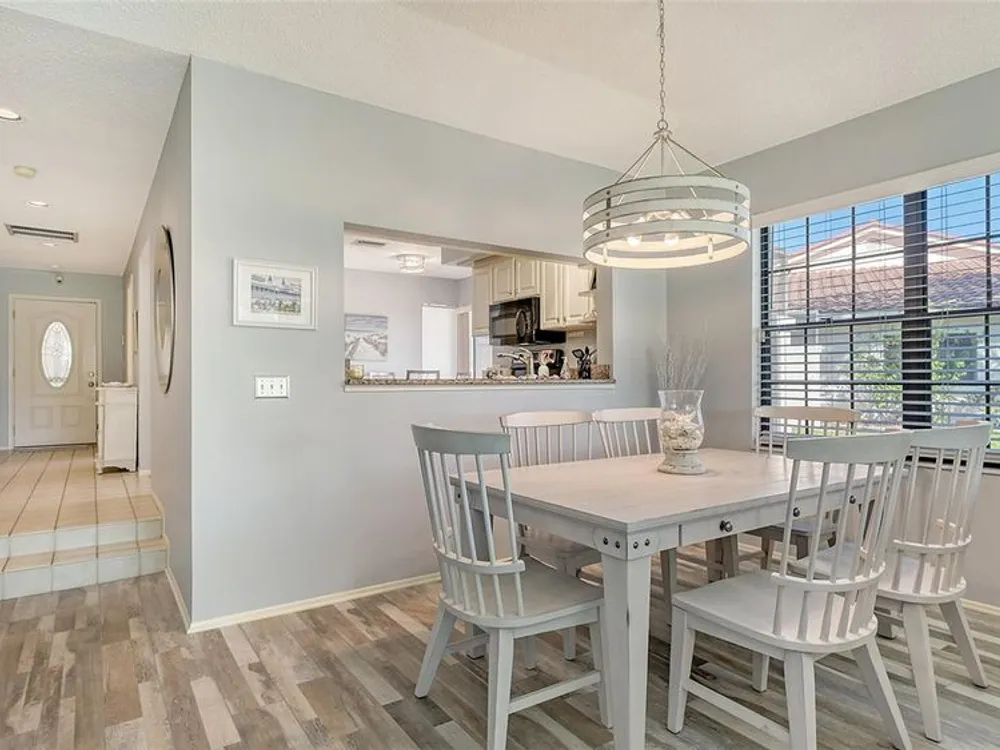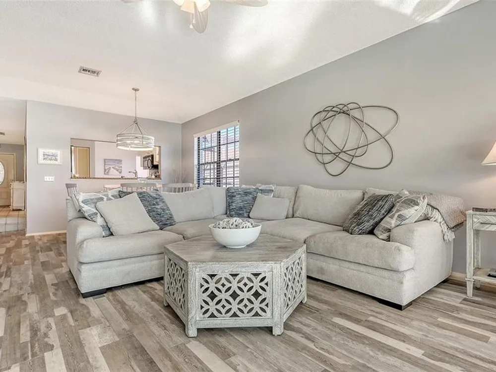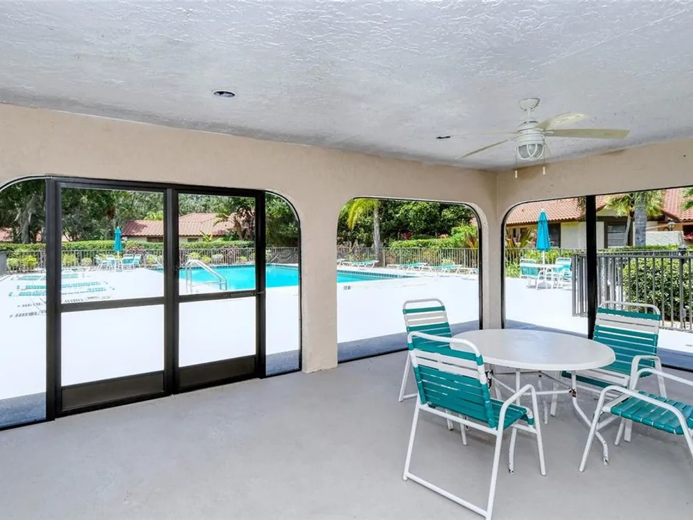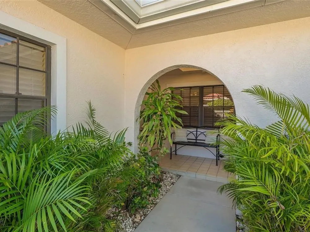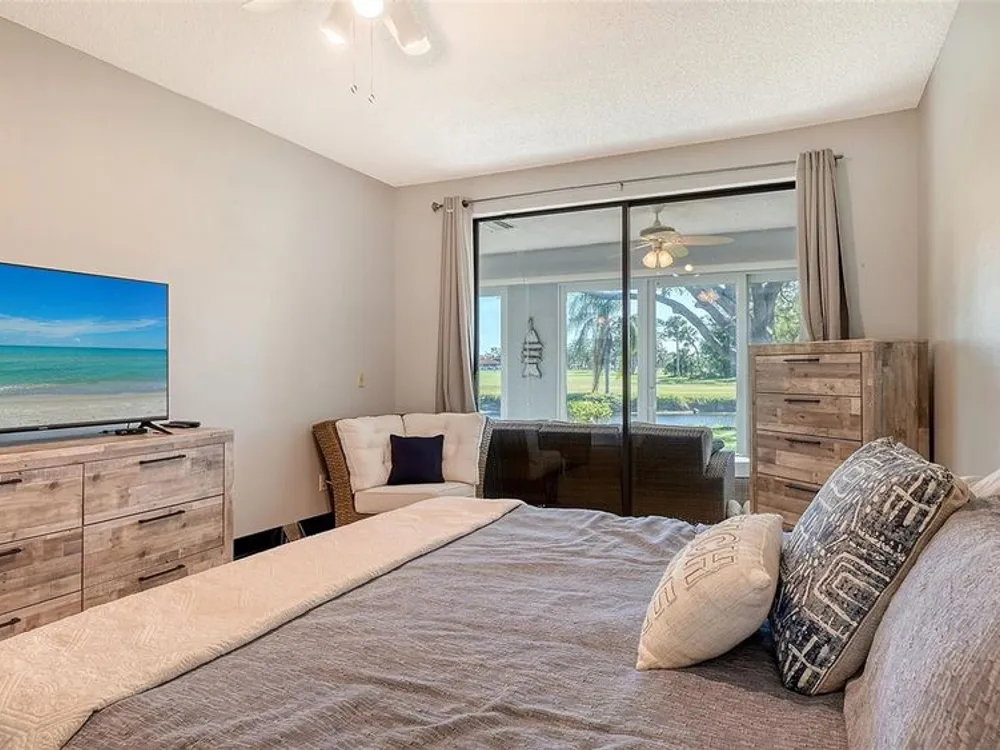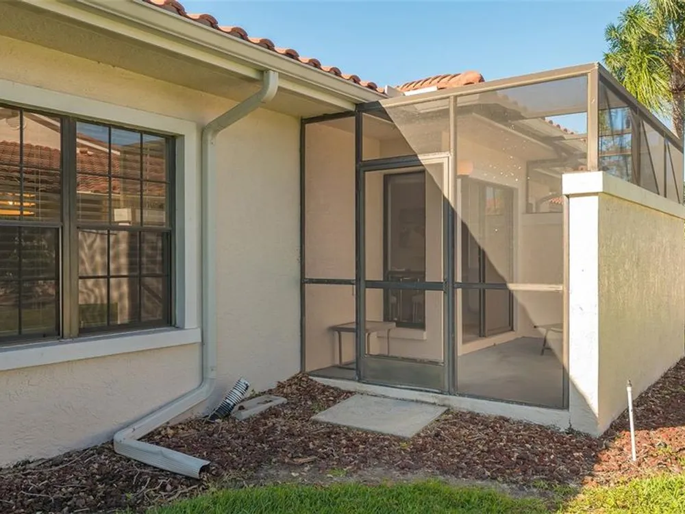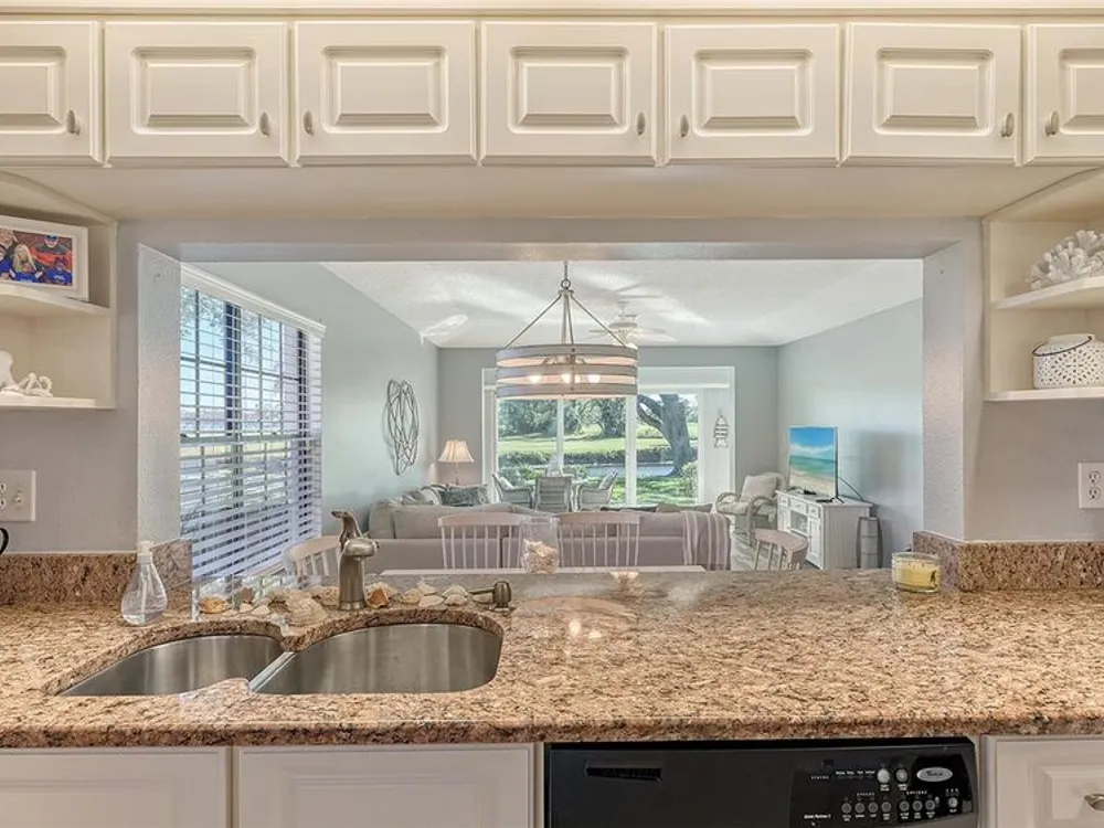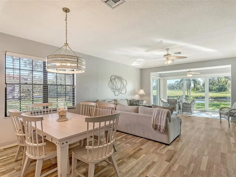 Highly sought-after Golf Pointe Circle Villa in the Palm Aire Country Club. This 3 Bedroom and 2 Bath Villa is being Sold Turnkey Furnished, minus some items (see inventory sheets). Beachy Coastal Decor gives you the feeling of living on the Beach, but even better, you're right on the Palm Aire Golf Course. With over 1,800 sq ft of living space this split floor plan has a Living Room/Dining Room combination, great for entertaining or just a comfortable and enjoyable relaxed environment. Or you might be spending all your time in the air-conditioned Florida Room, where Hurricane Impact Resistant Sliding Glass Doors were added earlier this year giving you sweeping landscapes of the club's practice range, golf course and water views. Starting with your first cup of coffee in the morning to your last evening cocktail enjoying the stunning sunsets. Kitchen has a nice eat-in area with sliding glass doors out to your private screened -in porch, perfect for your BBQ grilling. Primary Bedroom has sliding glass doors out to the Florida Room. The Primary Bath has a large walk-in closet with 2 entrances. Dual sinks, garden tub and separate shower stall. Second and Third Bedrooms are located towards the front of the home and share the second Bathroom, which is next to the closet laundry. All three Bedrooms have newer carpeting. The 2-car garage has plenty of room for your car and your golf cart with storage above if needed. Golf Pointe Community has a clubhouse and 2 heated pools for your enjoyment. Palm Aire Country Club has 2 Championship Golf Courses, Clubhouse, Fitness Center, Olympic Sized Heated Swimming Pool,12 Tennis and 8 Pickleball Courts. Golf, Sport and Fitness and Social/Dining memberships are offered but membership is not mandatory. Convenient location close to the UTC Mall, Benderson Rowing Venue, Sarasota Airport and the local beaches.