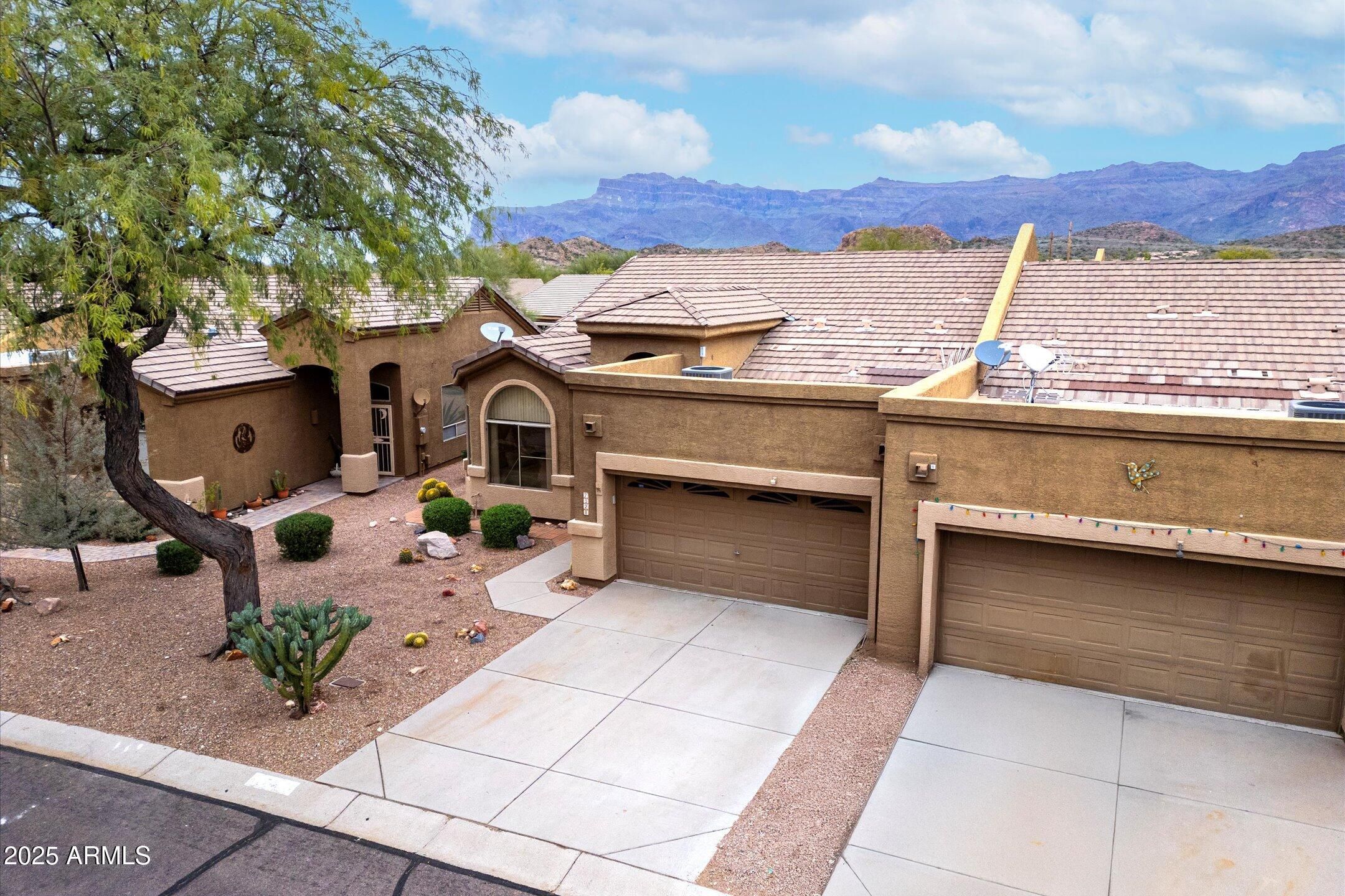 Move in ready Bayberry floor plan offering 1,543 square feet with 2 bedrooms and 2 bathrooms in the sought after 55 plus active adult community of MountainBrook Village in Gold Canyon. This well designed twin home features a split bedroom layout providing excellent privacy. The primary suite includes a walk in closet and a spacious bath with dual sinks, walk in shower, and private toilet room, while the guest bedroom and full bath are located on the opposite side of the home. The kitchen is equipped with stainless steel appliances, tile backsplash, and a sliding glass door that opens to the large patio, complete with an outdoor fireplace. A convenient sidewalk connects the backyard to the front yard. Tile flooring is featured in the kitchen, bathrooms, and laundry room. Recent updates include new interior paint and new carpet in 2025. Storage is abundant with extra cabinetry in the laundry room and generous space in the two car garage. MountainBrook Village offers an exceptional lifestyle with an 18 hole golf course, pickleball and tennis courts, heated pool and spa, fitness center, clubhouse, recreation center, and miles of walking paths. An ideal opportunity to enjoy comfort, convenience, and active adult living in a beautiful Gold Canyon setting.