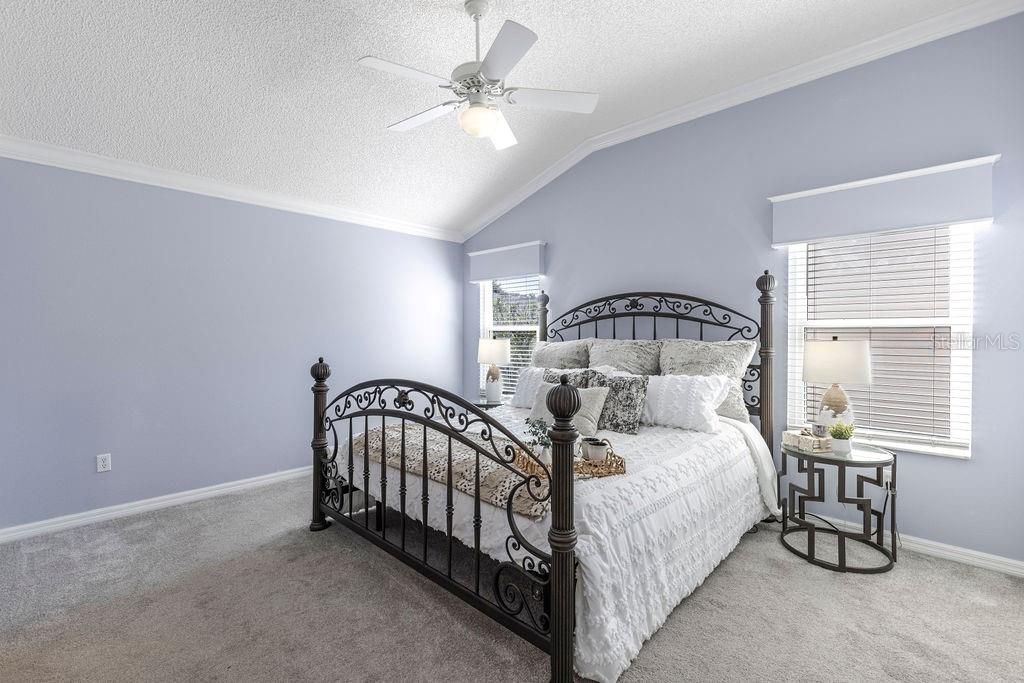 - Ceiling Fan(s), Crown Molding, Eat-in Kitchen, High Ceilings, Open Floorplan, Main Level Primary, Solid Surface Counters, Split Bedrooms, Thermostat