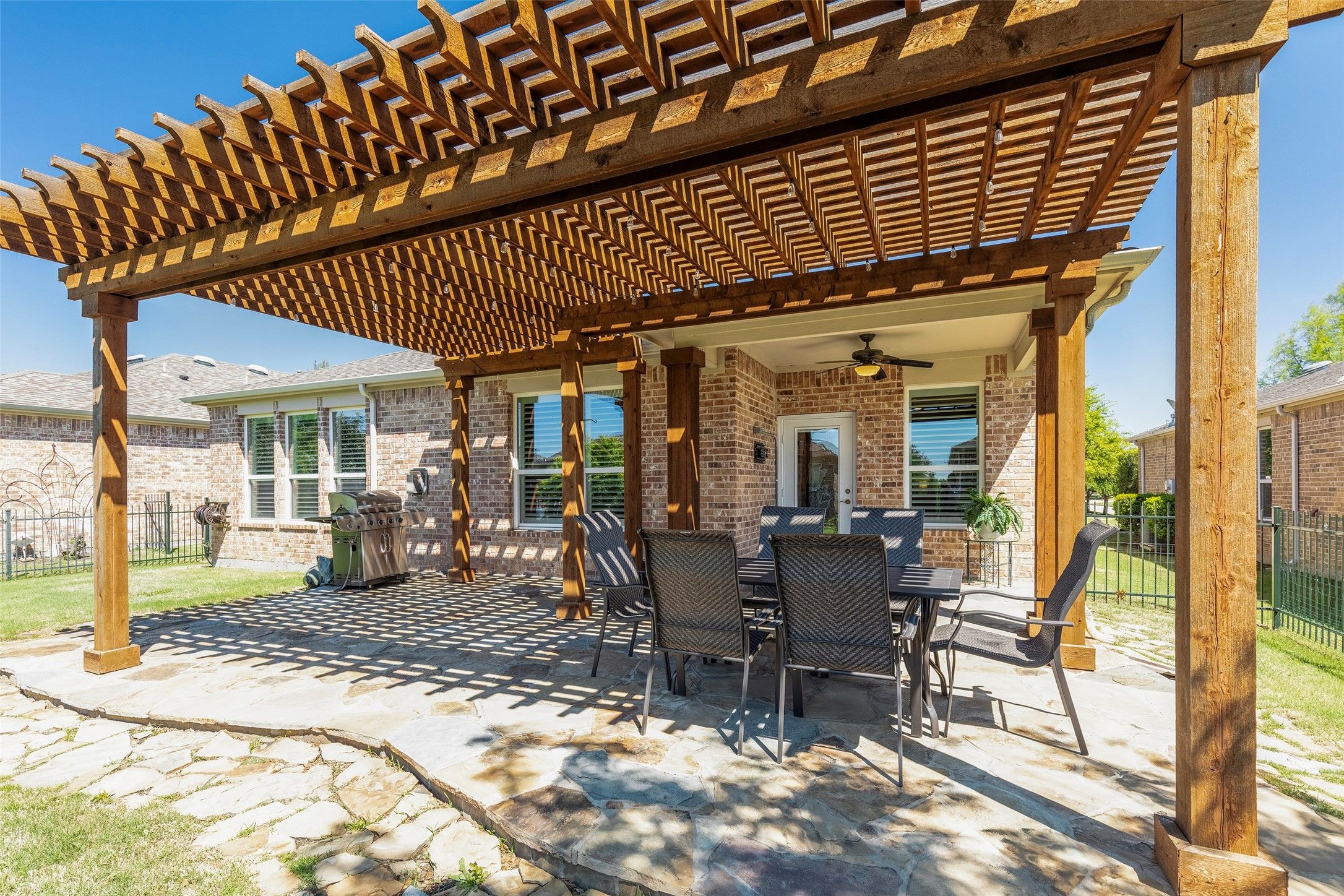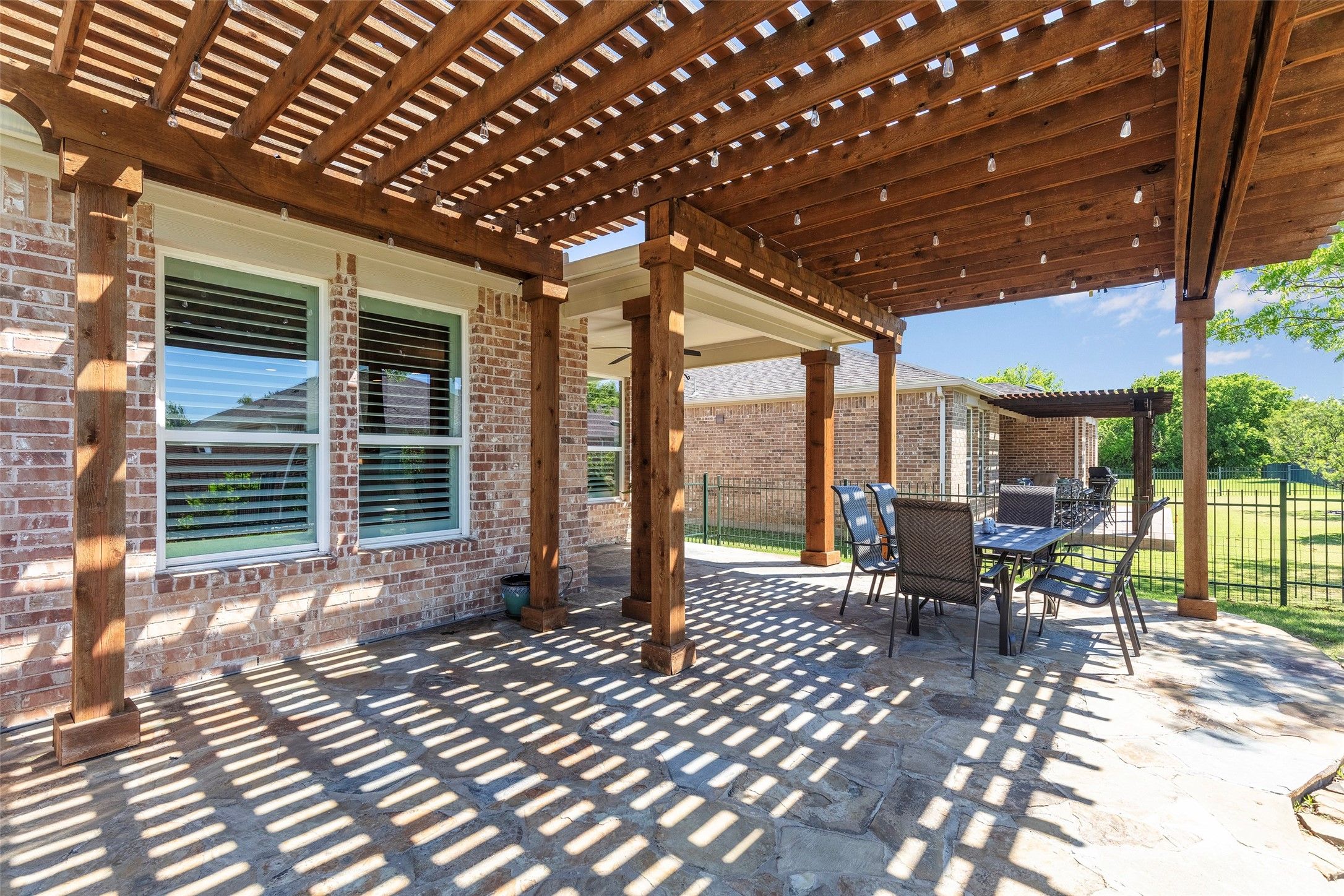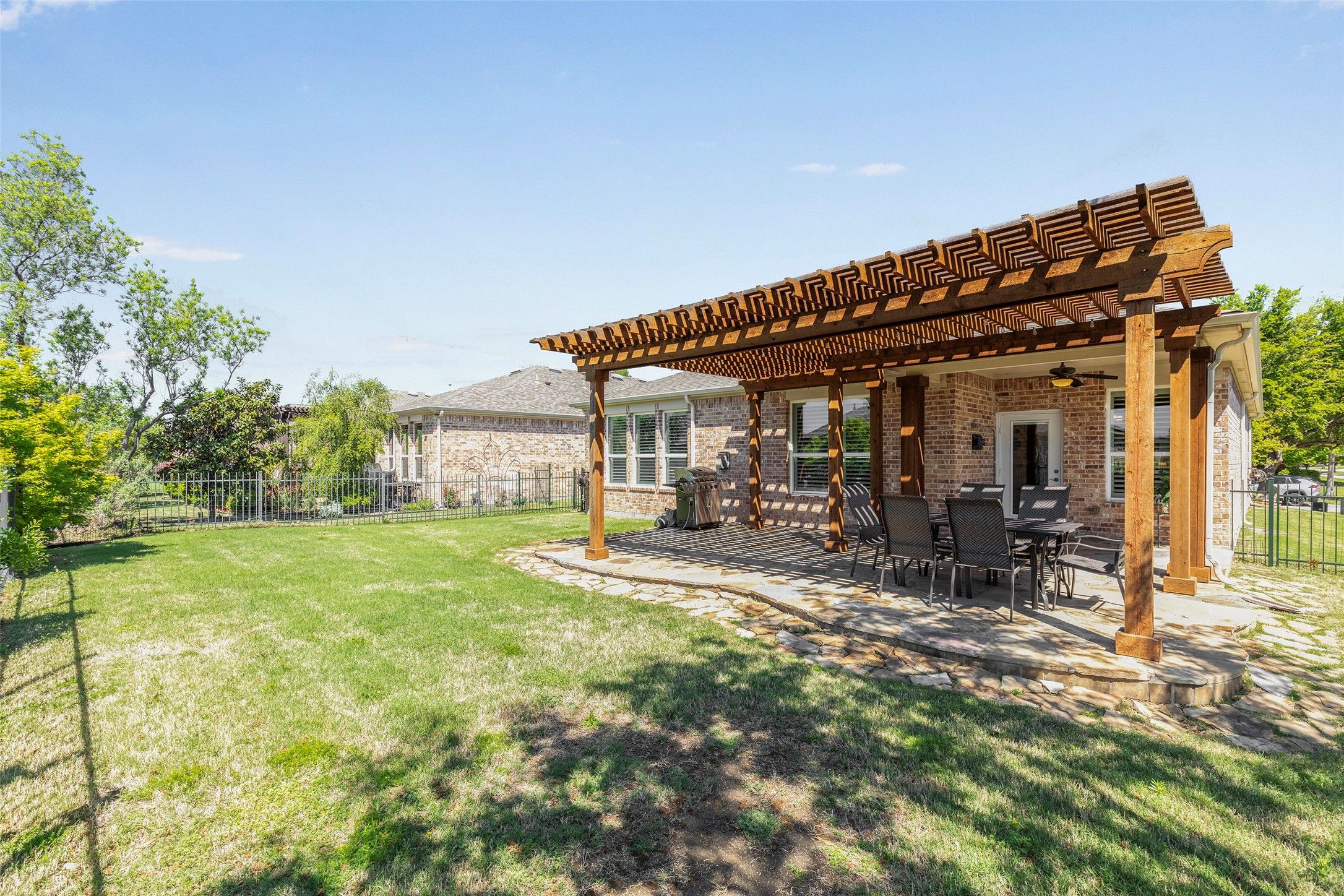 Experience refined living in the highly sought-after Frisco Lakes community, where comfort and elegance meet a vibrant lifestyle. Ideally positioned at the end of a quiet street, this exceptional home welcomes you with outstanding curb appeal, highlighted by an expansive front porch, mature trees, and beautifully manicured landscaping—creating a serene and inviting first impression. Step inside to discover a light-filled, open-concept living space designed for both relaxation and entertaining complimented by gorgeous plantation shutters. The spacious living area flows seamlessly into a well-appointed kitchen featuring a under cabinet lighting, gas cooktop, stainless steel appliances, granite countertops, a generous eat-in bar, and a large walk-in pantry—perfect for everyday living and hosting alike. The private primary suite offers a peaceful retreat, complete with rich LVP flooring and large windows overlooking the backyard. The ensuite bath is thoughtfully designed with dual vanities, Garden tub, stand alone shower, private water closet, and an expansive walk-in closet. Additional highlights include a spacious utility room with sink and storage, conveniently connected to the garage complete with overhead storage racks. Also new is the tankless water heater with lifetime warranty. Enjoy low interior maintenance with new LVP flooring throughout the every space of the home. Freshly painted inside makes this home move-in ready. Outdoors, enjoy your own private backyard retreat with a stunning pergola-covered patio and custom stone flooring—ideal for entertaining or unwinding in style. Residents of Frisco Lakes enjoy access to premier amenities including resort-style pools, tennis courts, fitness and social activities, and more. Rarely does a 3-bedroom home of this caliber become available—don’t miss this exceptional opportunity. Will be active with showings beginning on April 8th.