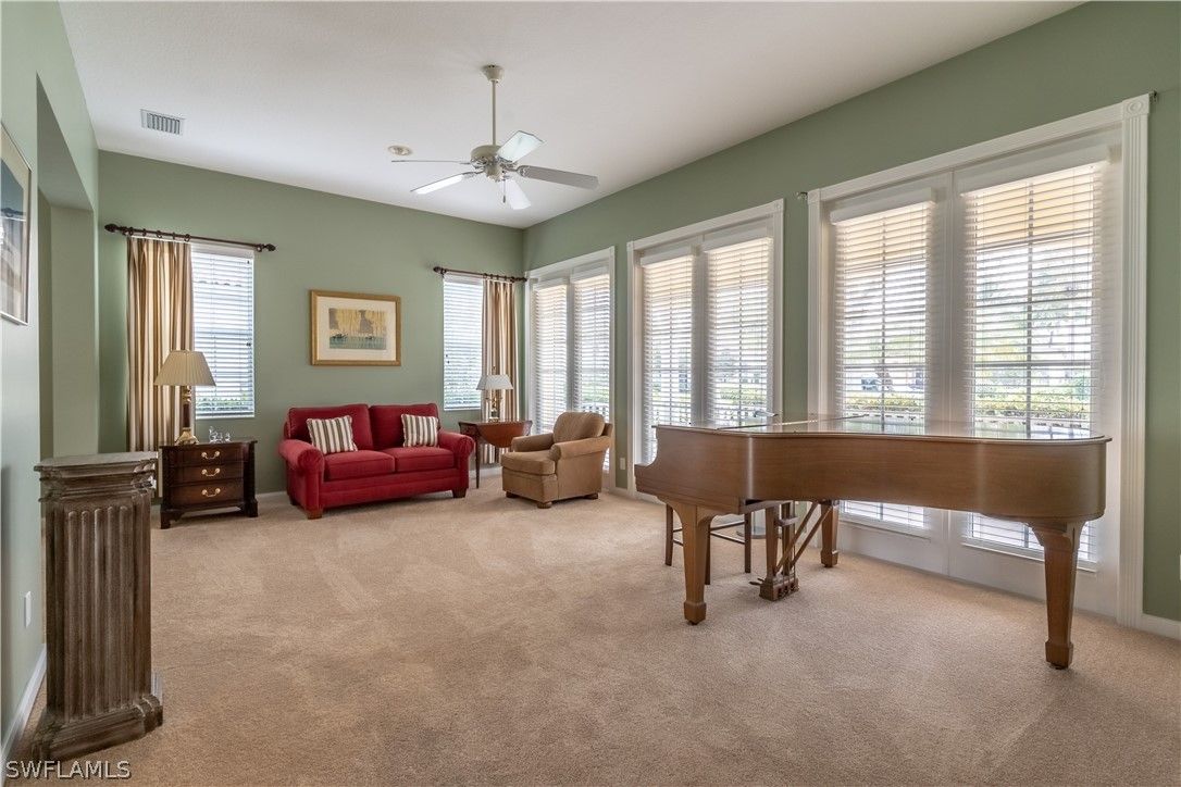 Here is your opportunity for expansive living in this furnished, four bedrooms/three bath Carlyle model executive home. Located within the gated community of VeronaWalk, this original DiVosta built, poured concrete home is a splendid space for entertaining. A new roof and Generac whole house generator are incredible upgrades. Offering both a formal living (with a wall of tall windows) and dining room, in addition to, a more relaxed lounge and eating space, you have room to stretch out. The floor plan offers a split bedroom layout for the ultimate in privacy when housing overnight guests. A centrally located kitchen has an abundance of cabinetry, granite counters with additional seating and stainless appliances (double-oven range). The adjoining casual living area allows the chef to be a part of all get togethers. A full laundry room off of the two-car garage has a front load washer/dryer duo, more storage and a wash sink. Flooring throughout the home is tile or neutral shade carpet for ease in decorating choices. The primary suite is accessed through a double door. Enjoy the water view from your bed or step outdoors from your private sliding door. An attached bath has a deep soaking tub, a large tiled shower and dual vanities. A covered, screened lanai and an open-air patio look out onto your extended lot with spacious lawns and a wide water view. This home is a gem for gathering friends and family.