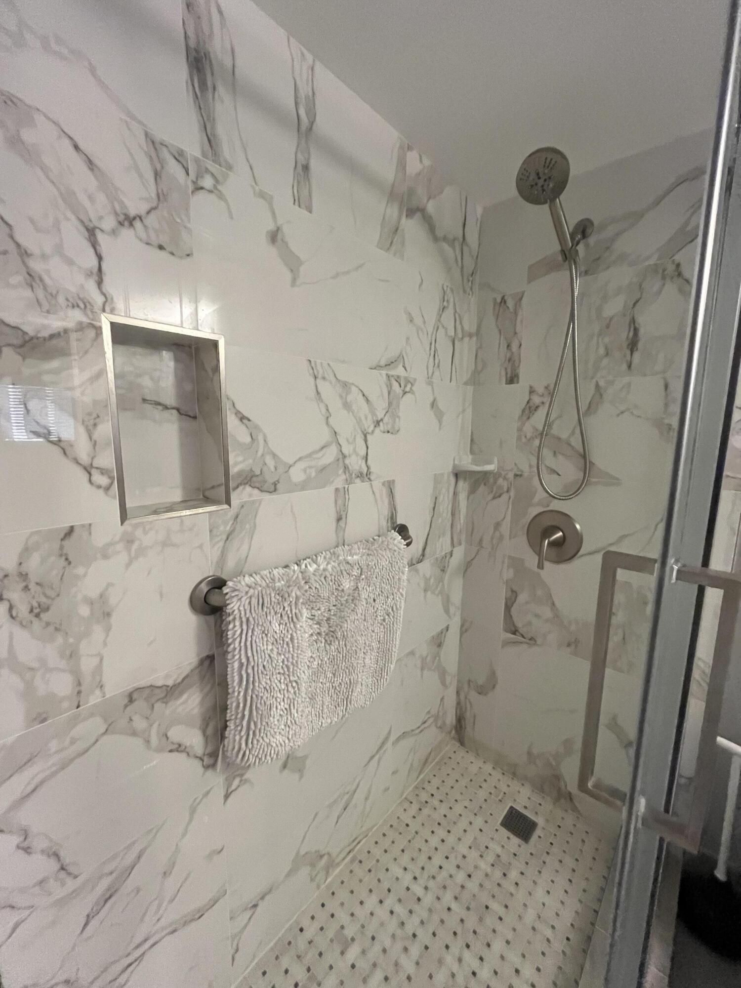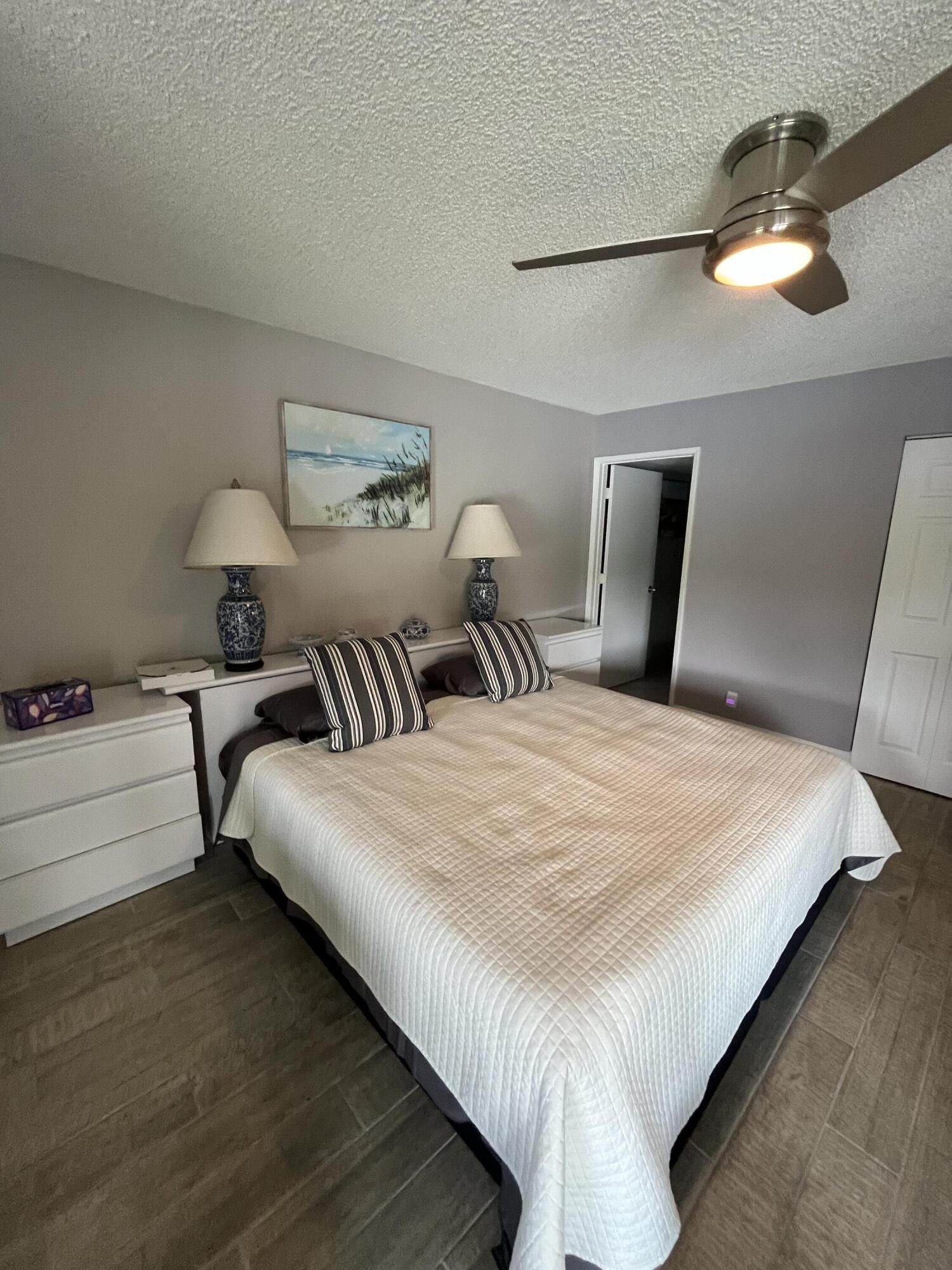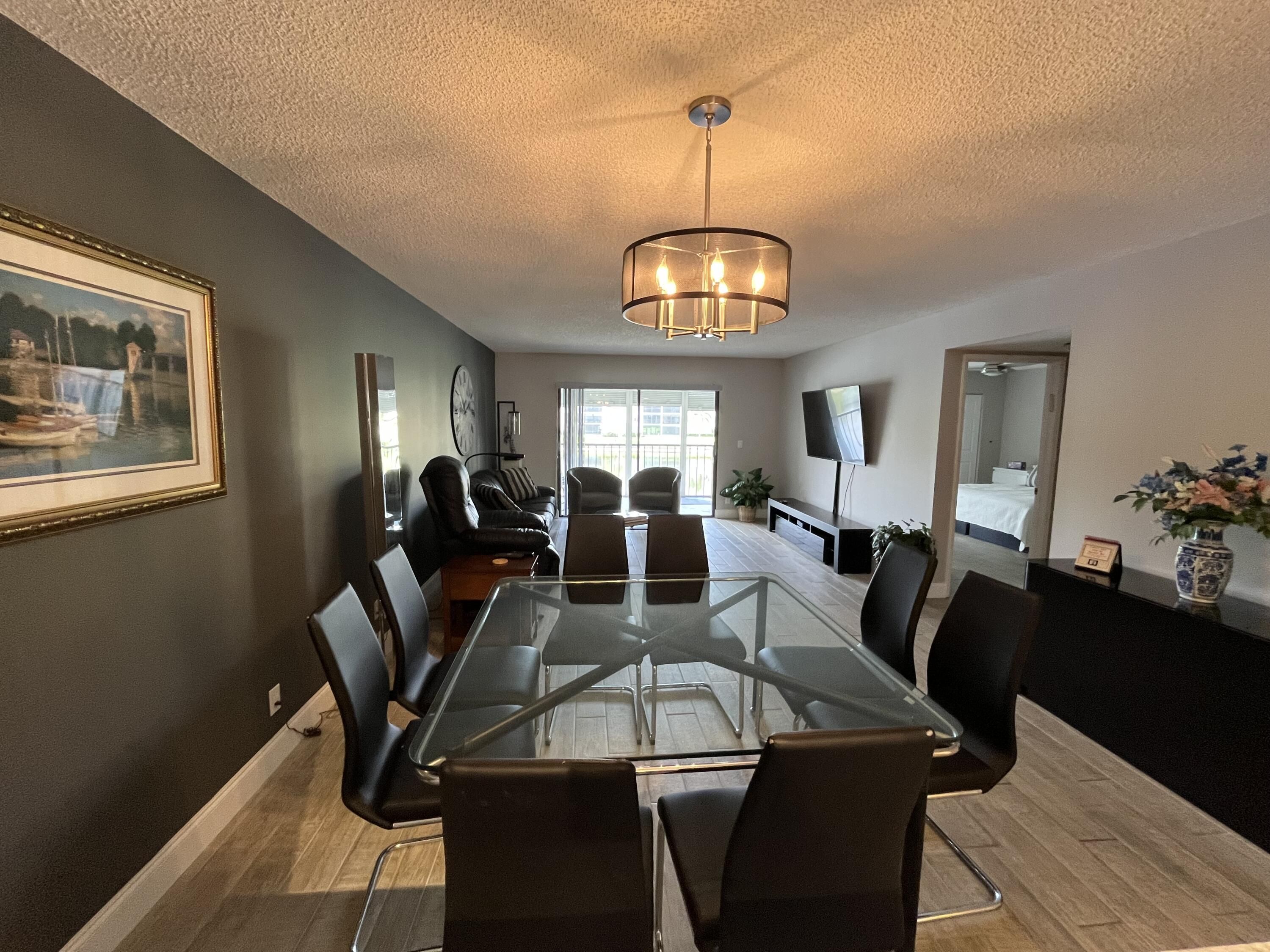 Gorgeous re-done Lancaster model in section 4 of Huntington Lakes. Great expansive wide lake view from your southern exposure facing patio with roll-down shutters as well. As soon as you enter this condo, you are met with updated gray plank tiling throughout the main area. Your kitchen has upgrades that include an undercounter lazy susan corner for additional storage. Roll-out cabinets in the pantry. Granite countertops with a subway tiled backsplash. Both bathrooms designed similarly in whites and grays exquisitely and tastefully. Guest/2nd bathroom updated with stall shower too. Higher designer baseboards all around. A/C unit 2024. Water heater April 2025. Full side by side washer/dryer in utility room. Primary b/r with 2 walk-in closets. Parking space #1. Lowest maint in comm