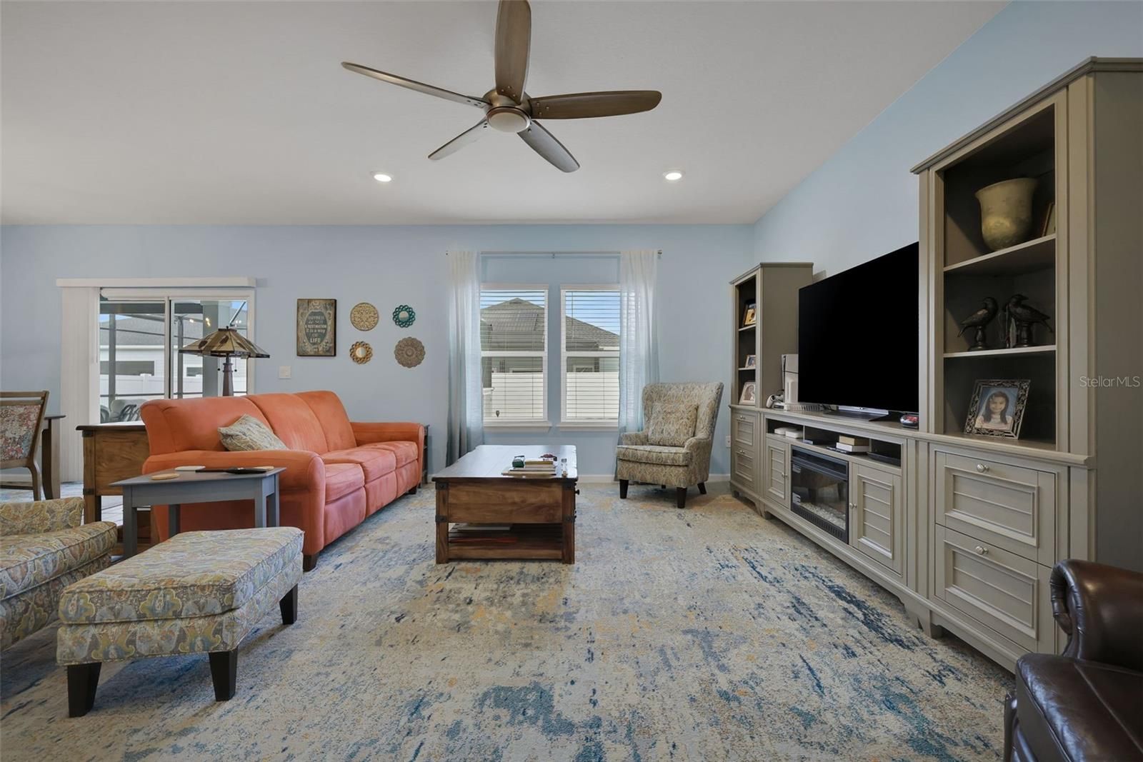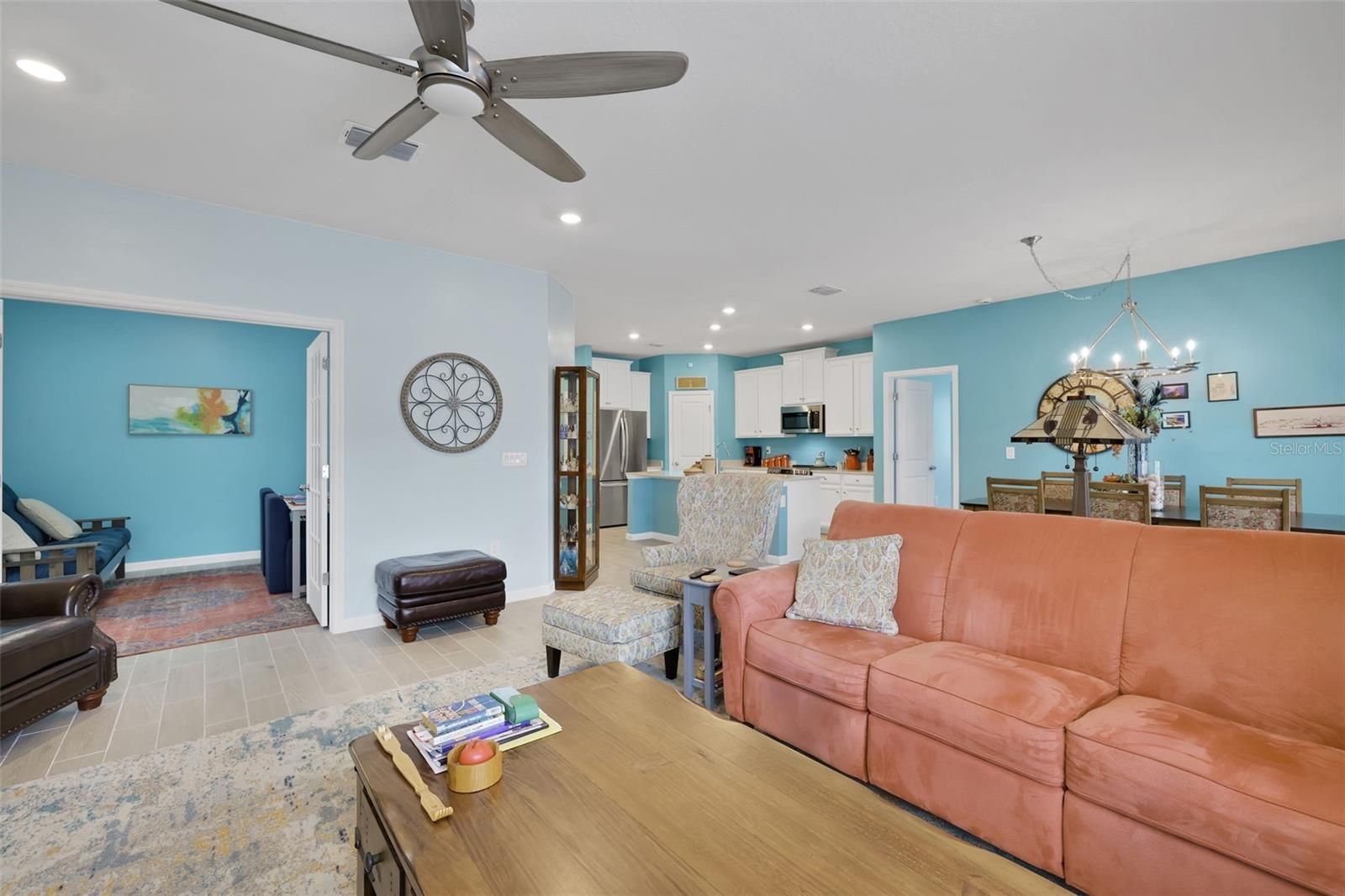 Welcome Home! This gem offers 2 bedrooms, 2 full bathrooms and a large den/office with French doors. The spacious open design is light, bright and tranquil. The kitchen features quartz countertops, a large island, stainless steel appliances, walk-in pantry and a bonus walk-in storage closet. The gathering room, kitchen and nook seamlessly flow into each other, perfect for daily enjoyment and entertainment. This Elan floor plan features split bedrooms which are spacious and inviting. Each room offers ample closet space, with the primary having a walk-in closet. The two-car garage with epoxy flooring is spacious and practical. The monkey bar storage system helps keep everything organized and off of the floor. Situated on a corner lot with a vinyl fence, there is plenty of green space to enjoy. To maximize your enjoyment of the Florida lifestyle, there is a heated, saltwater pool with enclosed lanai. Liberty Village is an attractive and desirable 55+ community, located in Ocala. The community features a pool, pickle ball court, bocce ball and shuffle board. Monthly fee includes Spectrum Cable and Internet. The prime community location is near shopping and dining, medical facilities, local parks and provides easy access to many of the areas sought after attractions and entertainment. So much to love about this home and community. We invite you to schedule your showing today.
